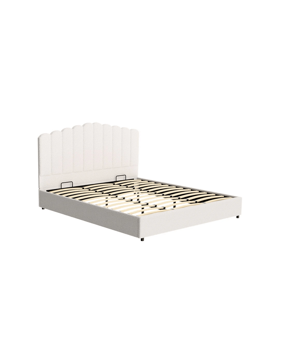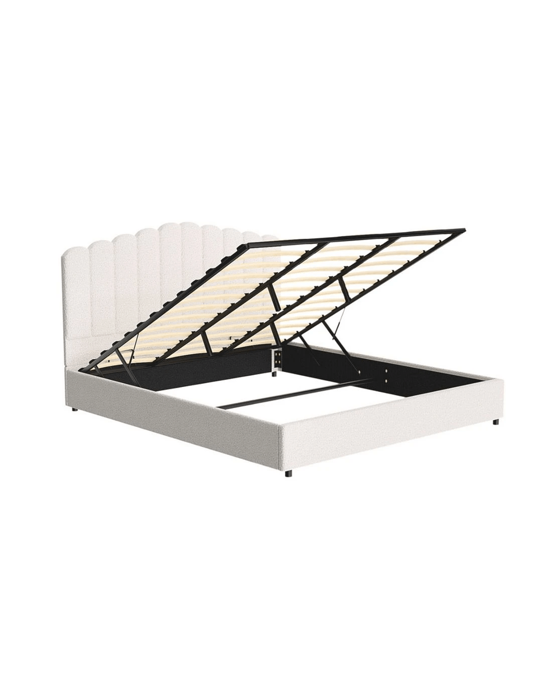 Introducing our elegant Artiss bed frame: upholstered in boucle fabric, featuring a gas lift storage mechanism, wooden frame with slat support, padded headboard, smooth edge finish, and sturdy metal connectors for a blend of style and functionality in your bedroom.
