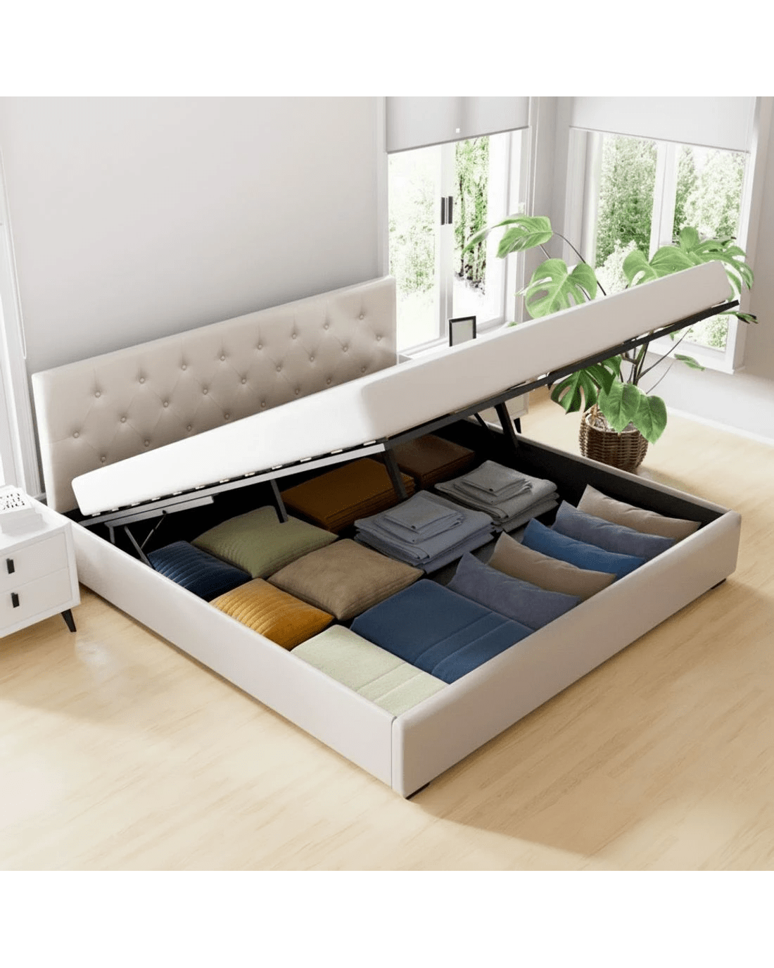 Enhance your bedroom with the Artiss Vila Gas Lift Bed Frame. Upholstered in linen fabric, the tufted headboard and sides showcase the sleek design. Beneath the exterior lies a hidden surprise – a spacious storage compartment accessed easily with the gas lift mechanism. The wooden arched slat base flexes to distribute weight evenly, minimising motion transfer for uninterrupted sleep. Reinforced with steel bars, heavy-duty metal connectors, and an adjustable centre support beam, this bed frame offers exceptional support and stability.