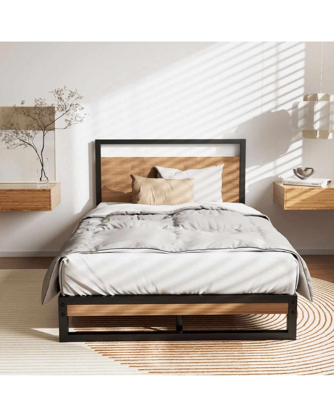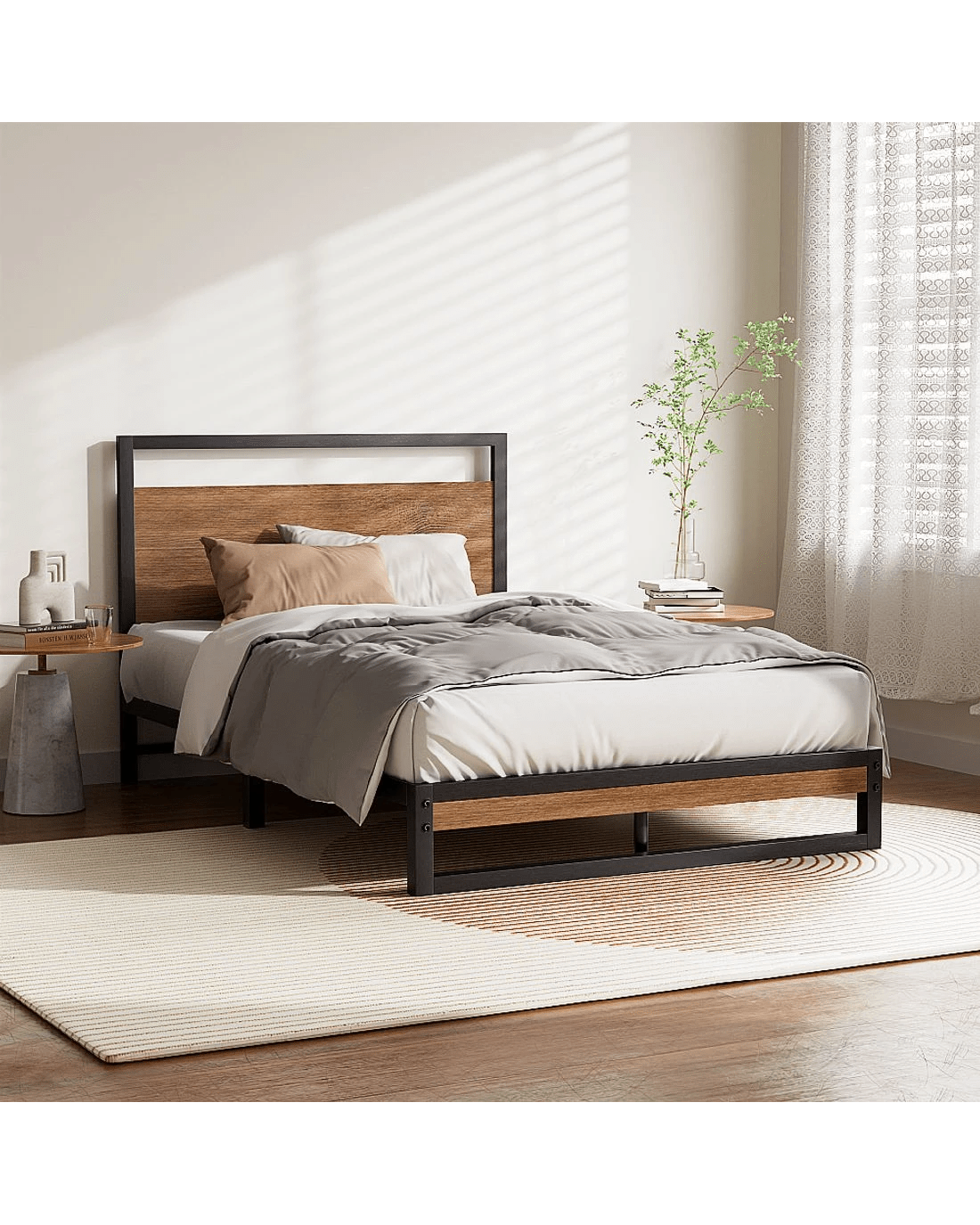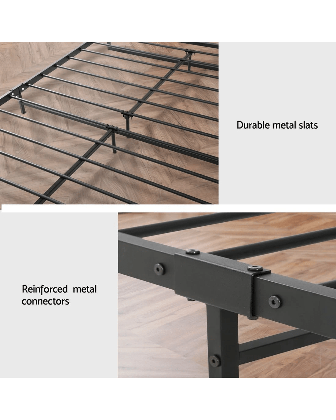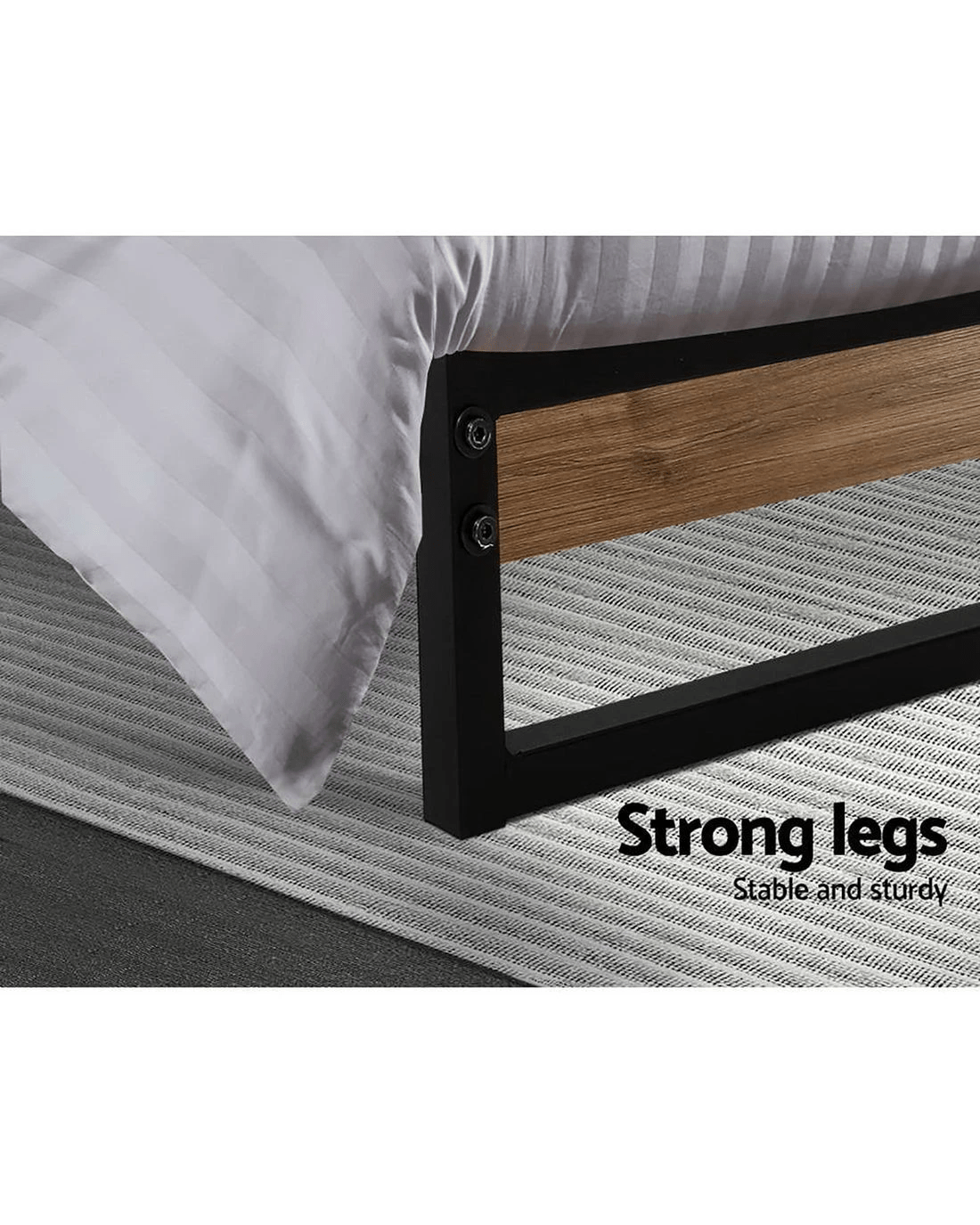 Metal and wood in perfect harmony. Our Dane Bed Frame is truly a stylish addition to any bedroom. Simple in design, the bed frame is meticulously constructed in sturdy steel and 15mm thick MDF with PVC for durability and strength. The sleek black powder-coated steel and dark wood accents lend real industrial cred to your bedroom for some standout décor. Across the frame, evenly spaced slats provide good weight distribution as well as ensuring that the mattress stays in place even with every twist and turn of your sleep. The central support beam further steadies the bed under robust use. Designed to fit standard size mattresses effortlessly, our eclectic bed frame is guaranteed to give you pleasant dreams with every sleep.