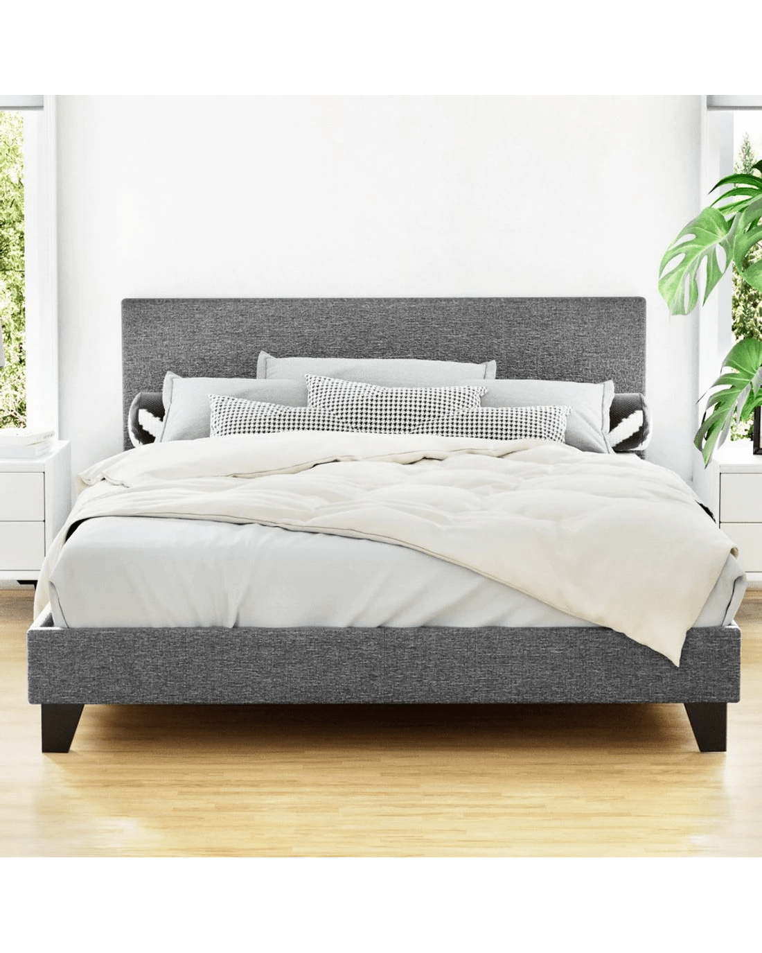Give your bed a touch of modernistic appeal with our Artiss Neo Bed Frame. Wrapped in premium faux linen fabric, the bed frame is at once smooth to the touch and luxurious all round. The bedhead provides ample space for a relaxing back rest when you need to sit up on the bed to read, surf the net or catch a movie on your device. You will surely appreciate the high-density foam that fills the bedhead and every other inch of the bed frame for a well-padded look and feel. Within the frame, a highly flexible wooden arched slat base allows the bed to flex properly so that a person who lies on the bed can move around without unduly disturbing the other. Not least, the sturdy wooden frame is also held together by heavy-duty metal connectors so that you never have to worry about the stability or durability of the bed frame. If elegant sleep is what you after, look no further than the Artiss Neo Bed Frame to make your dreams come true.