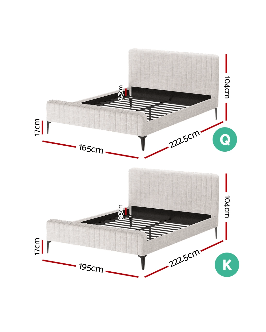 Add a touch of cosiness to your bedroom with our Artiss AMMY Bed Frame. Wrapped in premium faux linen fabric, the bed frame is aesthetically pleasing and extremely pleasant and smooth to the touch. The non-woven fabric is incredibly breathable to prevent moisture and bacteria build-up. The gorgeous cream shade enables you to style it in any bedroom, and it'll seamlessly blend into your home decor. The bed frame comes attached with a textured bed head and matching bed foot for a cohesive aesthetic. It has high-density foam padding, which makes it a cosy spot to sit back and relax, watch a movie, or read a book. Furthermore, the wide wooden slatted base provides a sturdy foundation and allows for proper ventilation for a fresh and dry mattress always. This bed frame has premium heavy-duty metal fixings and solid powder-coated steel legs, so you don't have to worry about stability. The bed frame is available in king and queen and fits Australian standard-size mattresses. Experience the sweetest dreams with the Artiss AMMY Bed Frame today.