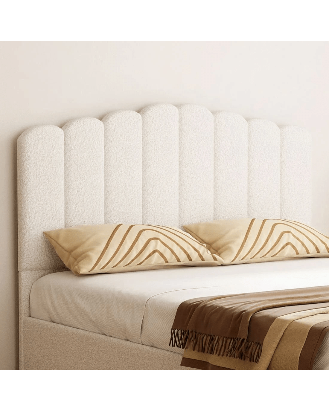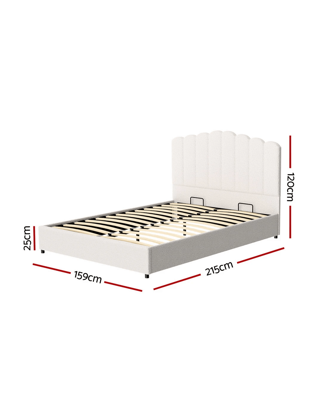 Introducing our elegant Artiss bed frame: upholstered in boucle fabric, featuring a gas lift storage mechanism, wooden frame with slat support, padded headboard, smooth edge finish, and sturdy metal connectors for a blend of style and functionality in your bedroom.