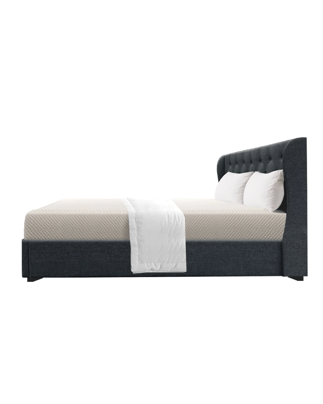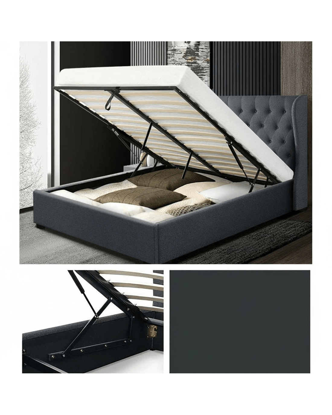 When is a bed more than a bed? When it uses a Artiss Issa Gas Lift Bed Frame. On the outside, the Issa bed frame looks like just any other quality bed frame. Beautifully padded with generous foam and covered in linen fabric. Strong steel frame with reinforced steel bars and a wooden arched slat base. Heavy-duty connectors. Raised base on legs. And a Nordic-inspired tufted headboard with a non-woven back and base. But with one easy gas lift of the bed base, the bed frame becomes an instant storage area with acres of space for your bedding essentials. Simply store your extra pillows, bed sheets, cushions and more in the storage compartment and hide them away for the season. So create more and expand your home storage capacity with just a lift of your hands with the Artiss Issa Gas Lift Bed Frame. Get yours today.