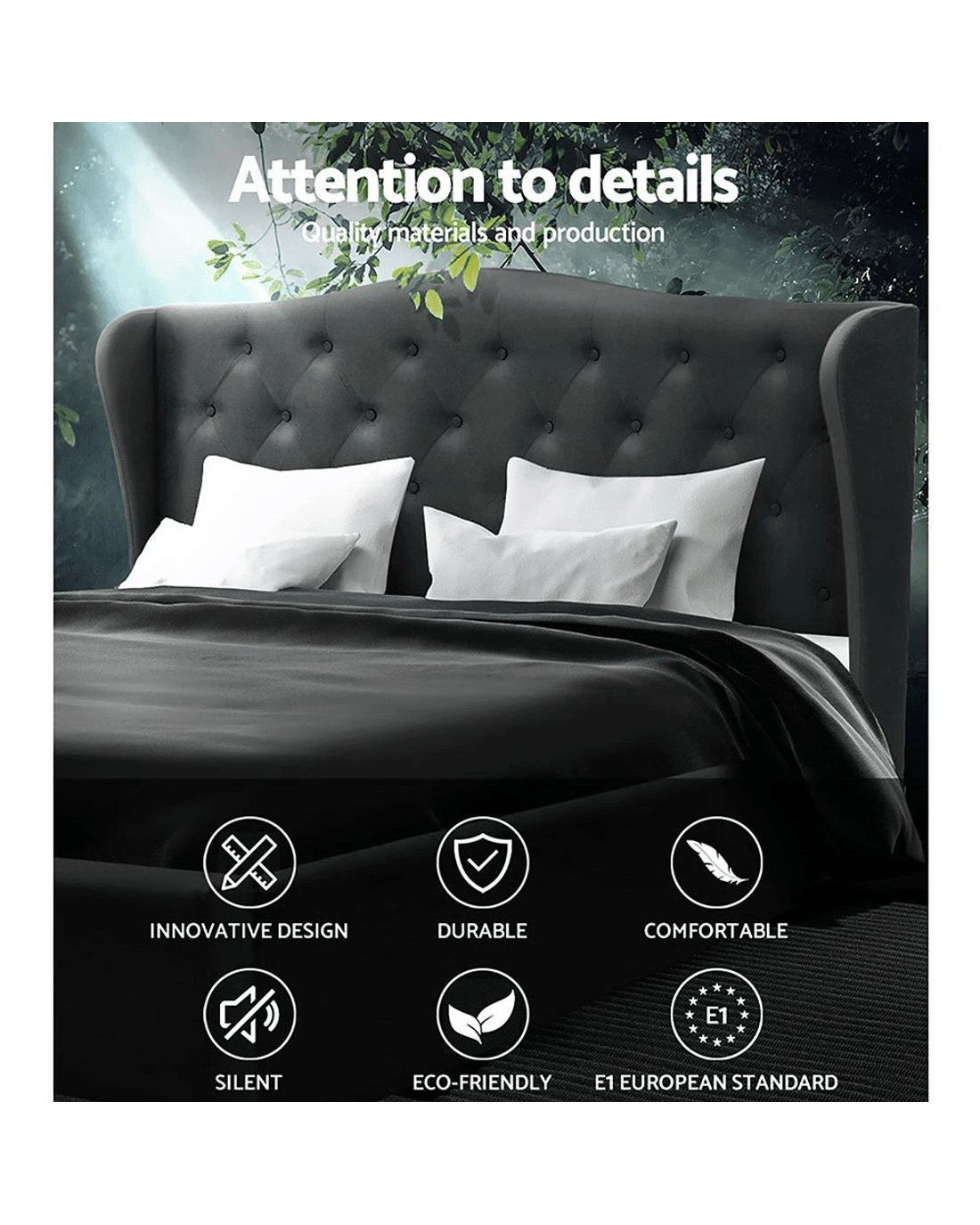 The iconic European wing headboard reflects prestigious grandeur while the tufted design complements its overall image. Padded with high density foam and upholstered in breathable non-woven linen fabric, the Pier Bed Frame is comfortable to lean on and soft to the touch.