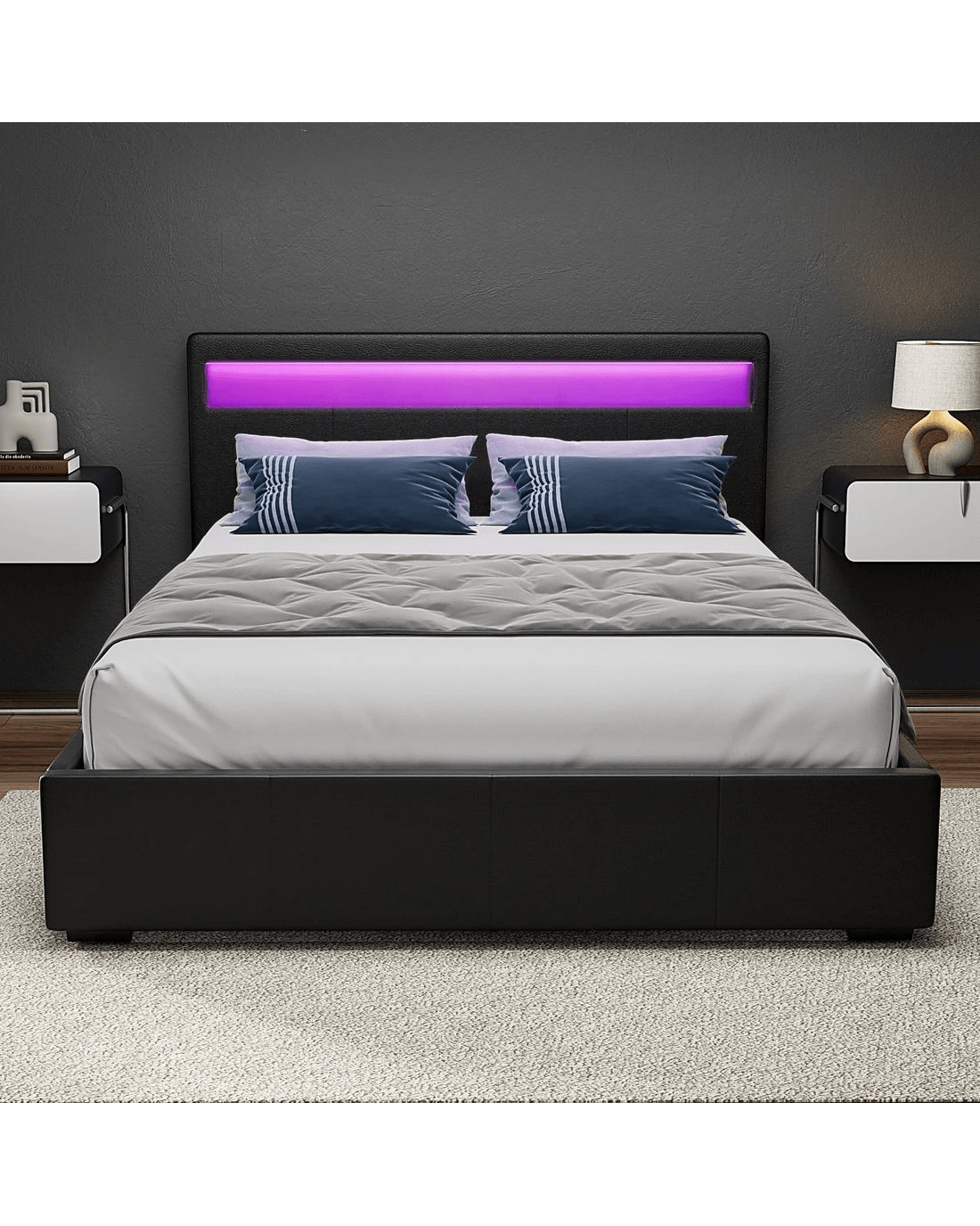 When is a bed more than a bed? When it uses our Artiss Cole Gas Lift Bed Frame. On the outside, this bed frame looks like just any other quality bed frame. Beautifully padded with generous foam and covered in PVC leather. Strong steel frame with high grade steel centre rails, heavy-duty bars and arched slat base. Large and comfortable headboard. But with one easy gas lift of the bed base, the bed frame becomes an instant storage area with acres of space for your bedding essentials. Simply store your extra pillows, bed sheets, cushions and more in the storage compartment and hide them away for the season. Even better, you no longer have to fumble in the dark for a light switch in the middle of the night with this bed frame. It comes with built-in LED lighting that can be customised into 16 different colours and 4 flashing modes to suit your preference. Not only will the illuminated bed frame create a beautiful ambience, it will also save you from buying extra bedside lamps or nightlights. So do not just get any bed frame, get this 3-in-1 bed frame to expand your home storage capacity and light up your nights with just a lift of your hands.