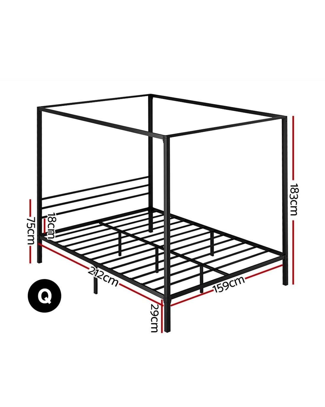 Experience modern-day opulence with the latest trending bed frame from Artiss. The Pochy Bed Frame puts a contemporary twist on a classic design that will stand the test of time. Made from heavy-duty black powder-coated steel, the bed features hard-working steel slats, a four-poster canopy and a simple, low-profile headboard. Strong centre support beams keep the frame sturdy and contribute to a generous weight capacity of 300kg. Smooth edges prevent bumps and scratches during the night. This minimalist yet luxurious bed frame can be left as is or accessorized with curtains, lights or other decor. Bring your dream bedroom to life with the contemporary Pochy Bed Frame from Artiss.