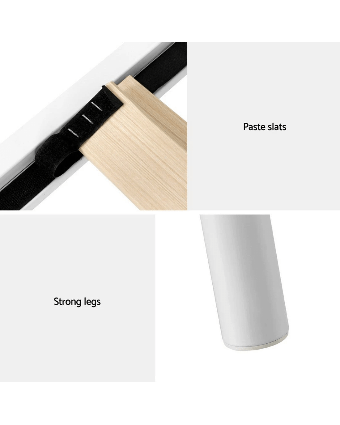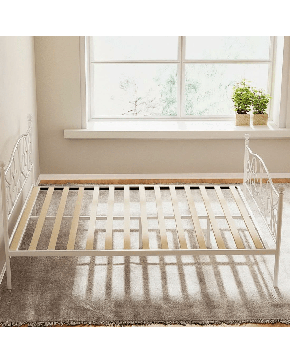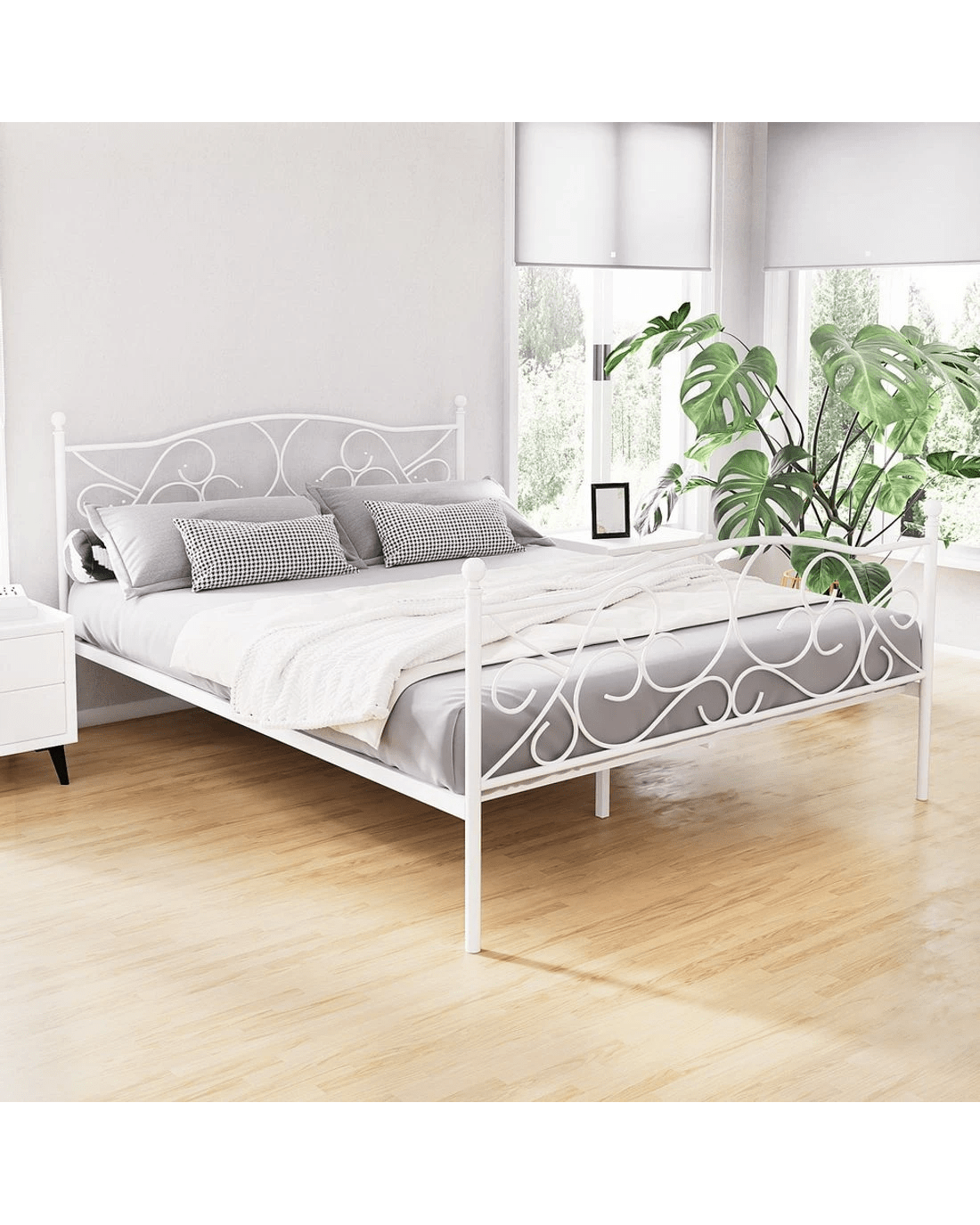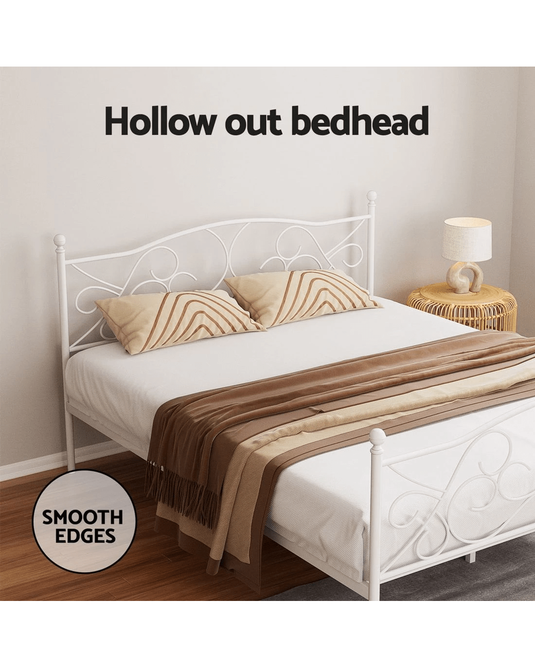 Looking for an affordable bed frame that doesn't compromise on quality or style? Look no further than the GROA Bed Frame from Artiss. This simple, Provincial style bed features an enhanced powder-coated and rust-resistant steel frame with strong and wide plywood centre slats. The sturdy steel frame offers excellent support and stability, while the smooth and sleek plywood platform keeps your mattress securely in place and well-ventilated. The glamorous hollow-out design in the headboard and footboard give the bed a lovely look with alluring appeal. It features ample space underneath to fit trundle drawers or other storage solutions, perfect for keeping your bedroom tidy. Plus, its neutral colour scheme ensures that it will complement any bedding or decor you choose to pair it with. Practical, functional and stylish, the GROA Bed Frame from Artiss is an easy purchase.
