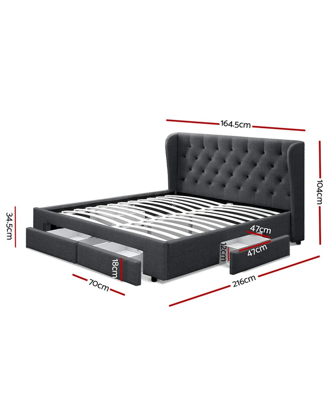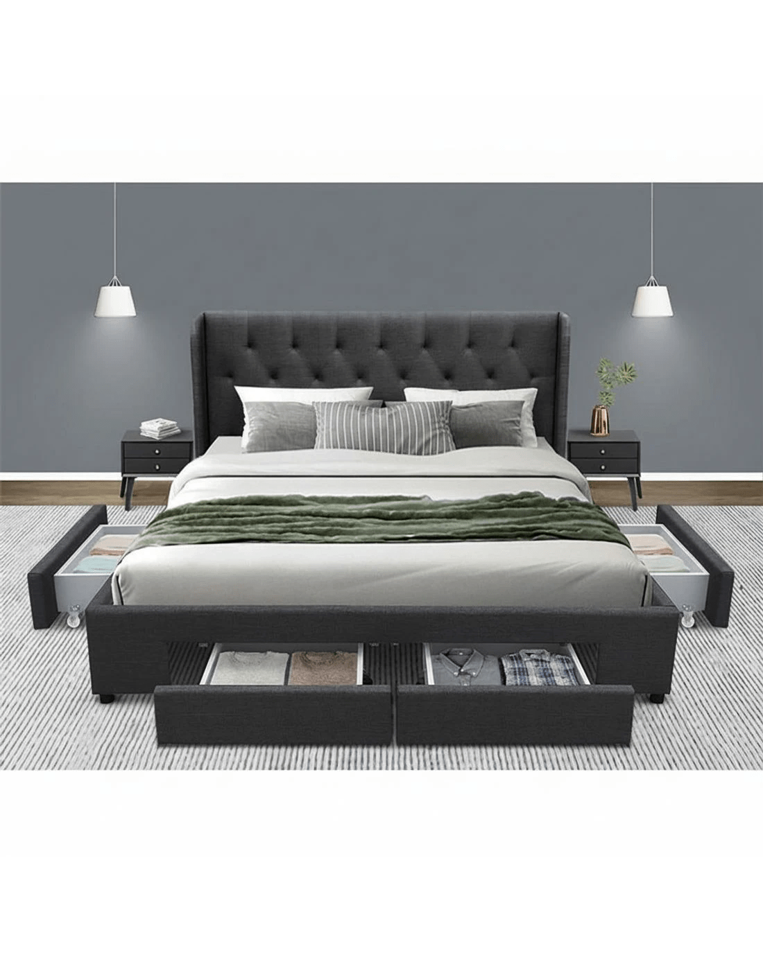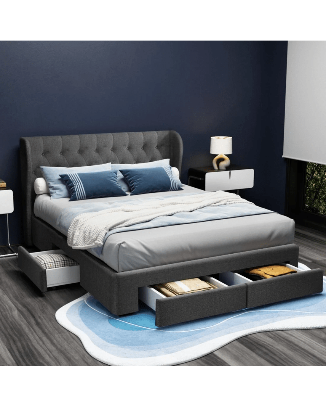 Of particular interest is the tufted headboard that really gives the Bed Frame a designer-class status. Simply oozing with elegance and sophistication in every detail. What's more, underneath the Bed Frame, you'll find four spacious drawers to store all your seasonal beddings and linen and a host of other personal essentials. No more clutter and loads of useable storage right under you. Better still, the drawers are set on wheels for easy access sliding in and out.
