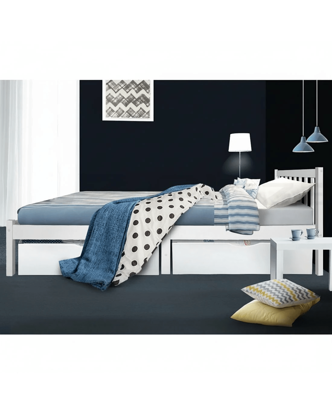 Strong and sturdy, the Bed Frame comes with a durable plywood slated base, reinforced angled brackets for long term support, stylish headboard, heavy-duty steel fixings and smooth edges all round. Finished in a non-toxic, eco-friendly white paint, the neutral-coloured Bed Frame makes for easy decoration coordination with any bedroom. Better still, the Bed Frame also has ample space below to fit in a pair of optional trundle drawers for extra storage of bedding essentials.