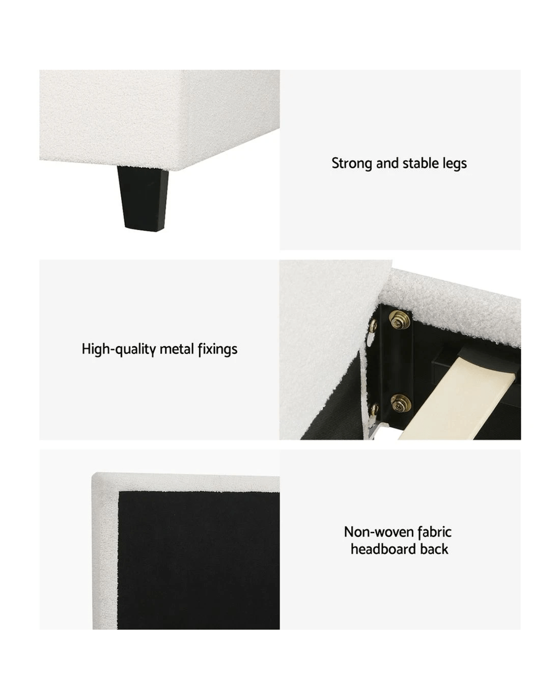 Add a touch of cosiness to your bedroom with our Artiss Neo bed frame. Wrapped in premium boucle fabric, the bed frame is aesthetically pleasing and extremely pleasant and smooth to touch. It will make you feel comfortable. The bed frame comes attached with a textured bed head. It has high-density foam padding, which makes it a cosy spot to sit back and relax, watch a movie, or read a book. Furthermore, the wooden arched slatted base allows the bed flex properly. It prevents partner disturbance. The slats are quite thick and will provide good support to your mattress. This bed frame has premium heavy-duty metal fixings and solid legs. So you don not have to worry about stability. It will keep the bed stable and prevent shaking. Additionally, this bedframe is available in single, king single, double, and queen and fits Australian standard size mattresses. And the gorgeous cream shade enables you to style it in any bedroom style. It will seamlessly blend in your home decoration.