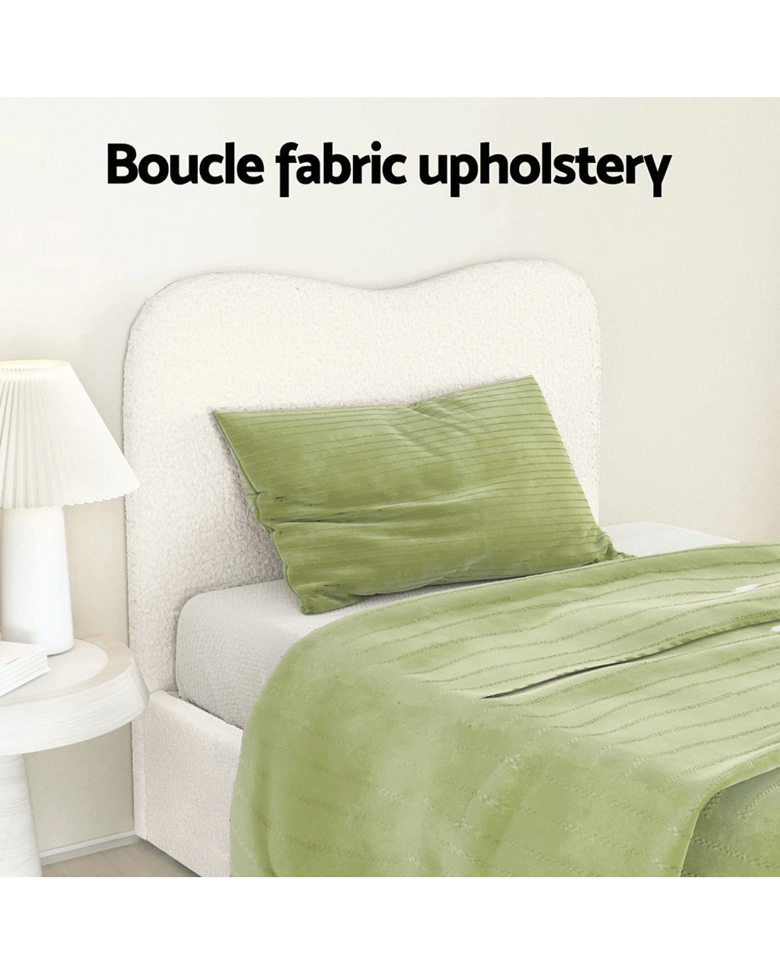 Introducing our elegant Artiss bed frame: upholstered in boucle fabric, featuring wooden frame with slat support, padded headboard, smooth edge finish, and sturdy metal connectors for a blend of style and functionality in your bedroom.