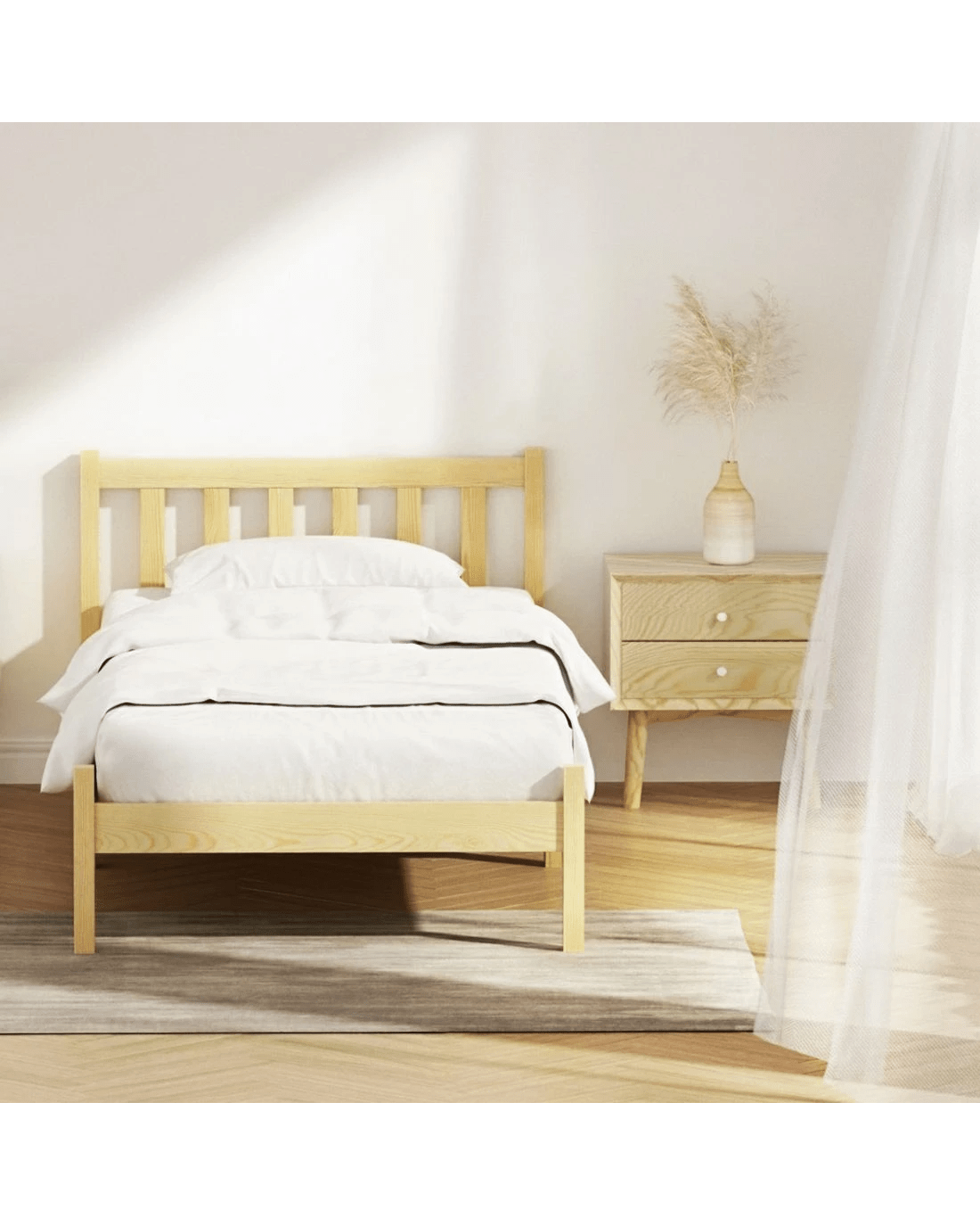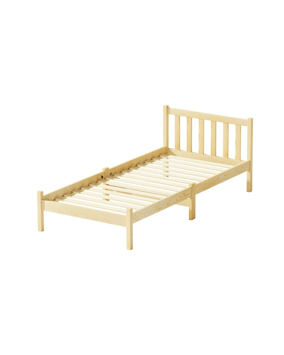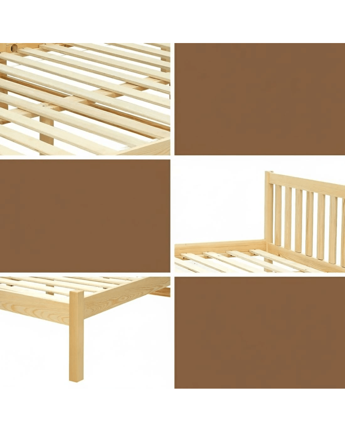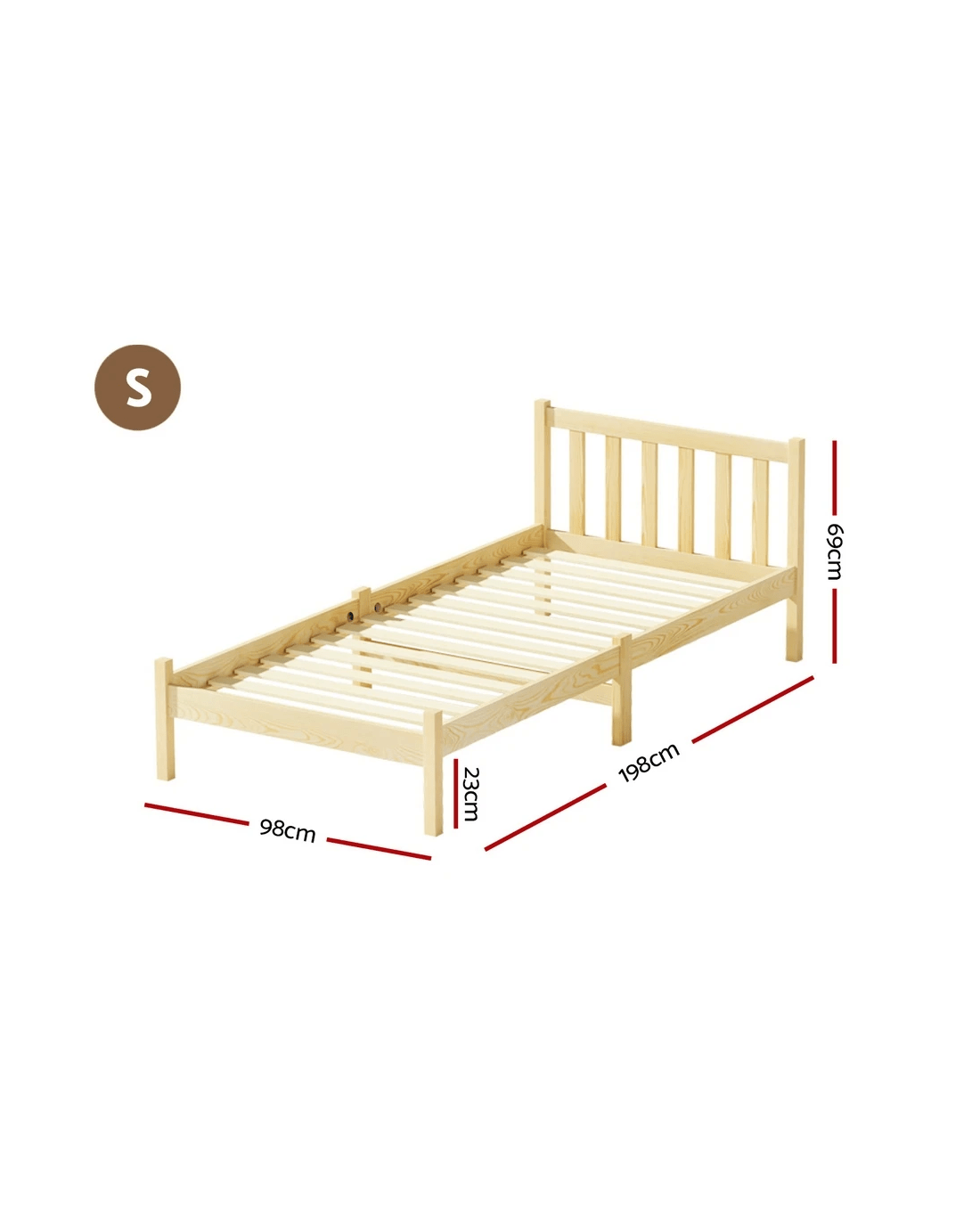 Embrace the rustic and classic wooden look with our Artiss wooden bed frames. Featuring minimalist design, they're sure to enhance your bedroom ambience and add style to your bedroom. With its natural material, steel hardware, and elegant design, our wooden bed frame takes its cue from rustic and classic style. The natural oak shade will ensure it complements various bedroom styles, from rustic to classic, Scandinavian, and Boho styles. Our wooden bed frame is crafted from solid pine wood for ultimate strength, durability, and longlasting use. It has strong legs for stability and prevents shaking when you twist and roll in bed. Our wooden bed frame features excellent craftsmanship with great attention to details. It has a headboard with good height for your comfort, and thick plywood slatted base ensures proper airflow and good ventilation. The use of non-toxic paint finish ensures safety and peace of mind, and the heavy-duty steel fixings with reinforced bracket support ensures superb stability and sturdiness. Our wooden bed frame offers extra storage space underneath to store your bedding essentials or hide away kids' toys. Bring home our Artiss wooden bed frame today.