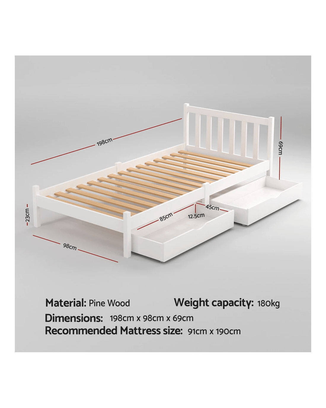 Strong and sturdy, the Bed Frame comes with a durable plywood slated base, reinforced angled brackets for long term support, stylish headboard, heavy-duty steel fixings and smooth edges all round. Finished in a non-toxic, eco-friendly white paint, the neutral-coloured Bed Frame makes for easy décor coordination with any bedroom. Better still, The bed frame with two storage drawers provides additional space for storing bedding essentials.