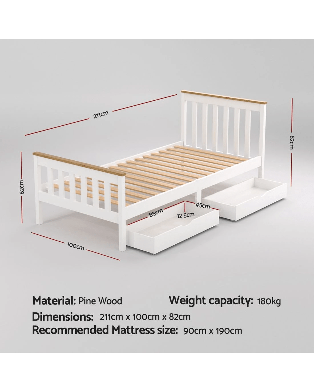 Featuring an exclusive classic design, our Pony Wooden Bed Frame is all about total simplicity with absolute practicality. Constructed of solid pine wood, the bed frame features quality plywood slats smooth finished edges, heavy-duty steel fixings and reinforced bracket support across the frame that cheaper alternatives do not provide. Not least, the two-tone colour adds an elegant and stylish look that will go well with any adult or children use.The bed frame with two storage drawers provides additional space for storing bedding essentials.