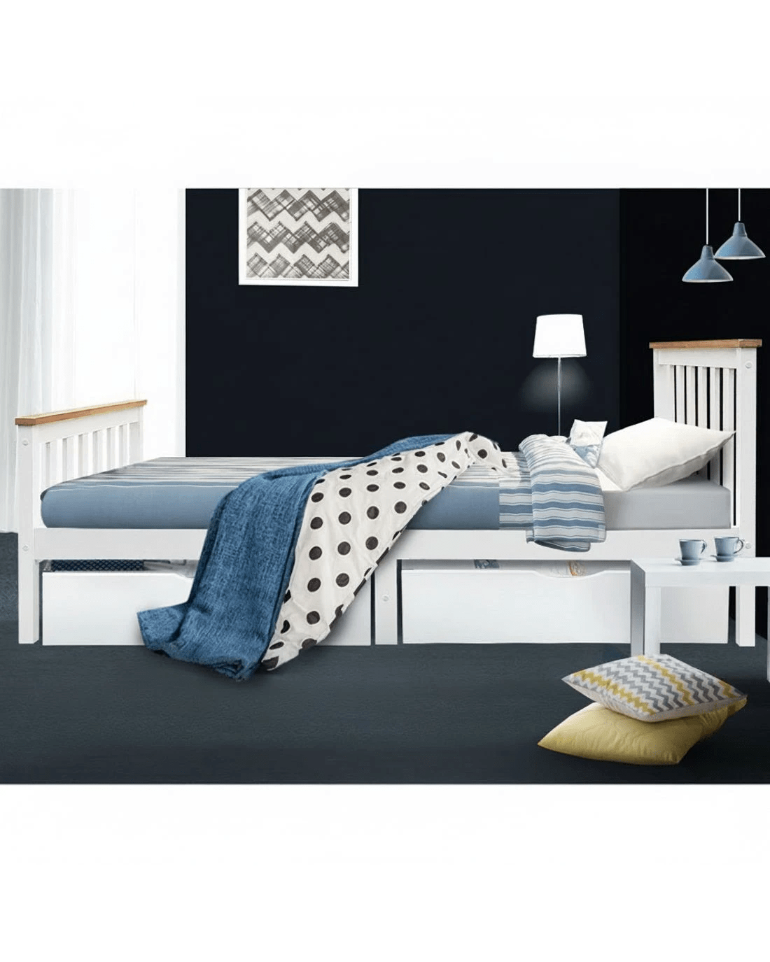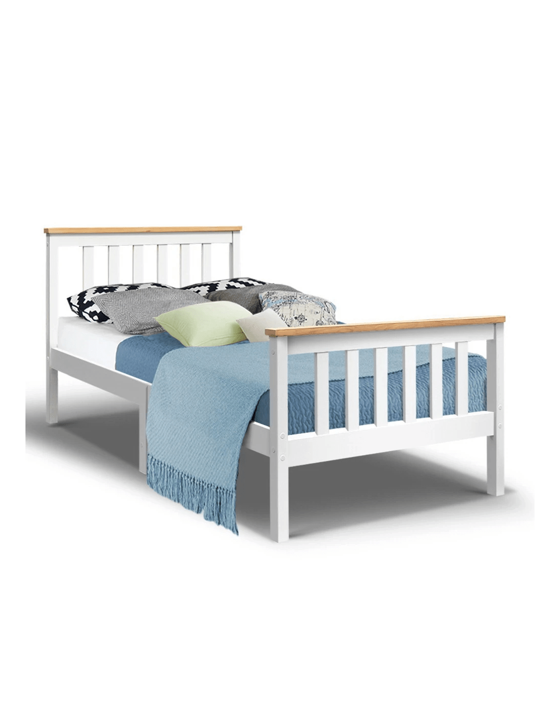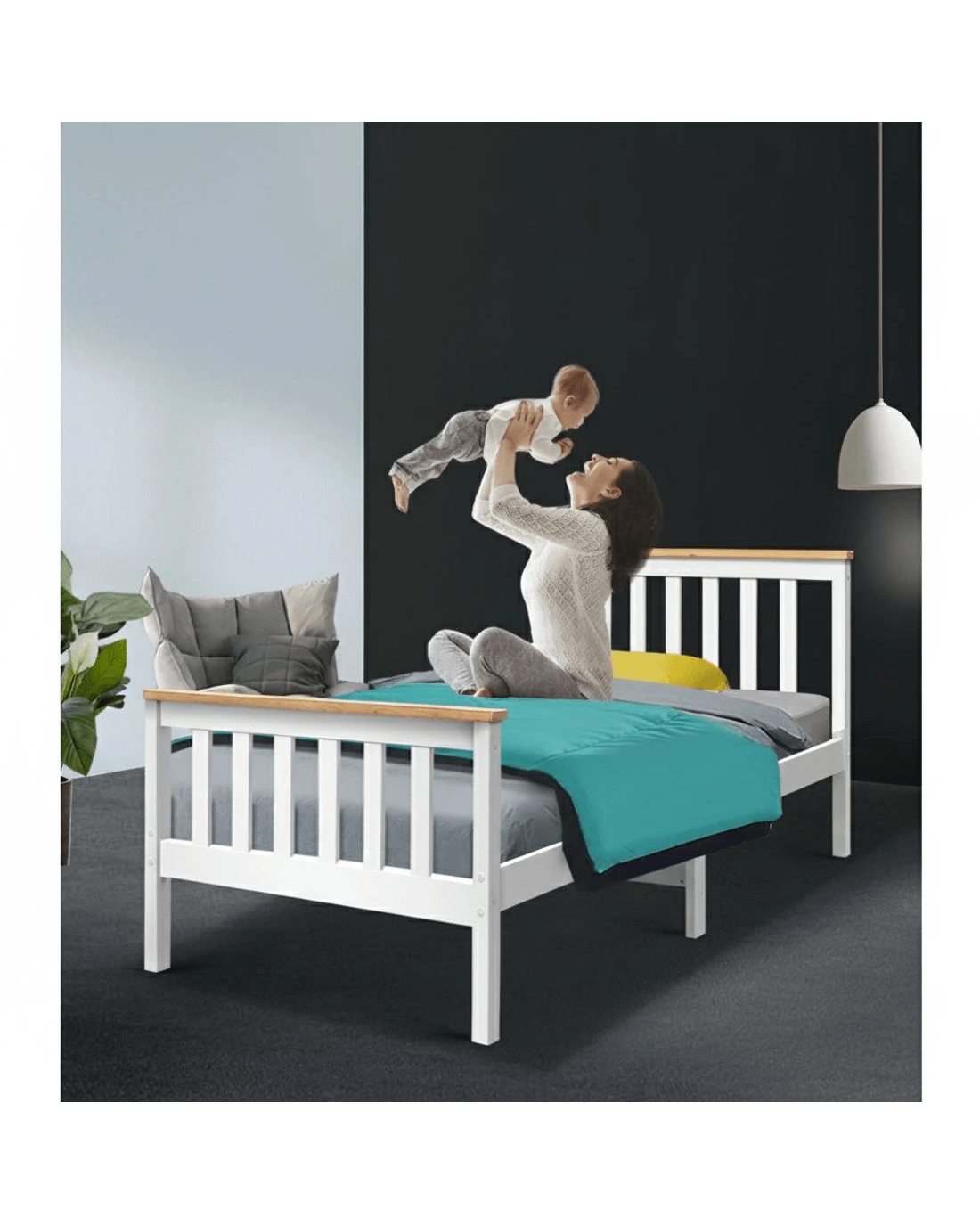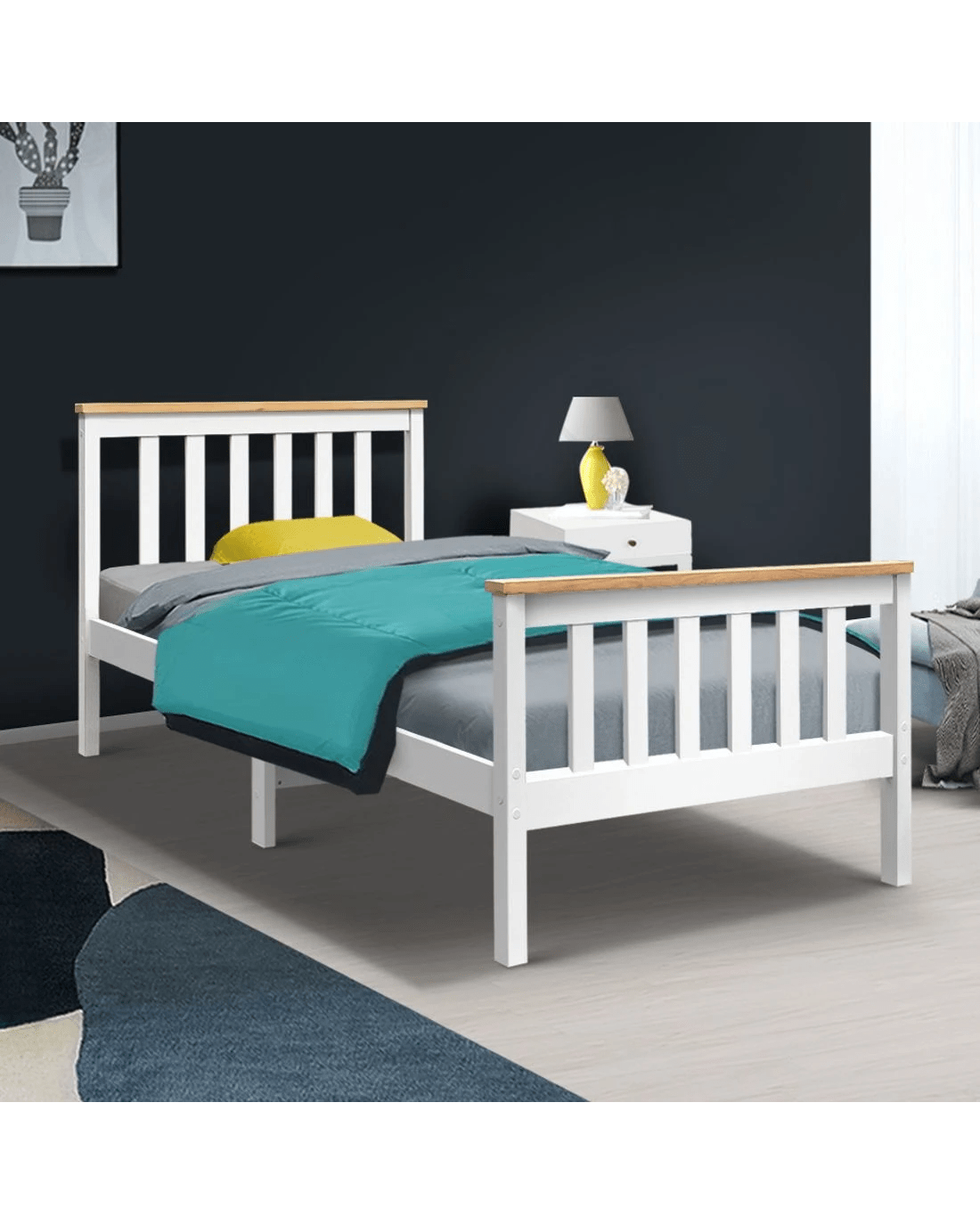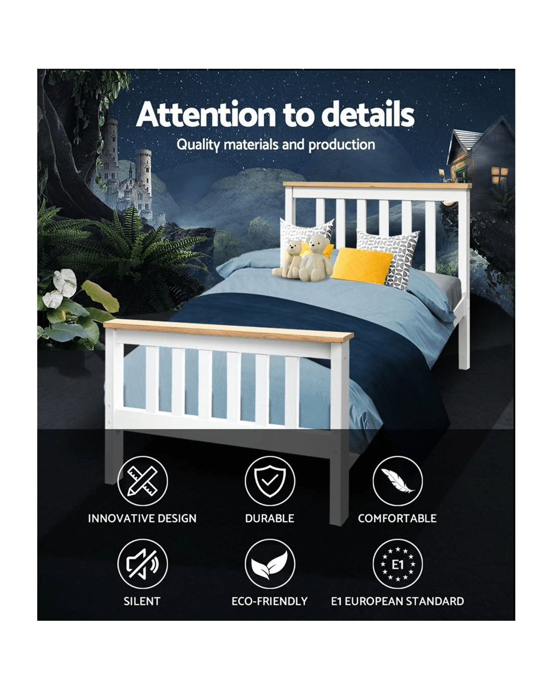 Featuring an exclusive classic design, our Pony Wooden Bed Frame is all about total simplicity with absolute practicality. Constructed of solid pine wood, the bed frame features quality plywood slats smooth finished edges, heavy-duty steel fixings and reinforced bracket support across the frame that cheaper alternatives do not provide. Not least, the two-tone colour adds an elegant and stylish look that will go well with any adult or children use.
