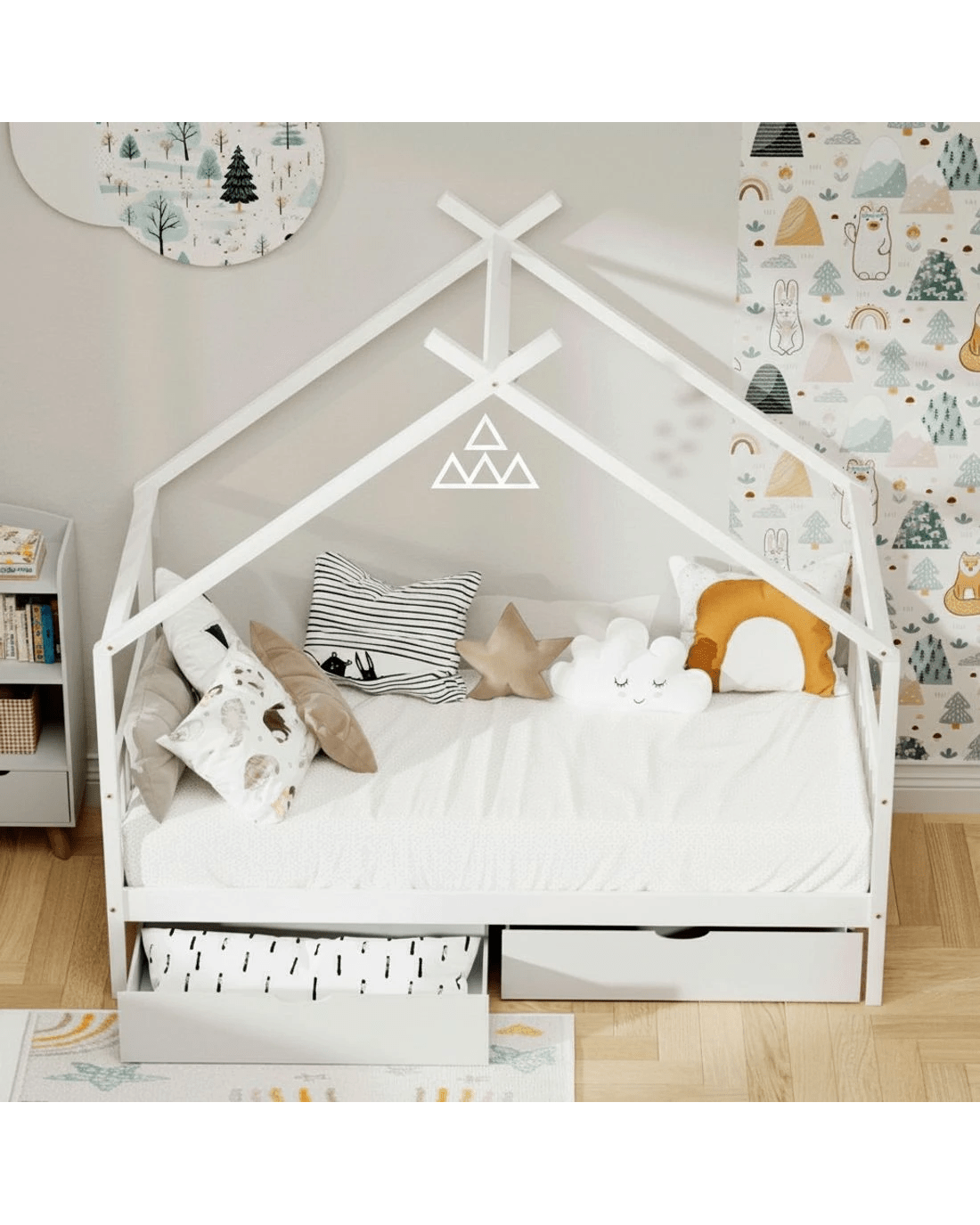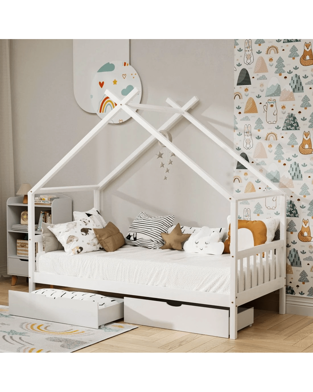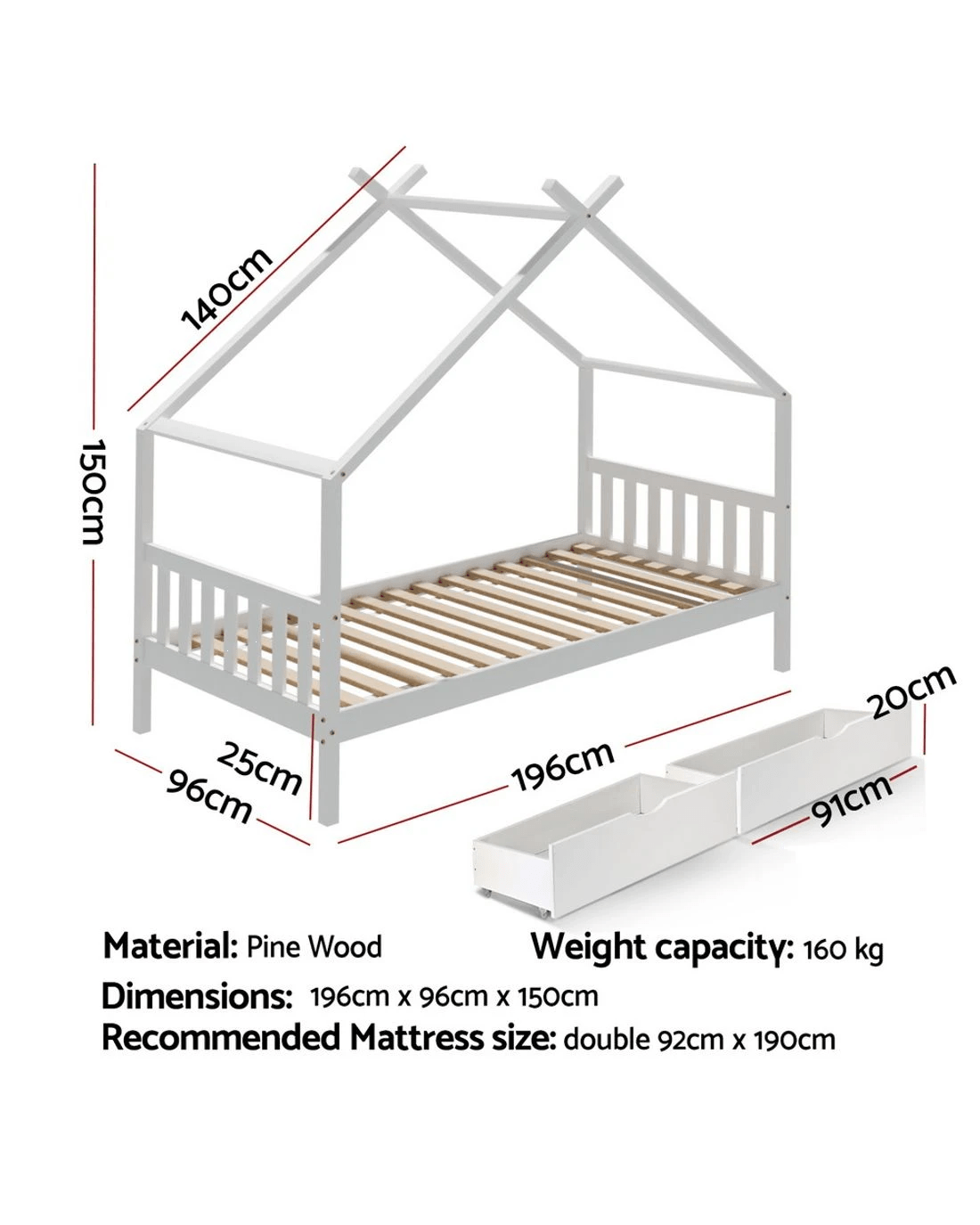 Artiss Bed Frame Wooden Base Kids Single Timber House with 2 Storage Drawers - White