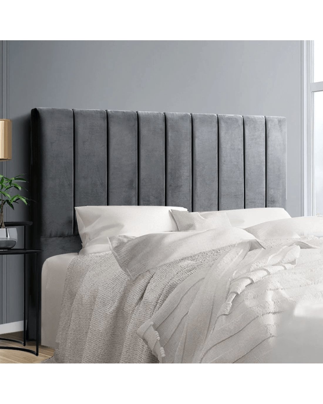Up the opulence factor and indulge in our luxurious Vela Velvet Bed Headboard. With its art deco nuances of clean vertical lines, our Velvet Bed Headboard is teeming with class and decadence.