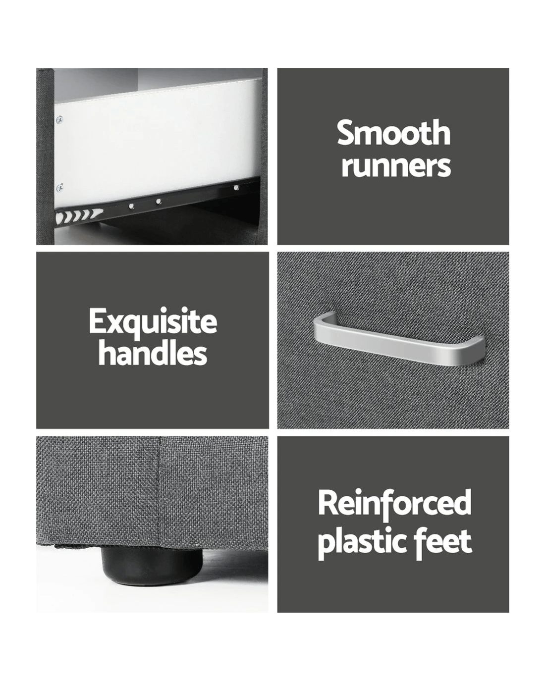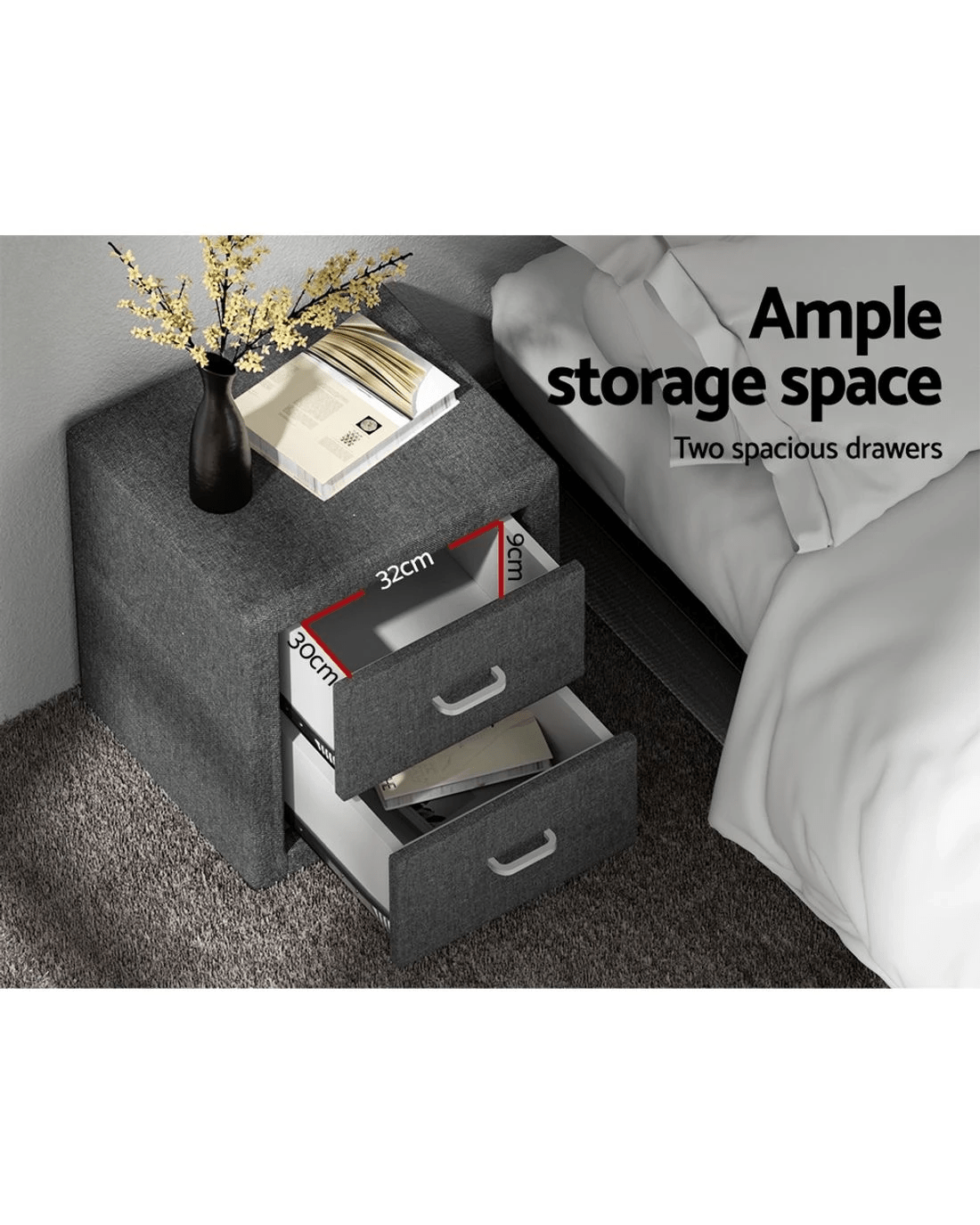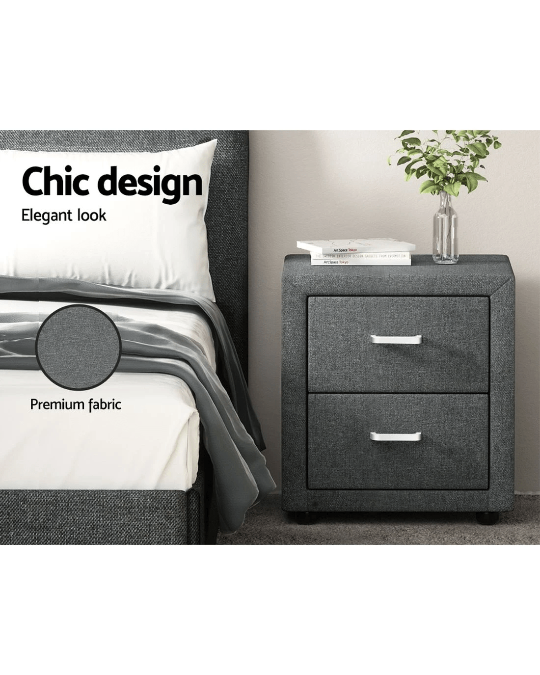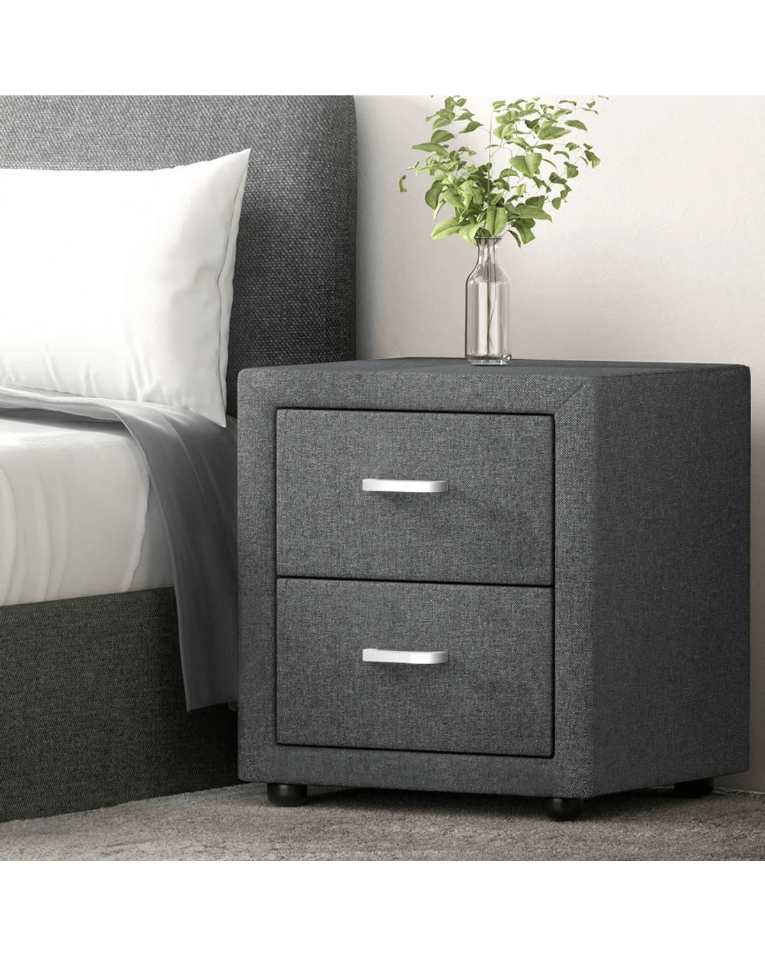 Simply designed with elegant linen fabric, this bedside table is the perfect furniture to bring a modern style to your bedroom. The practical design consists of two large drawers, plenty of space to store your personal accessories and knick knacks. It features MDF panels with anti-rust coated metal draw runners and contemporary aluminium handles. An elite in quality and design, and a perfect addition to any home interior.