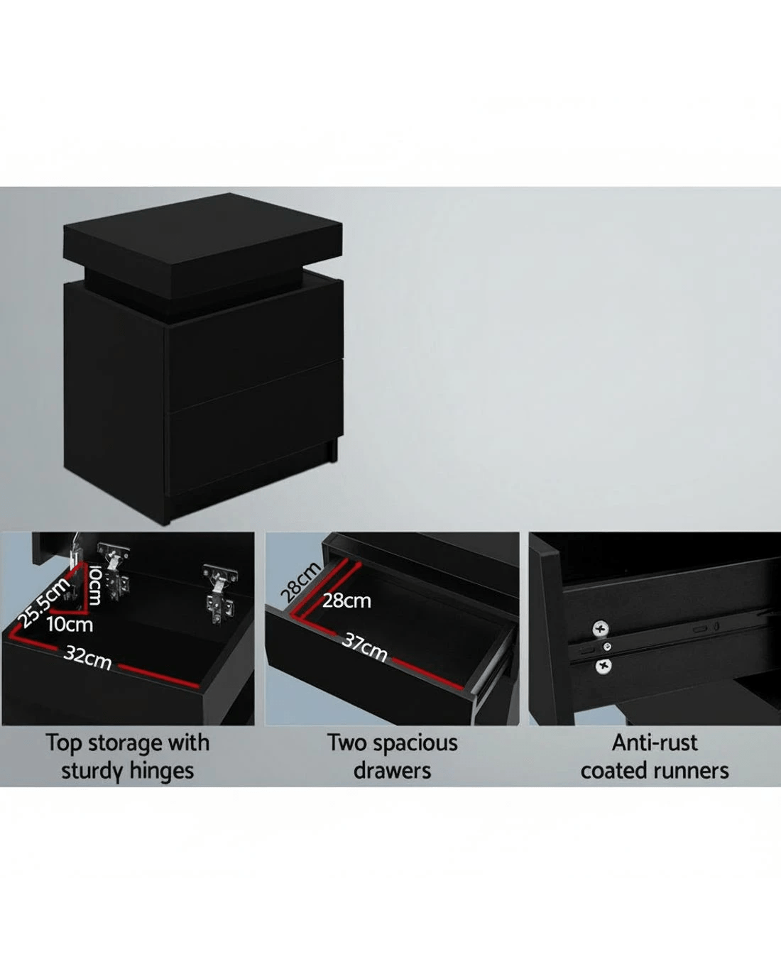 A useful bedside addition, our Artiss Bedside Table is elegant and simple with a lasting appeal. Made of 15mm thick particle board, the bedside table is sturdy and durable in every way. Two deep drawers sliding on smooth anti-rust runners provide ample storage space. There is also a top storage compartment that opens with a lift-up lid like a treasure trunk, which you can fittingly fill with your own personal treasures. Better still, the handle-free design gives it a modern vibe that stands out from the mundane. Not least, the smooth melamine finish is impeccable and easy to maintain and clean. Too good to be used only in the bedroom? Well, you can also use the bedside table as a side table with drawers to complement your contemporary home decor.