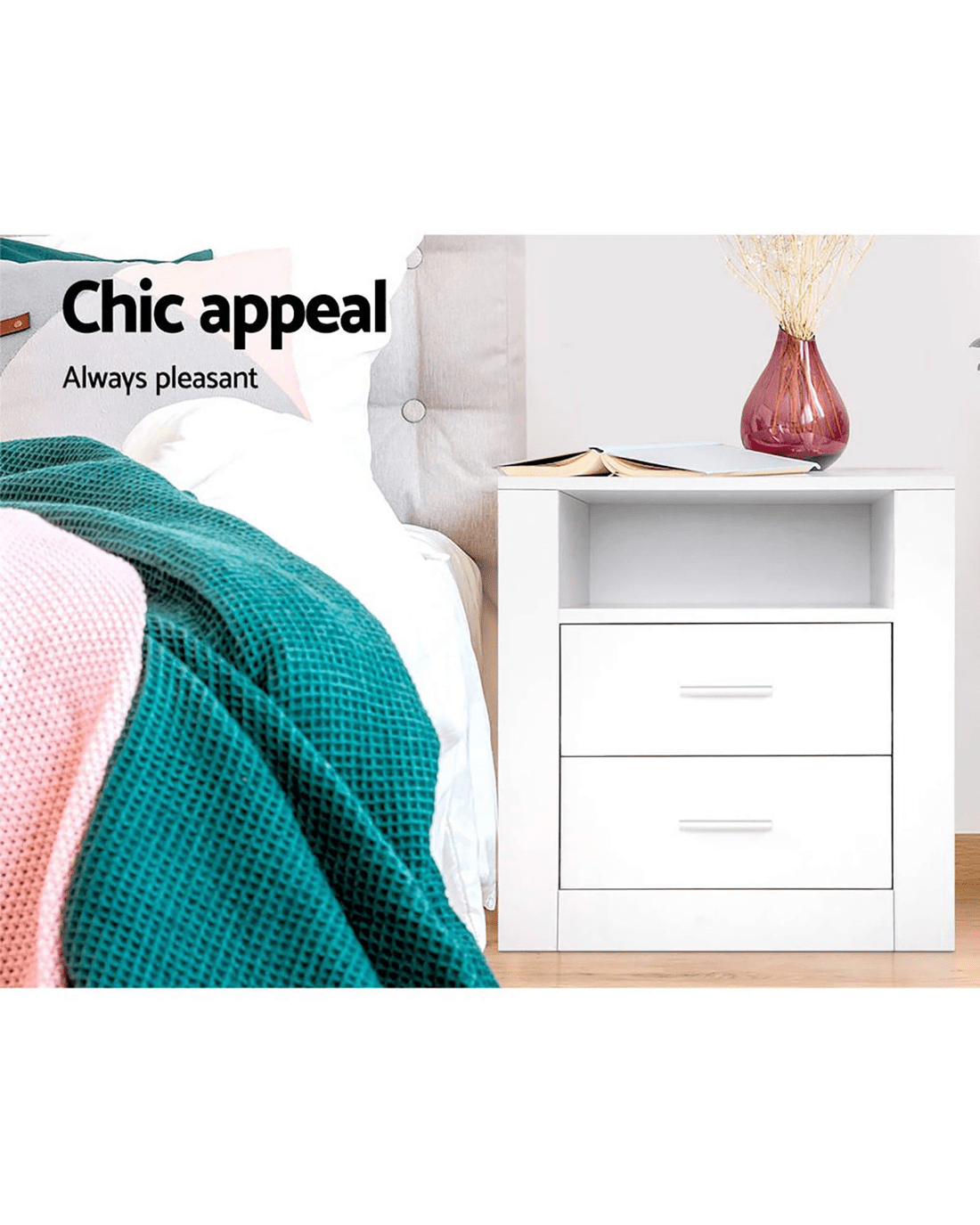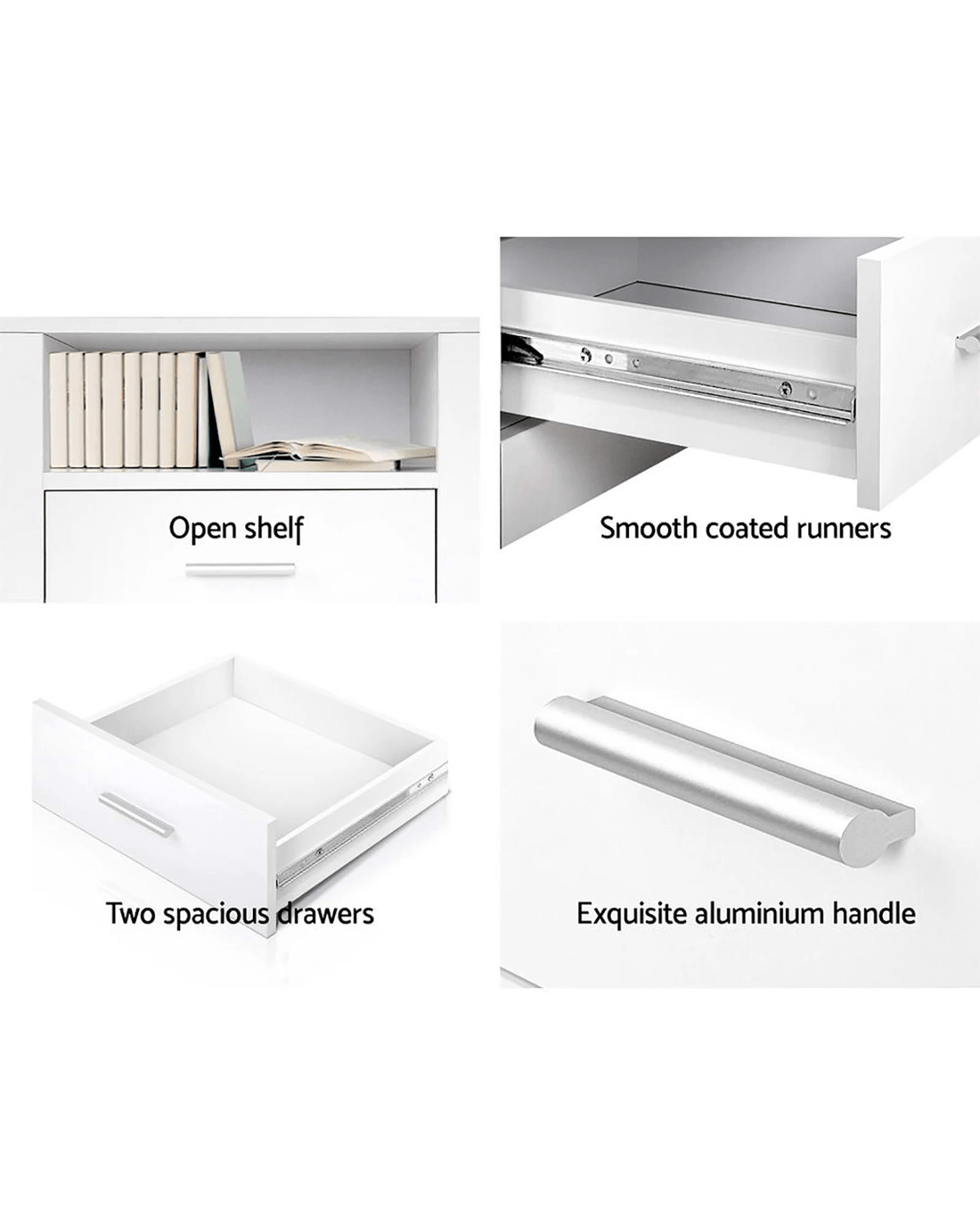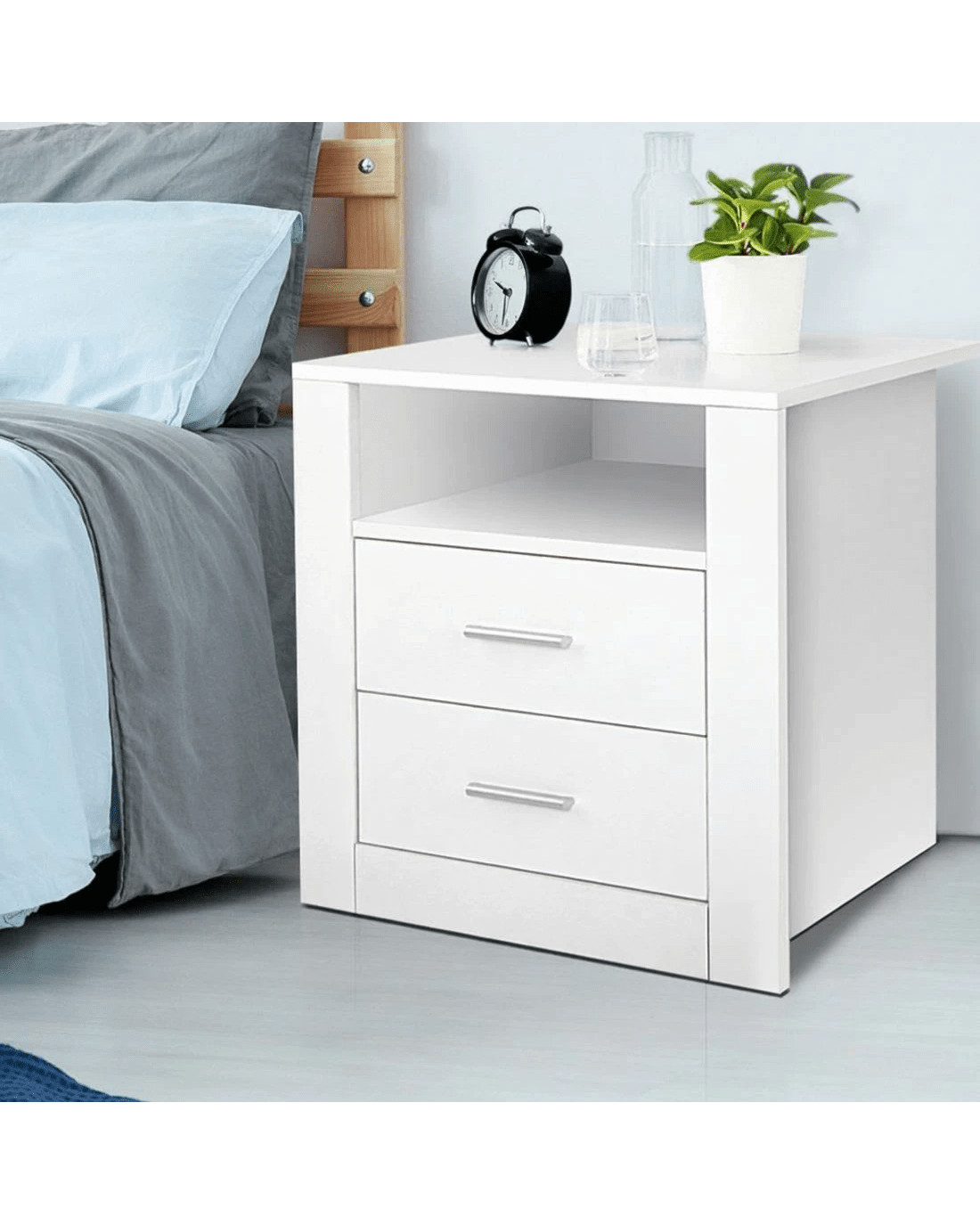 People sometimes wonder why they need a bedside table. The answer is simply because a good bedside table is extra storage space for your personal essentials, a spot for your table lamp, and of course, a place for your cuppa. And not least, a perfect companion to your bed. Our modern and stylish Artiss Bedside Table features a sleek melamine finish with elegant aluminium handles to complete the look. Crafted from 15mm thick particle board, the bedside table is solidly constructed and equipped with quality components like high-quality drawer runners and reinforced base. Not least, ample storage space is found with one open shelf and two drawers for all your bedside or personal essentials. Too good to be used only in the bedroom? Well, you can also use the bedside table as a side table with storage to complement your contemporary home decor.