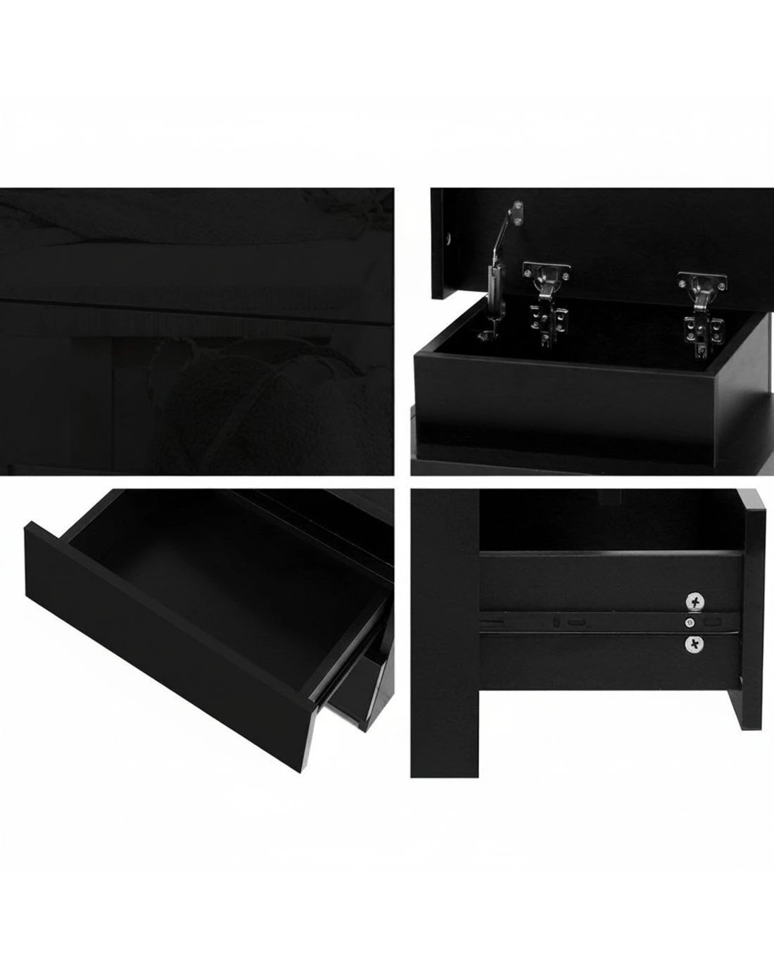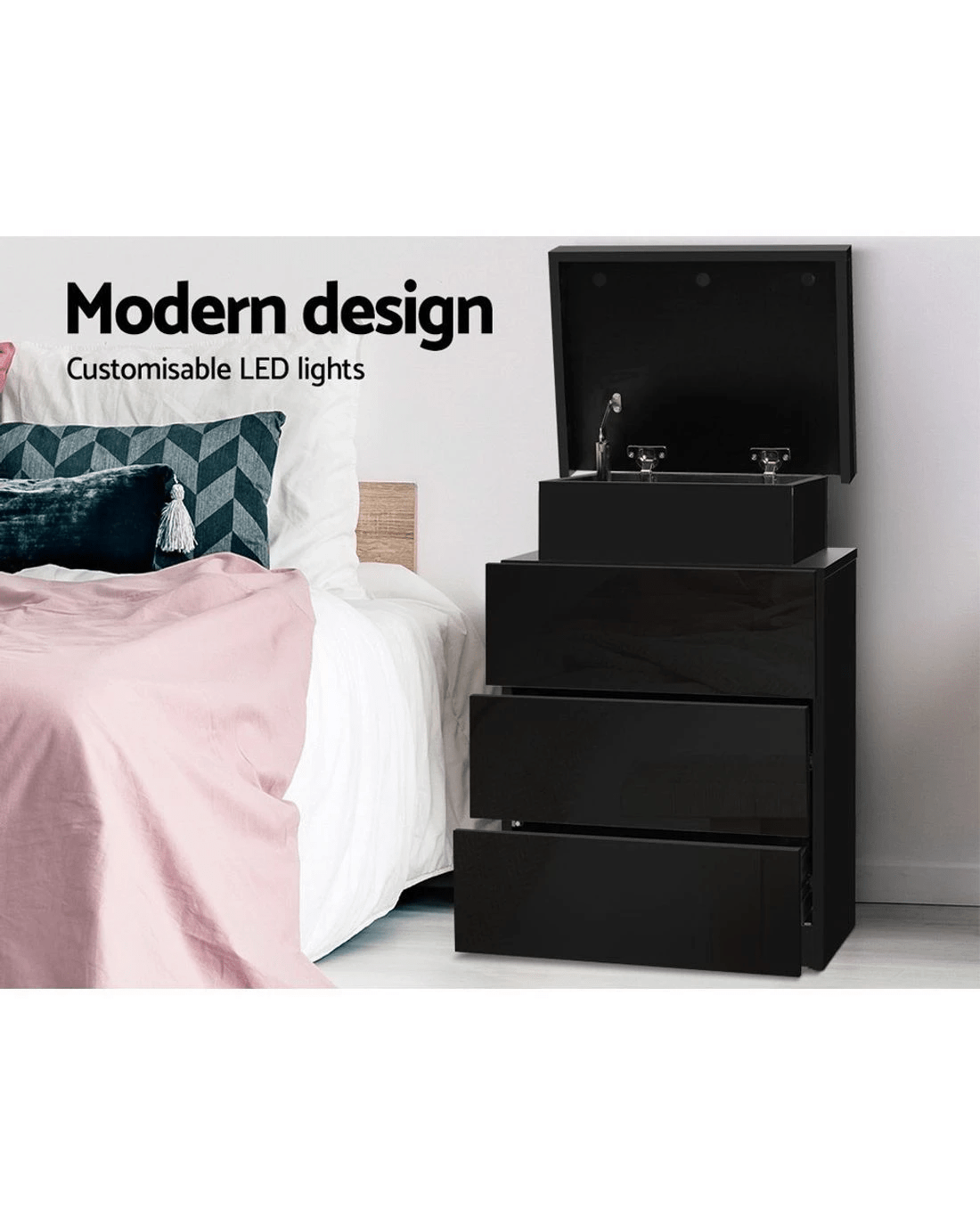 Tired of fumbling in the dark for a light switch in the middle of the night? With our Artiss LED Bedside Table, your problems are solved. The bedside table comes with built-in LED lighting that can be customised into 16 different colours to suit your preference. Not only will it create a beautiful ambience, it will also save you from buying extra bedside lamps or nightlights. Three deep drawers sliding on smooth anti-rust runners provide ample storage space. There is also a top storage compartment that opens with a lift-up lid like a treasure trunk, which you can fittingly fill with your own personal treasures. Better still, the handle-free design gives it a modern vibe that stands out from the mundane. Constructed from quality particle board and MDF with melamine finish and high-gloss UV front, the bedside table is durable and easy to maintain. And it will be the perfect addition to your modern bedroom with its contemporary and linear design. Or you can keep one in the living room to wow all your houseguests.