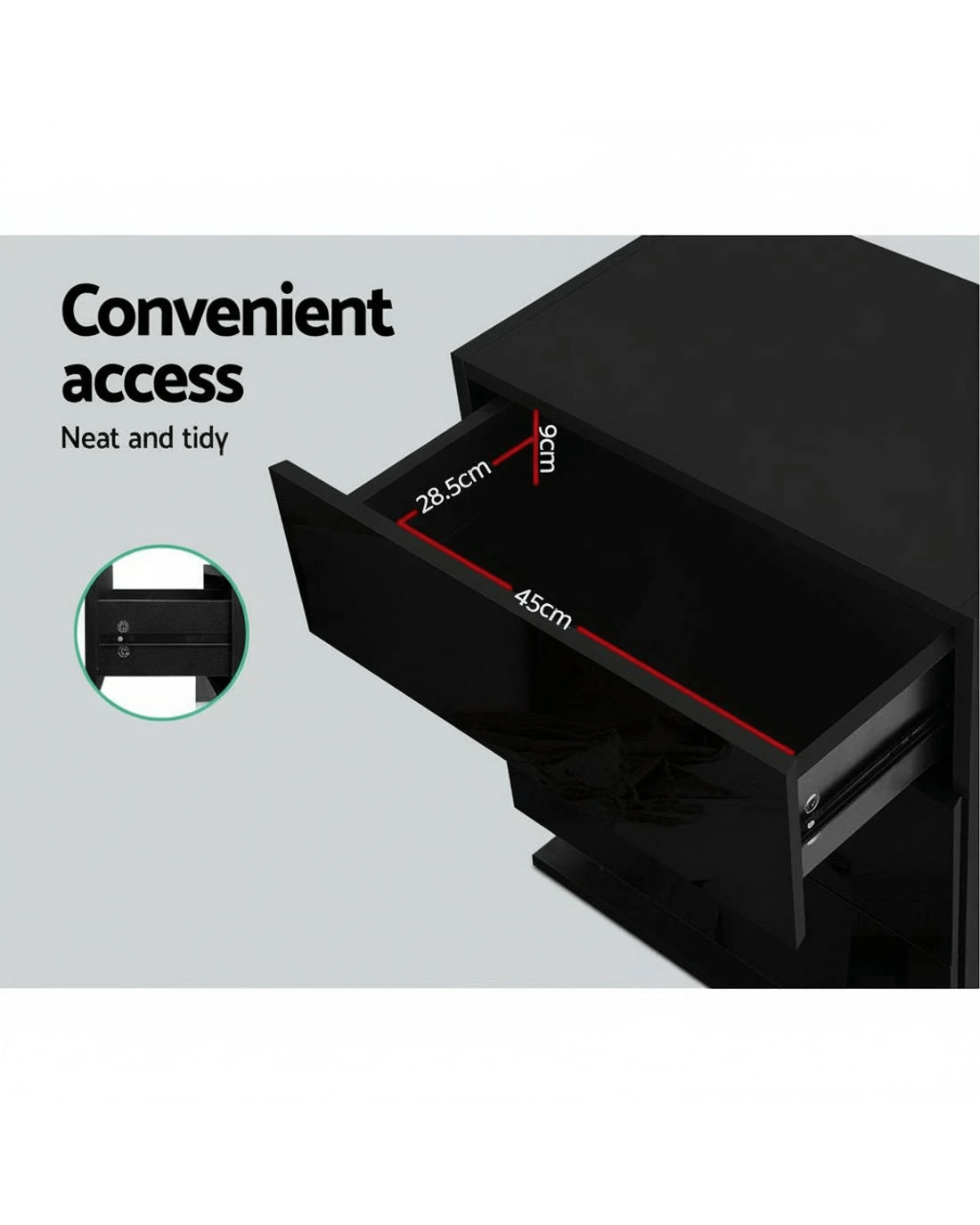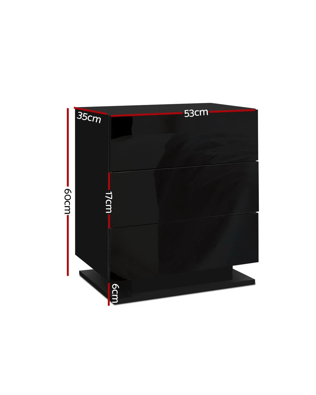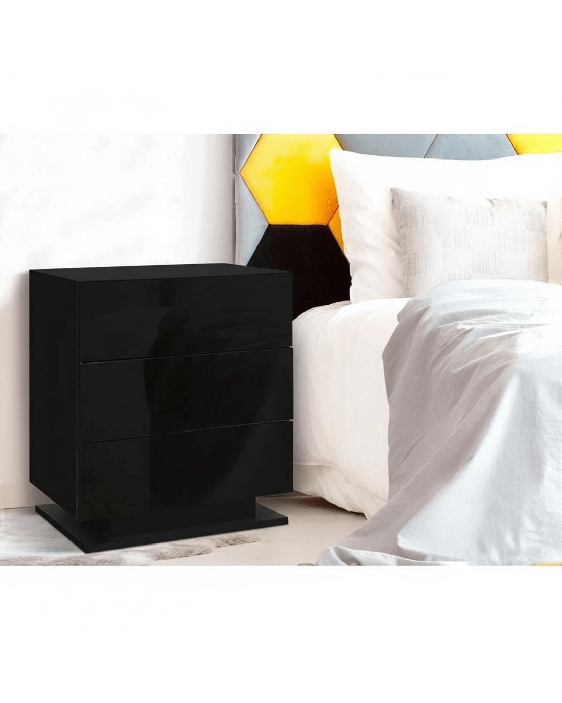 Tired of fumbling in the dark for a light switch in the middle of the night? With our Artiss LED Bedside Table, your problems are solved. The bedside table comes with built-in LED lighting that can be customised into 16 different colours and 4 different effects to suit your preference. Not only will it create a beautiful ambience, it will also save you from buying extra bedside lamps or nightlights. Three deep drawers sliding on smooth coated runners provide ample storage space. Better still, the handle-free design gives it a modern vibe that stands out from the mundane. Constructed from quality particle board and MDF with melamine finish and high-gloss UV front, the bedside table is durable and easy to maintain. And it will be the perfect addition to your modern bedroom with its contemporary and linear design. Or you can even keep one in the living room to wow all your houseguests.