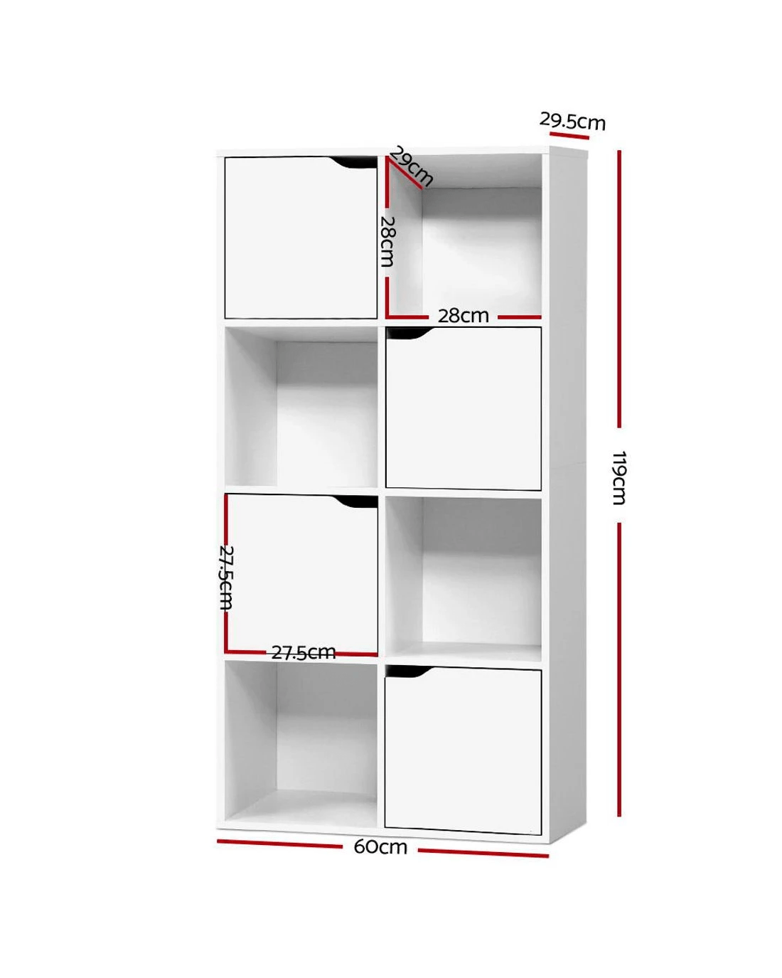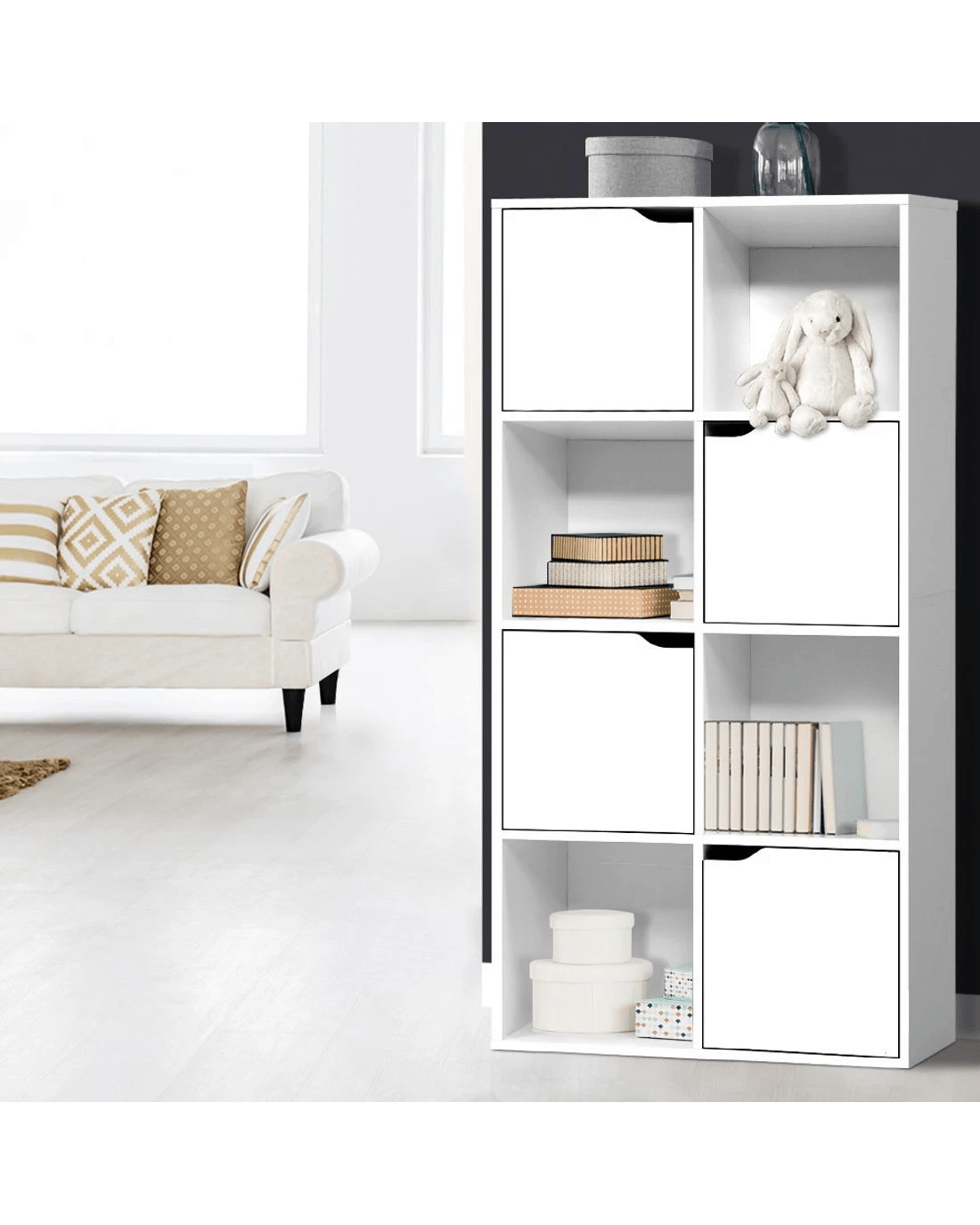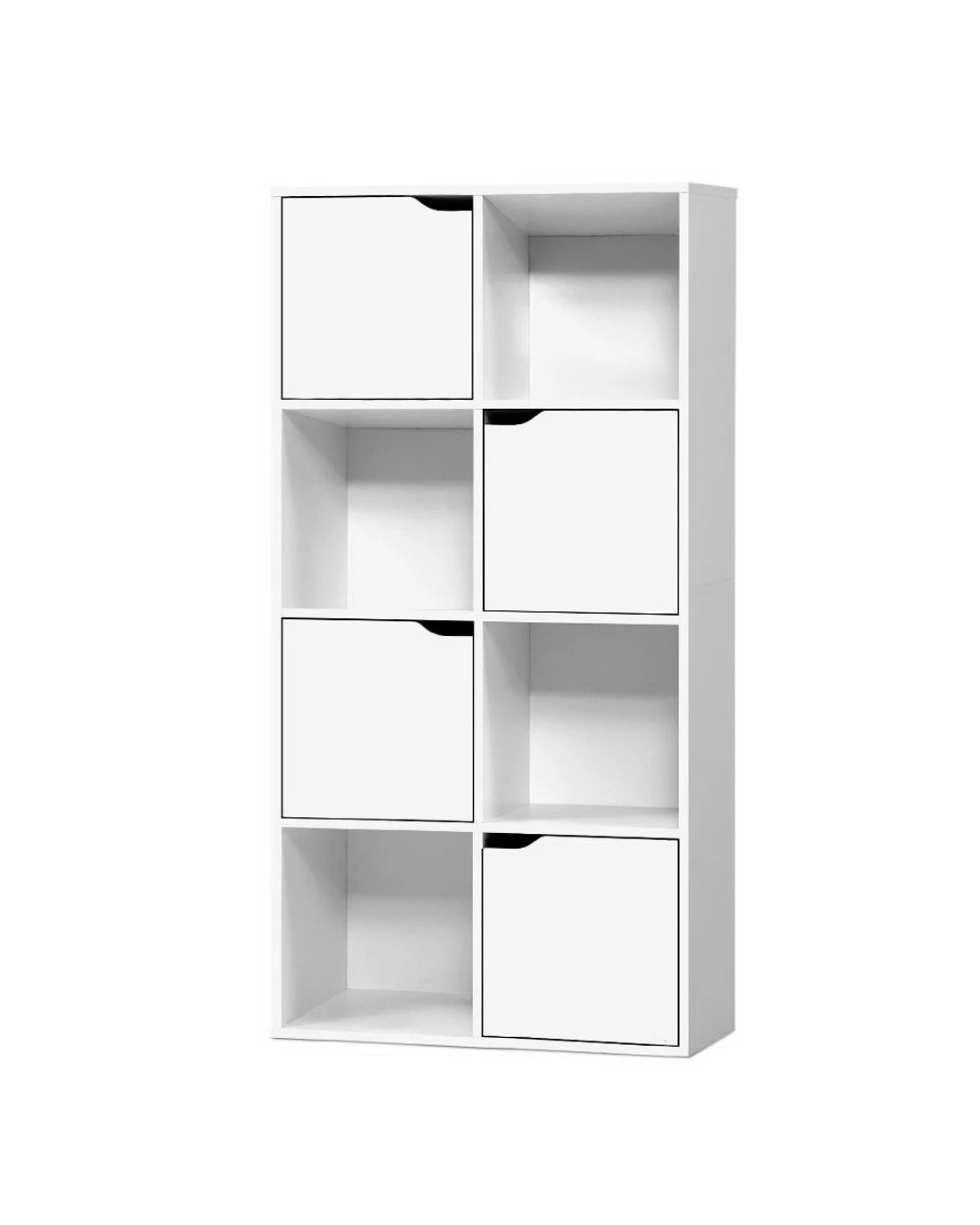 Modern and sleek. Our Artiss Cube Display Shelf provides unique 2-in-1 storage and has the best of everything you want in storage options. With eight cubed storage spaces – four cabinets and four open shelves – the display shelf has ample space to let you showcase all your favourite items both openly and in closed storage. The design is both functional and attractive with the cabinet doors having cut-out handles and magnetic door catches for a sleek appearance. And the neutral white tone and clean lines means the display shelf will effortlessly blend in with any décor. Made from quality particle board with paper veneer finish, this space-saving display shelf is durably constructed and has every feature that makes it a popular choice for the discerning home stylist.