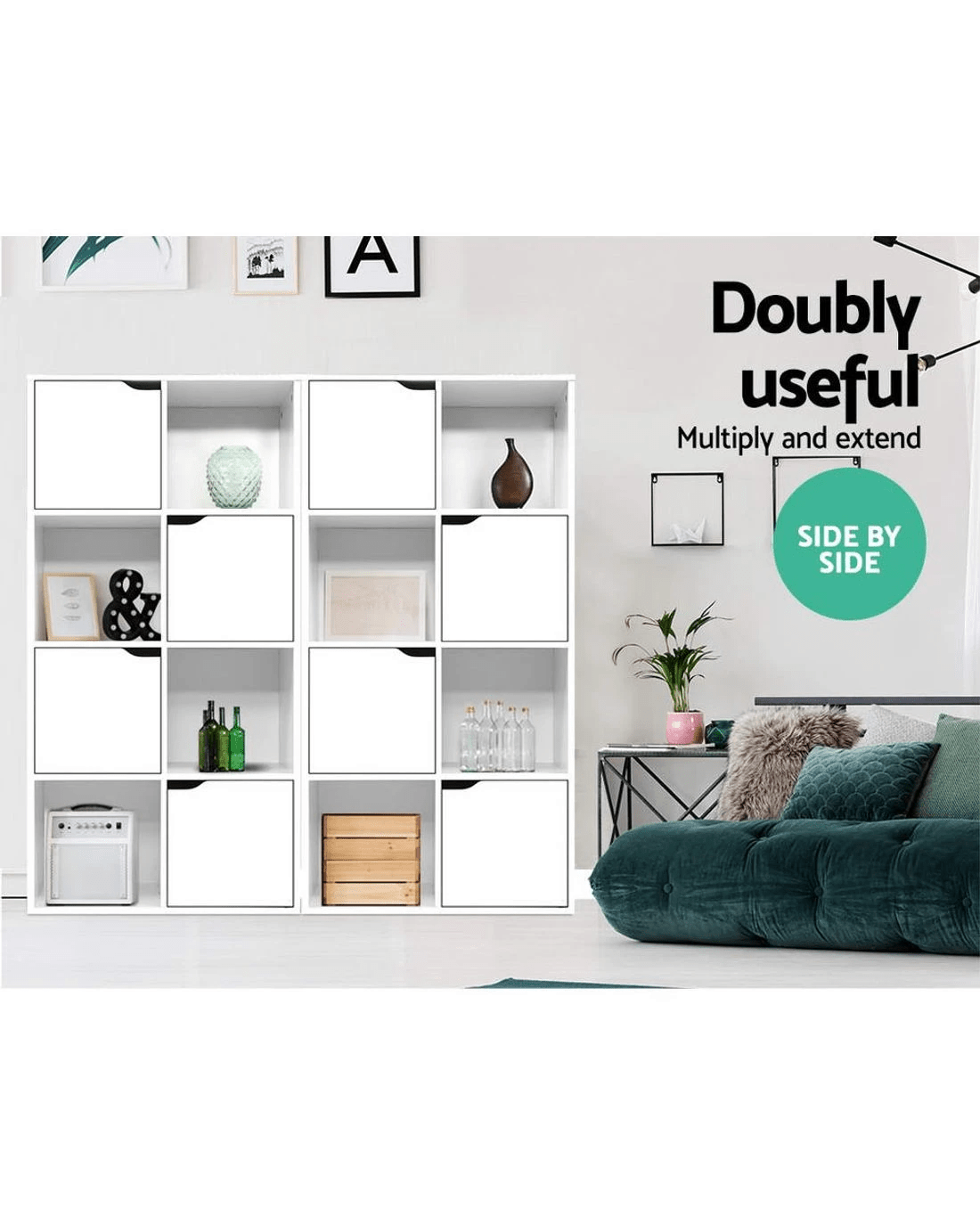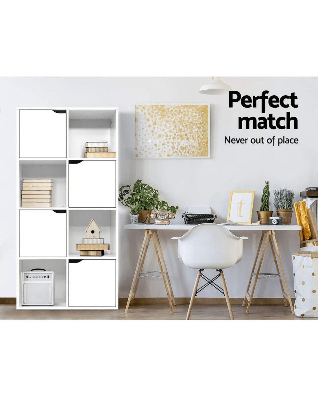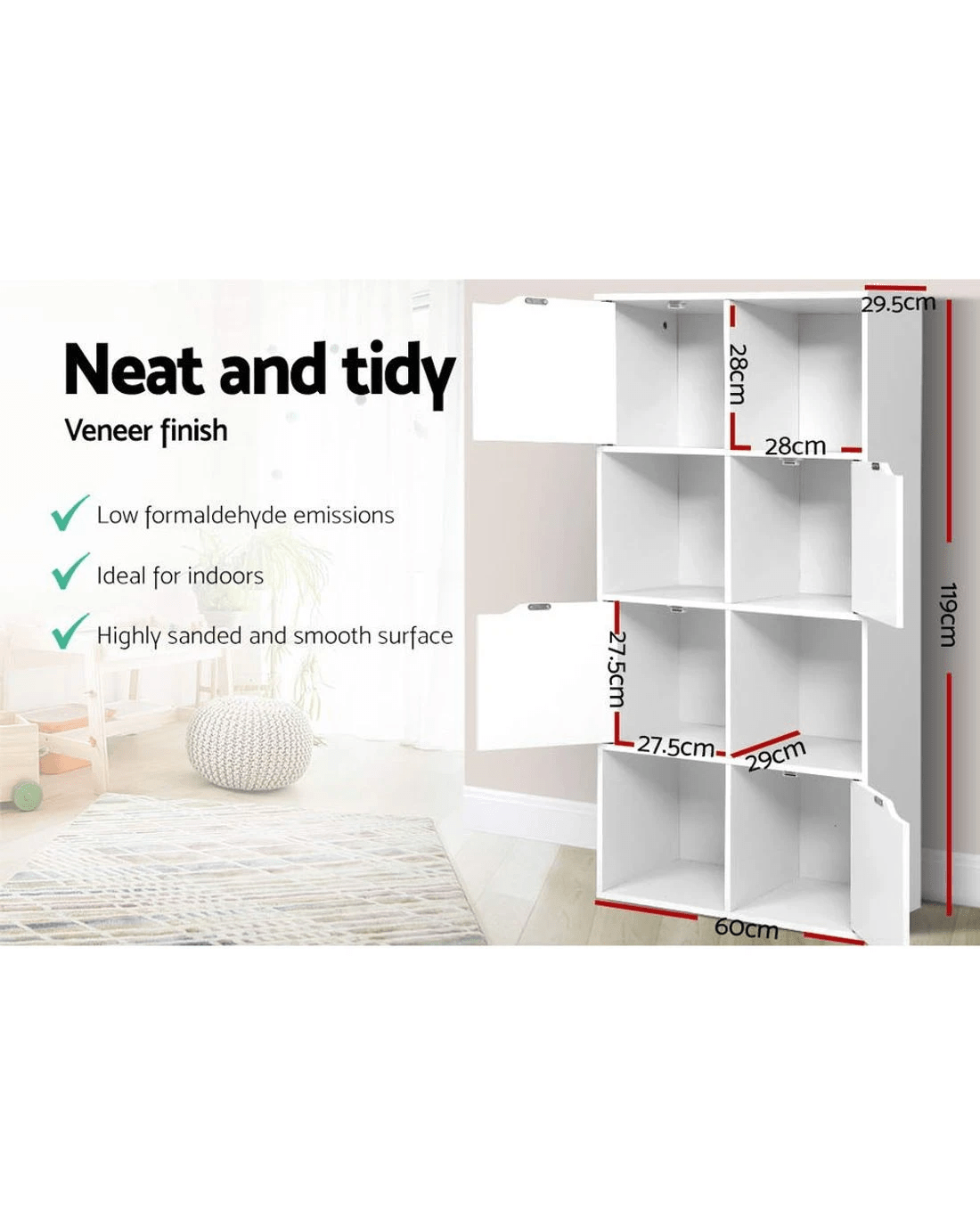 Modern and sleek. Our Artiss Cube Display Shelf provides unique 2-in-1 storage and has the best of everything you want in storage options. With eight cubed storage spaces – four cabinets and four open shelves – the display shelf has ample space to let you showcase all your favourite items both openly and in closed storage. The design is both functional and attractive with the cabinet doors having cut-out handles and magnetic door catches for a sleek appearance. And the neutral white tone and clean lines means the display shelf will effortlessly blend in with any décor. Made from quality particle board with paper veneer finish, this space-saving display shelf is durably constructed and has every feature that makes it a popular choice for the discerning home stylist.