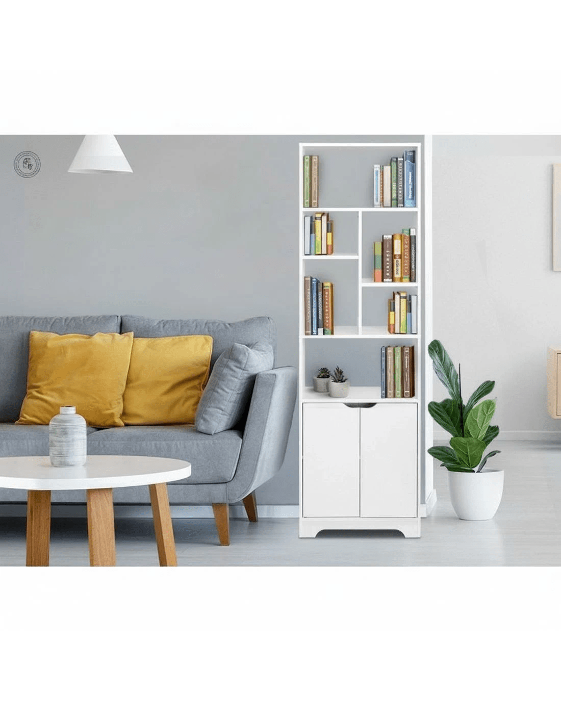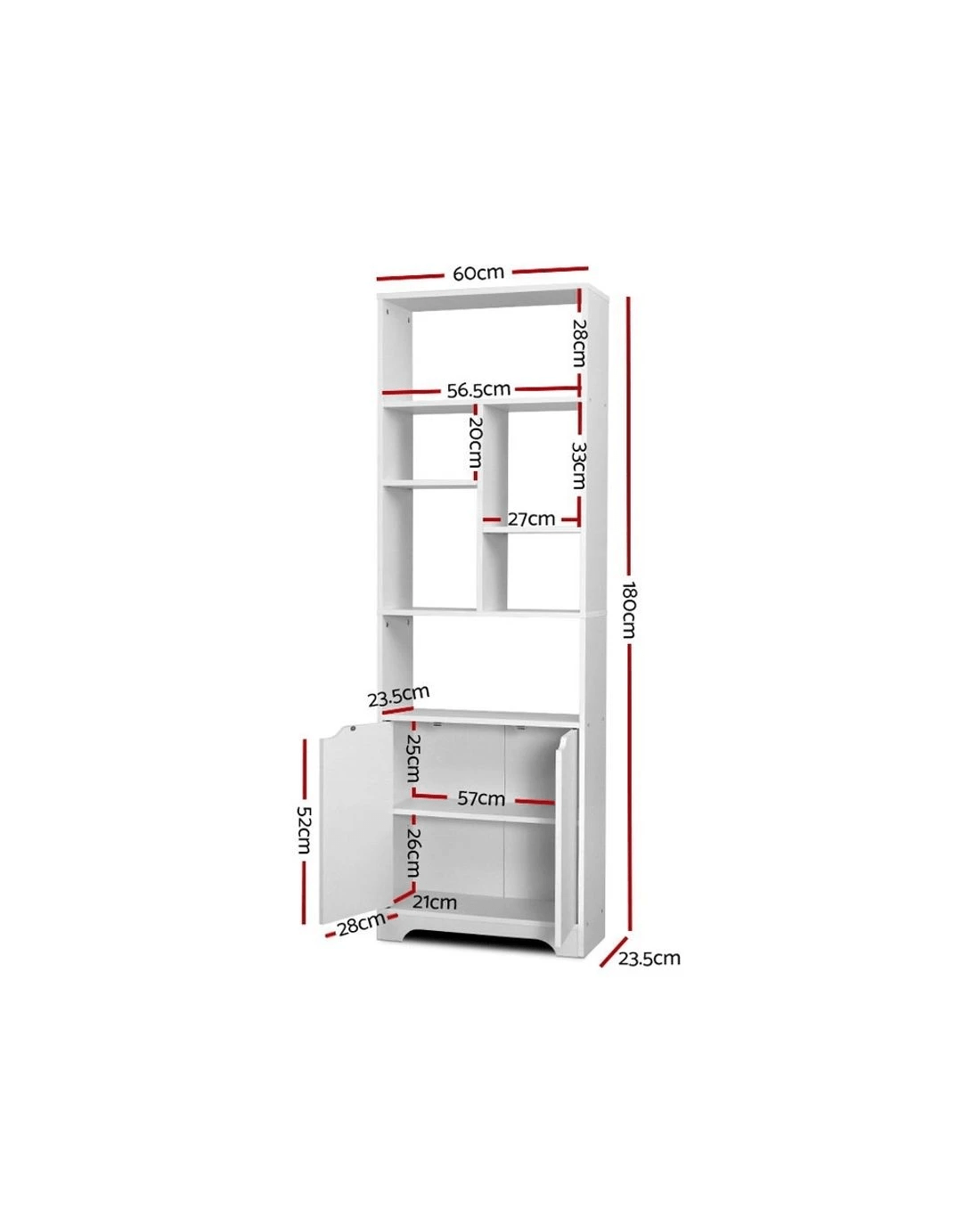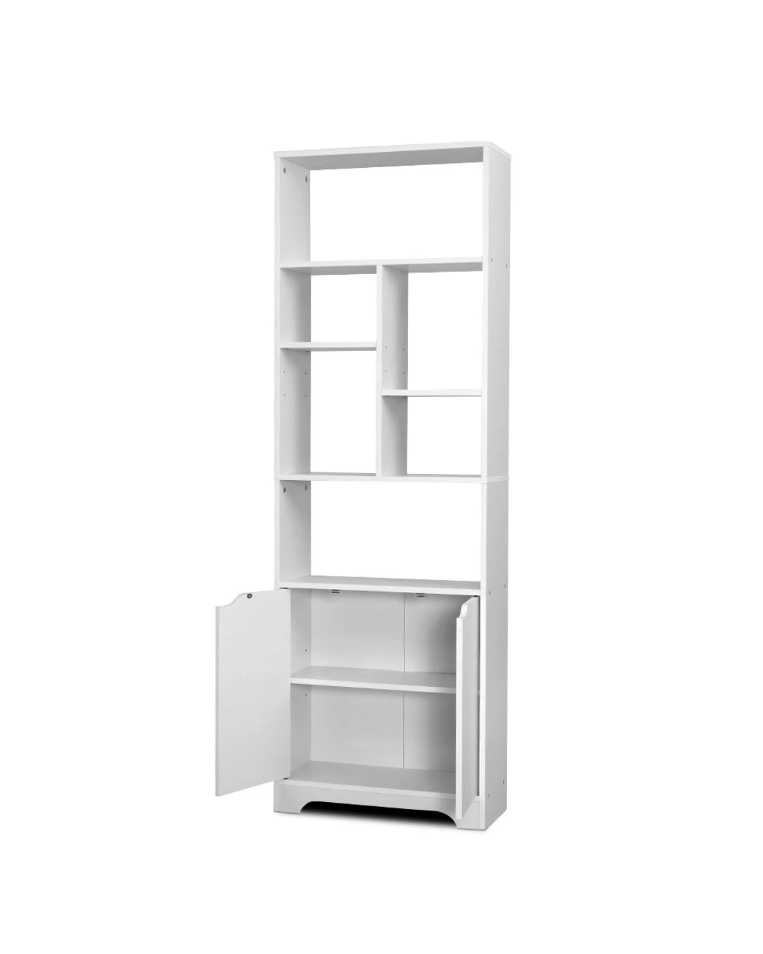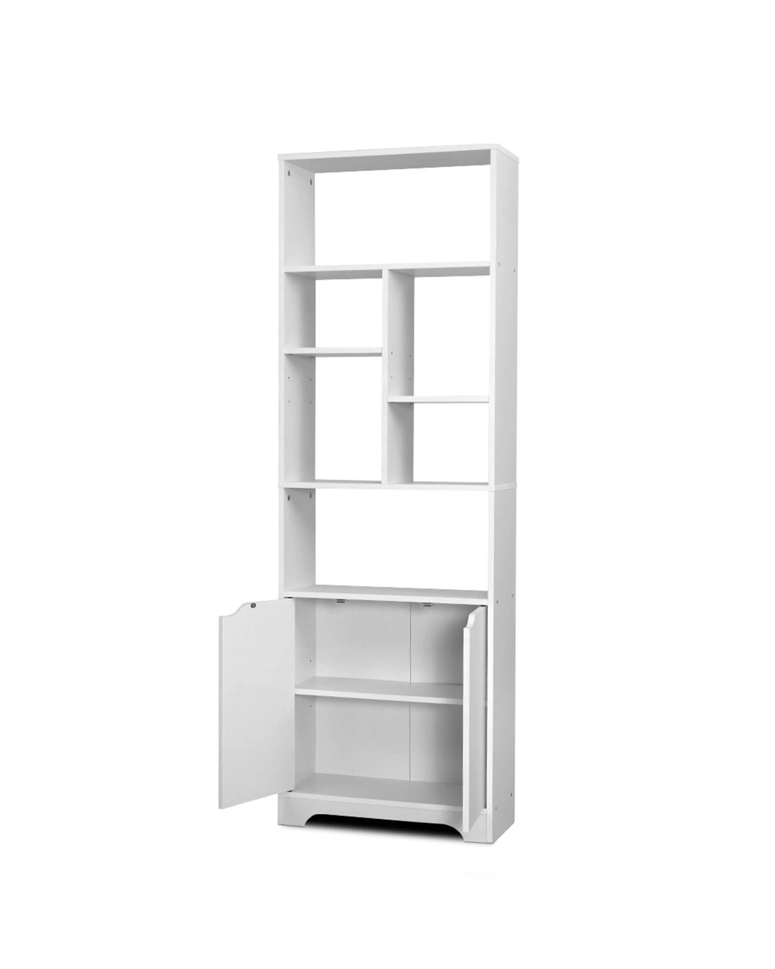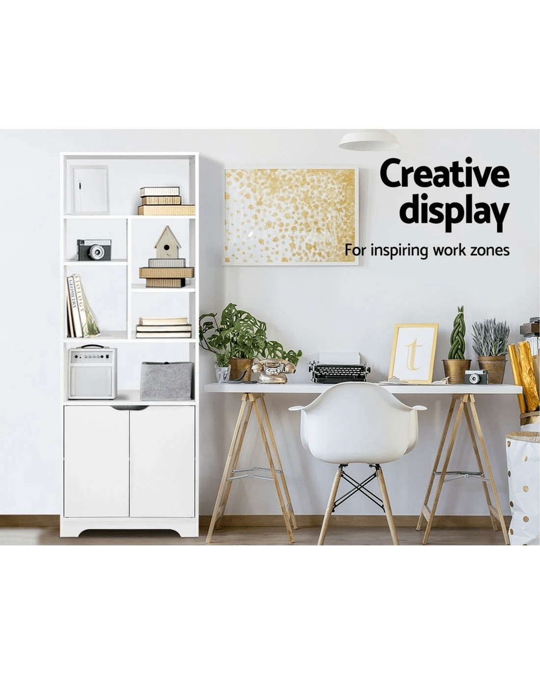 Modern and sleek. Our Artiss Geom Display Shelf provides unique 2-in-1 storage and has the best of everything you want in storage options. With six multi-sized shelves and a two-door cabinet with two-tier storage, the display shelf has ample space to let you showcase all your favourite items both openly and in closed storage. The tall, slimline design is attractive, and the cabinet doors have cut-out handles to maintain a sleek appearance. Better still, the neutral white tone and clean lines mean the display shelf will effortlessly blend in with any décor. Made from quality particle board with smooth melamine finish, this space-saving display shelf is durably constructed and has every feature that makes it a popular choice for the discerning home stylist.