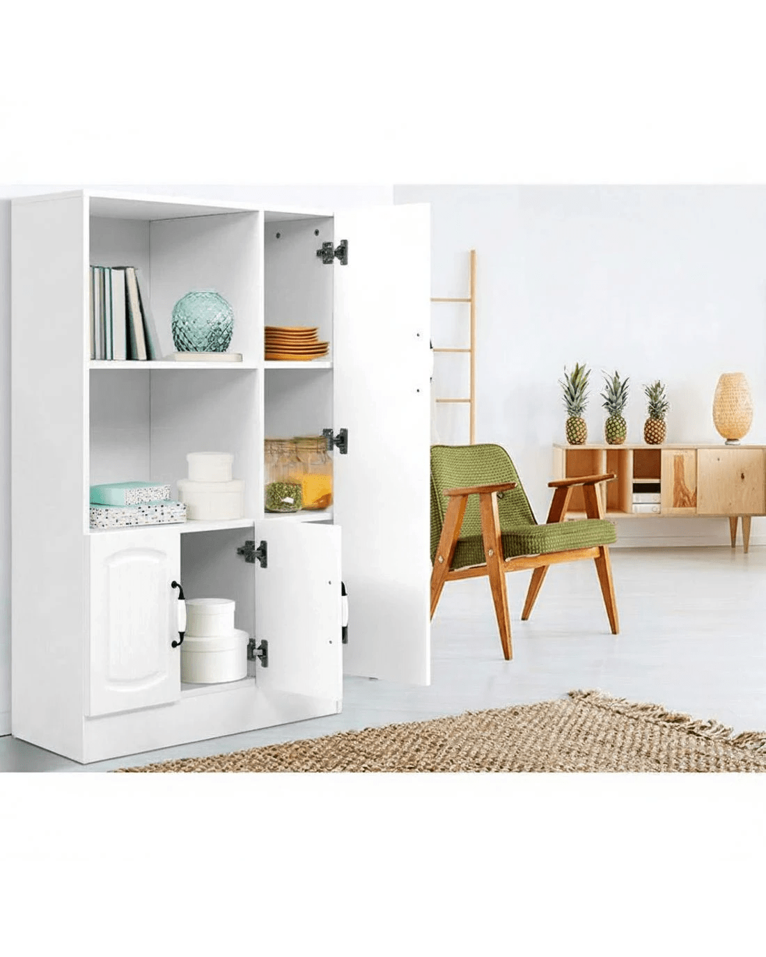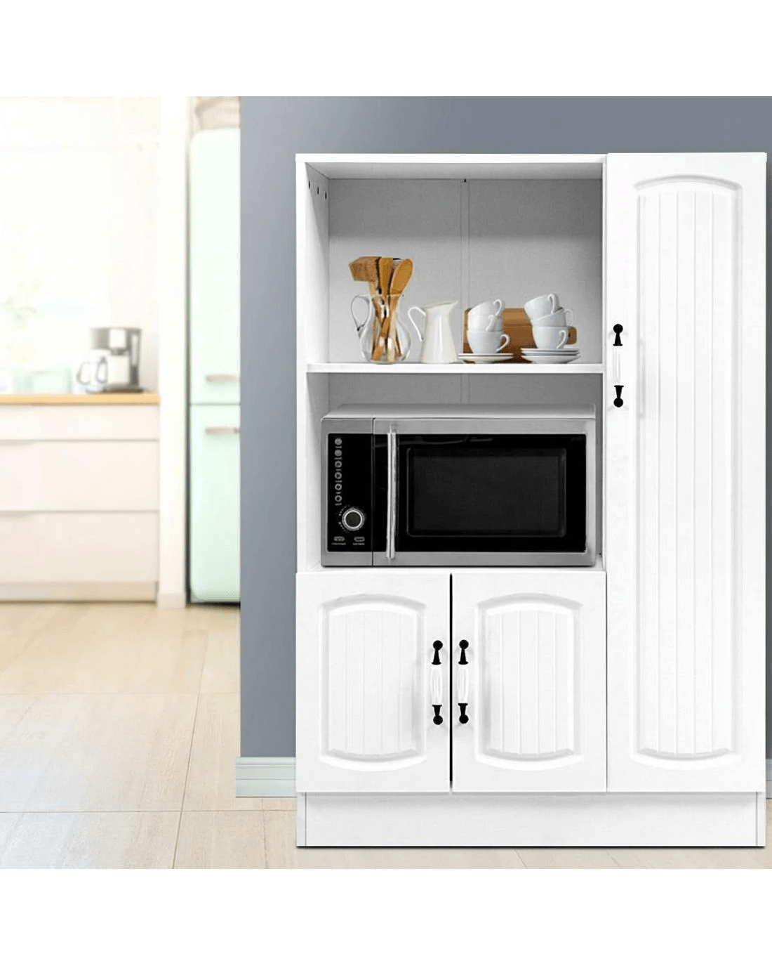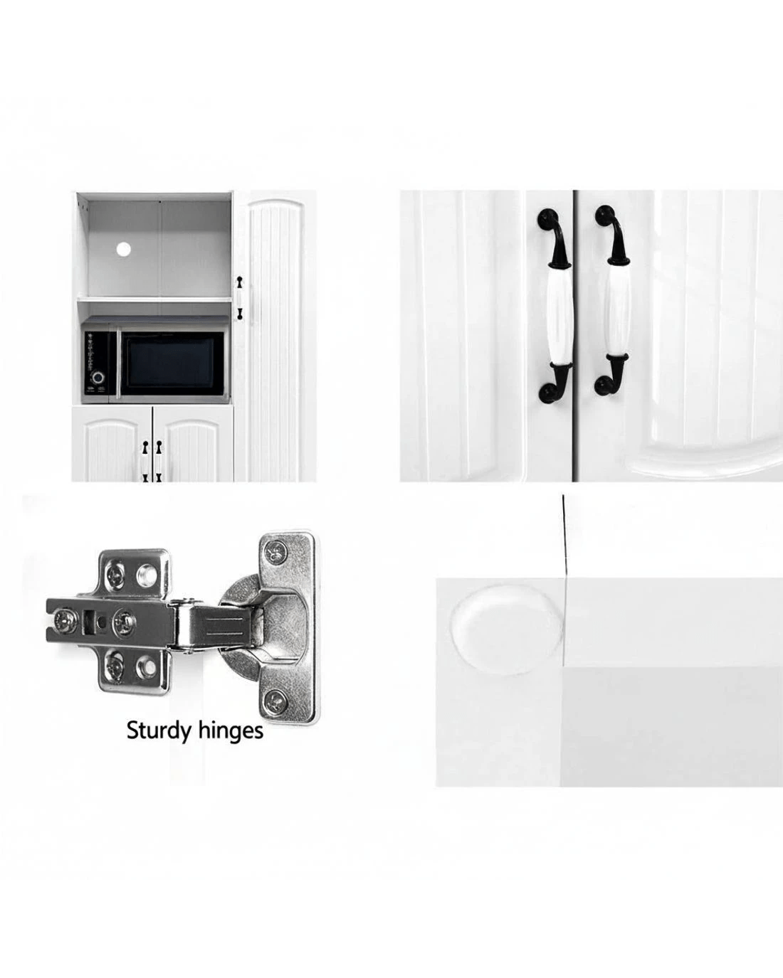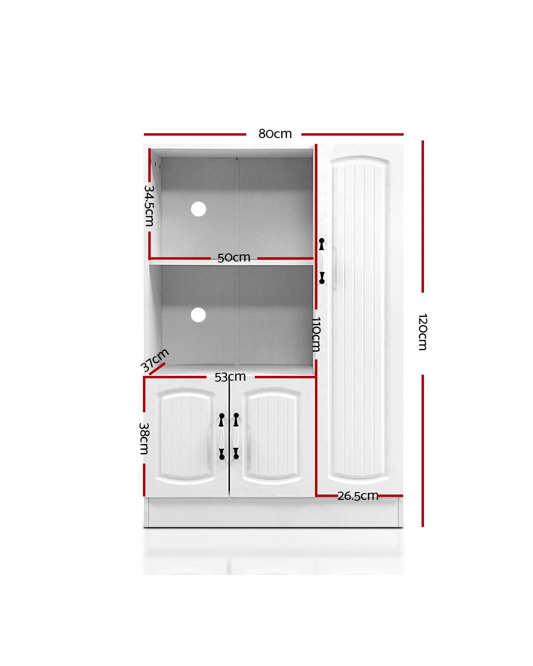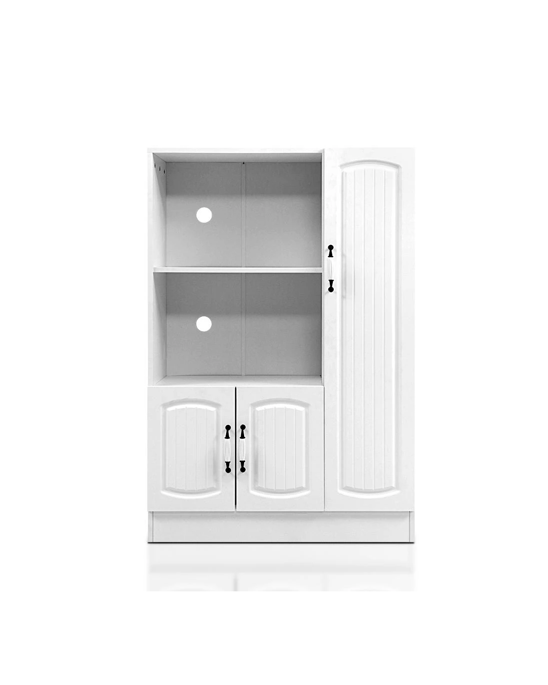 Add a touch of Provincial charm to your home with our lovely period-style Artiss Buffet Sideboard. But it is not only the design that is timeless. The buffet sideboard itself is made to both last and please, with its 15mm thick particle board construction with smooth melamine finish, beautiful moulded doors, exquisite vintage-style porcelain handles, sturdy hinges and anti-scratch feet. Two open shelves and two cupboards with closed shelving provide ample storage space for all your kitchen essentials, while the pre-drilled holes at the back of the open shelves allow for neat and tidy management of all cabling connections for your microwave and other electrical appliances. And best of all, the classic design and neutral white tone mean that the cabinet will suit any kitchen, dining room or pantry. Or any room for that matter, such as the living room.