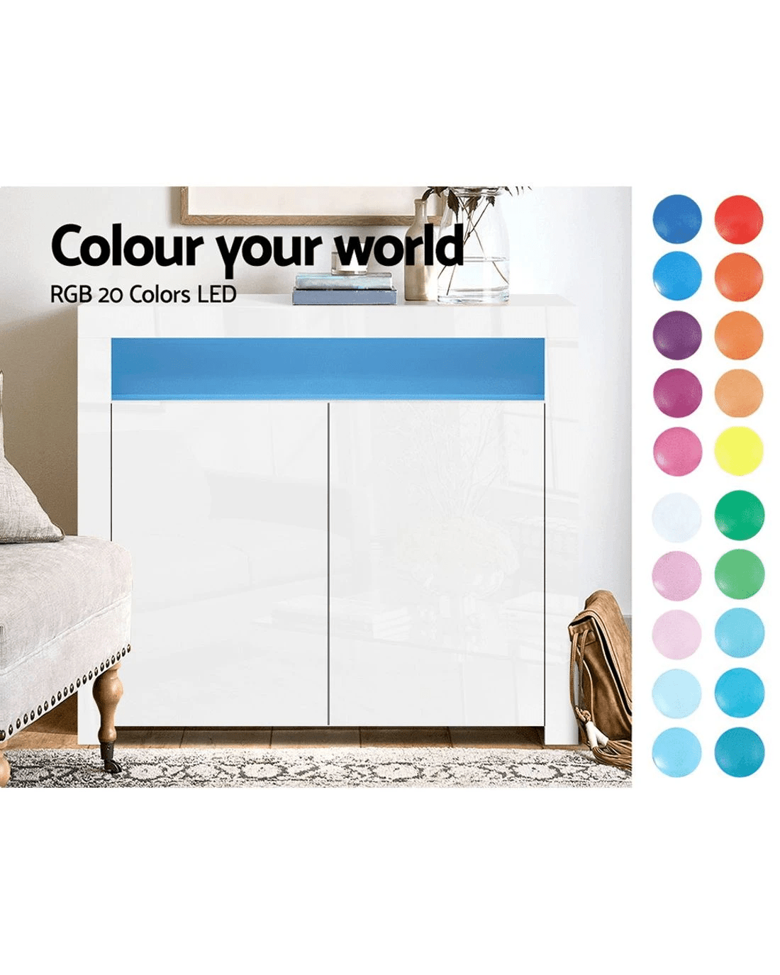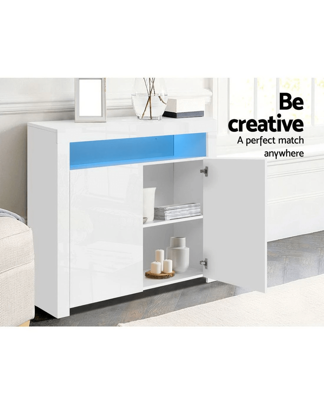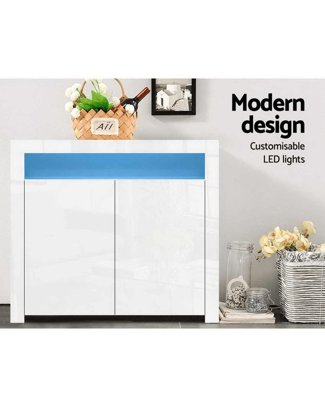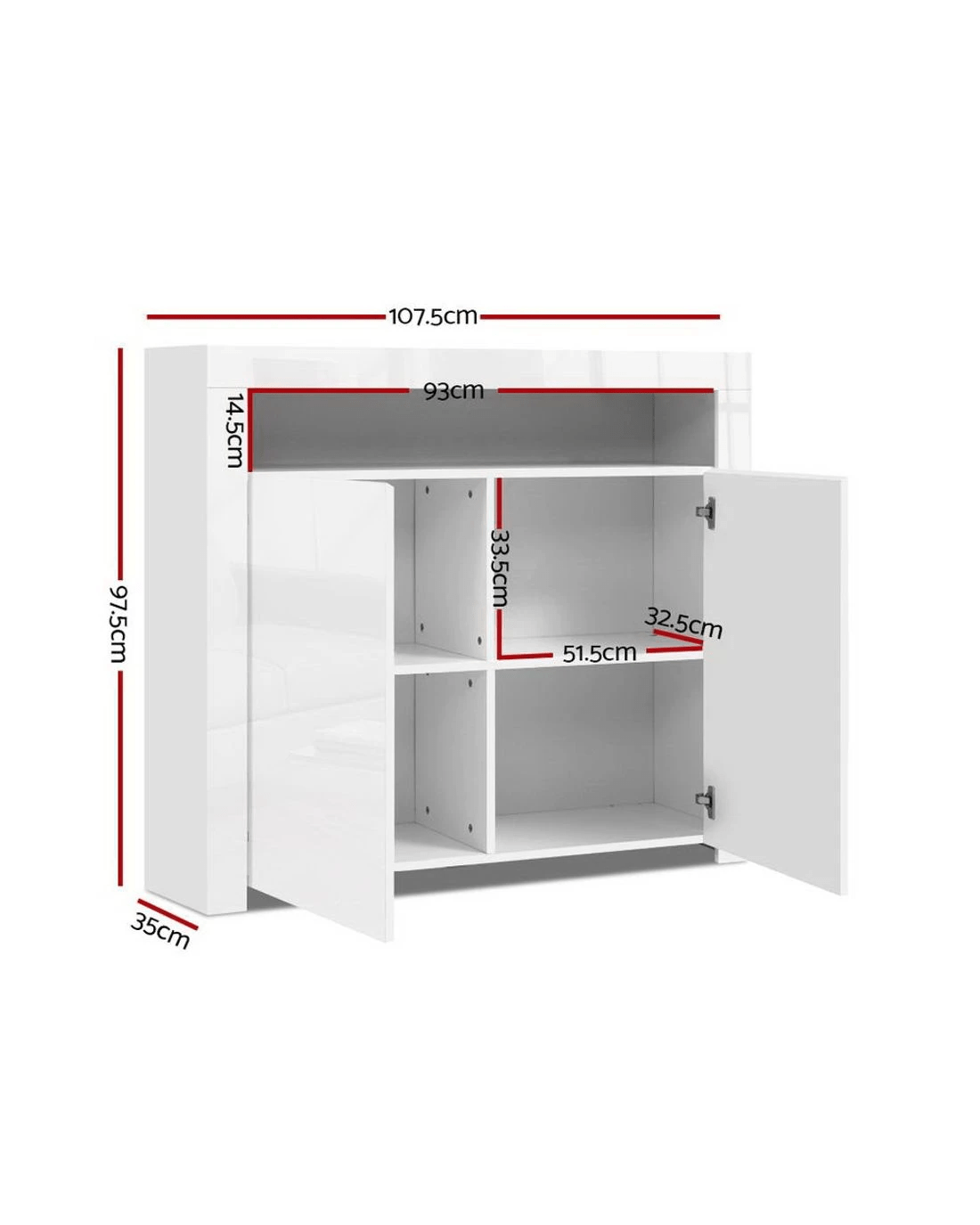 Wow all your houseguests at your dinner parties with our Artiss LED Sideboard. The sideboard comes with built-in LED lighting on the open display shelf that can be customised into different colours to suit your preference. Not only does this create a beautiful ambience, it creates the perfect setting to truly appreciate your collectibles. Crafted from 15mm thick particle board with melamine, this sideboard ensures longlasting durability. And it will be the perfect addition for your modern kitchen or dining room with its contemporary and linear design. Or you can keep one in the living room or the hallway, as the sideboard will suit any décor. The high-gloss cabinet doors have a handle-less design to maintain the sleek appearance and the four compartments in the cabinet in addition to the open shelf provide ample storage for all your kitchen, dining room and other essentials.