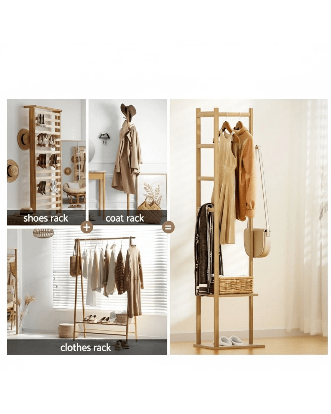 The Artiss Bamboo Clothes Rack is a stylish and practical solution for your home organisation needs. Featuring a sturdy bamboo construction with metal fixings, this 3-in-1 rack includes a hanging rail, side hook, and storage shelf for ultimate convenience. Its lightweight, portable design makes it perfect for any room, while the smooth, polished surface ensures easy cleaning. Whether for clothes, hats, or shoes, this coat stand offers functionality and elegance, making it an ideal addition to modern spaces.
