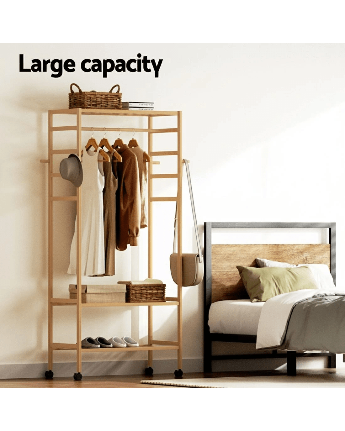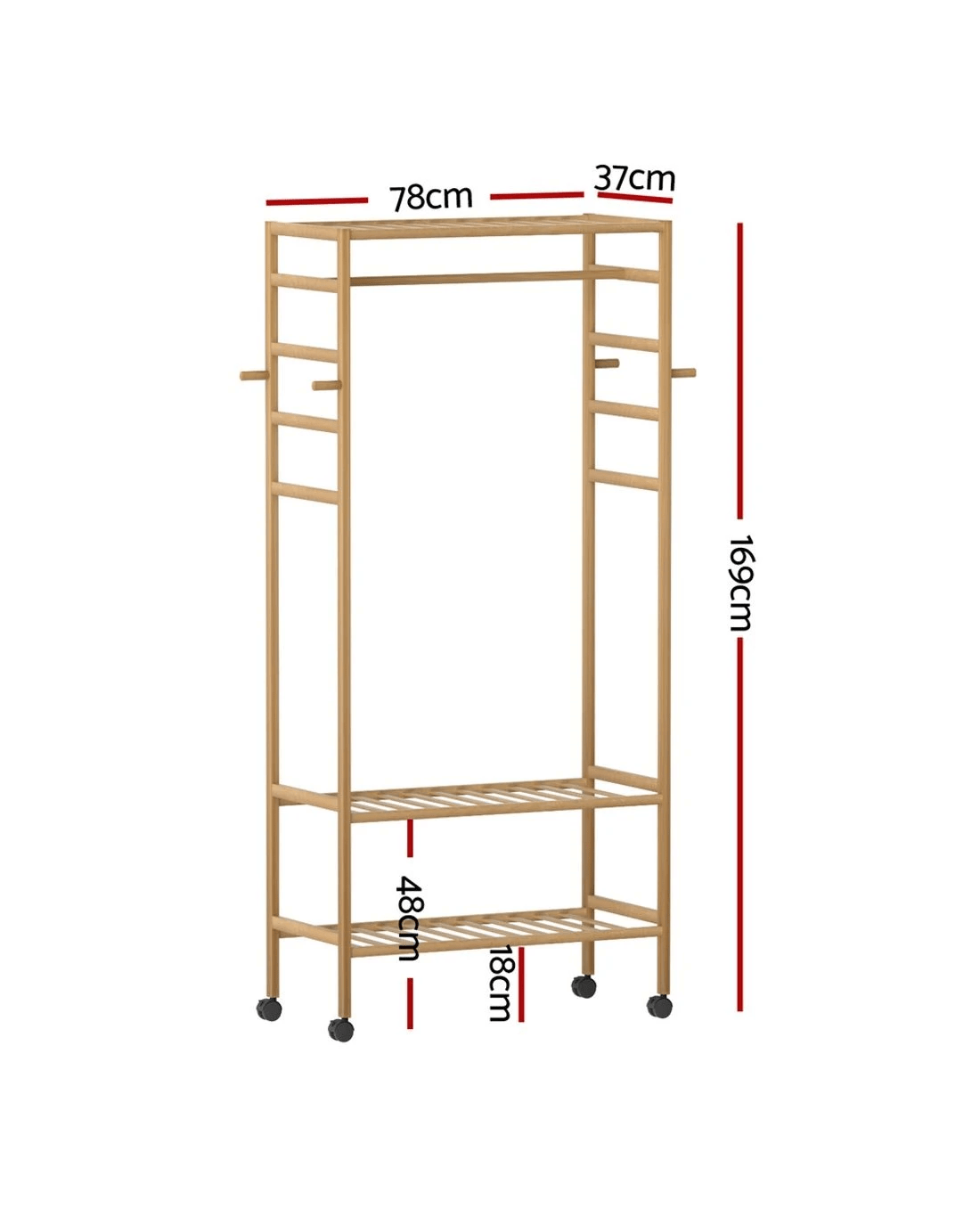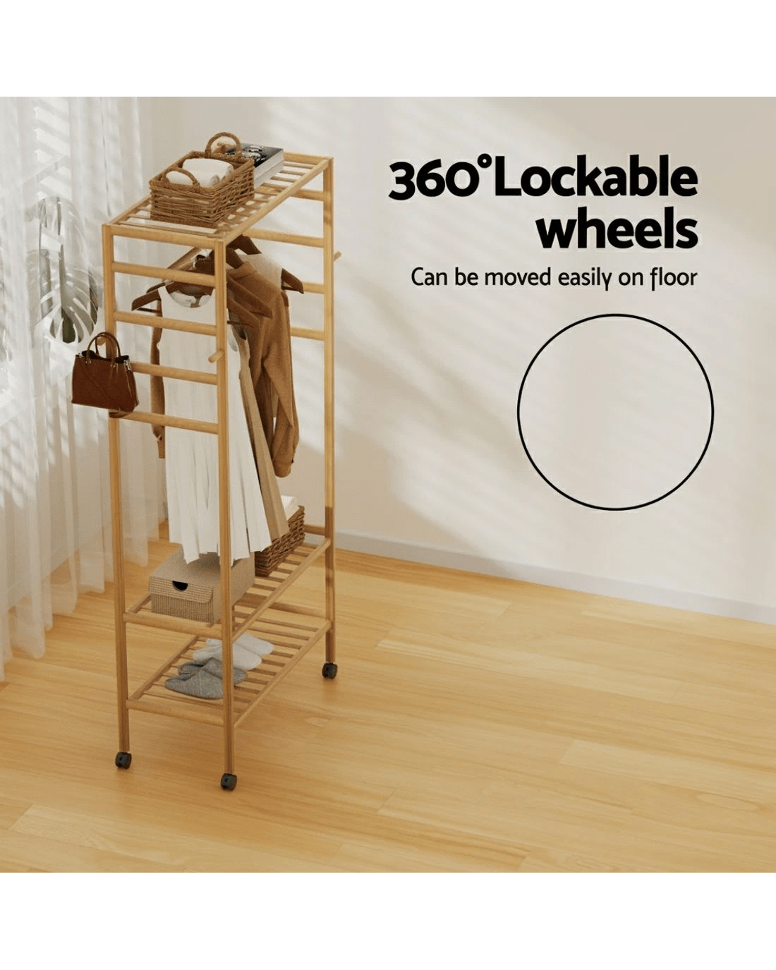 The Artiss Clothes Rack is a versatile solution for your wardrobe needs, combining style and functionality. Crafted from sturdy bamboo with metal fixings, it offers durability and elegance. The wide storage area, hanging rail, and side hooks provide ample space for clothes, scarves, and more. Its lightweight build and 360° lockable wheels ensure easy portability and stability, while the smooth surface allows for hassle-free cleaning. Ideal for homes, laundry rooms, or fashion studios, this garment rack is both practical and stylish.