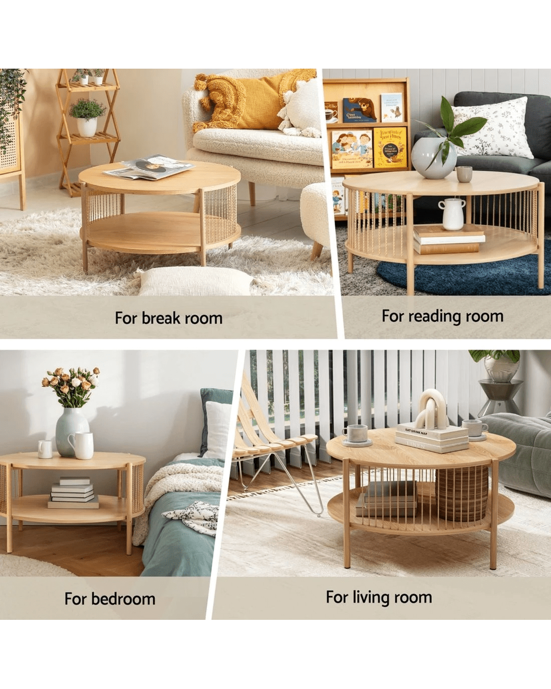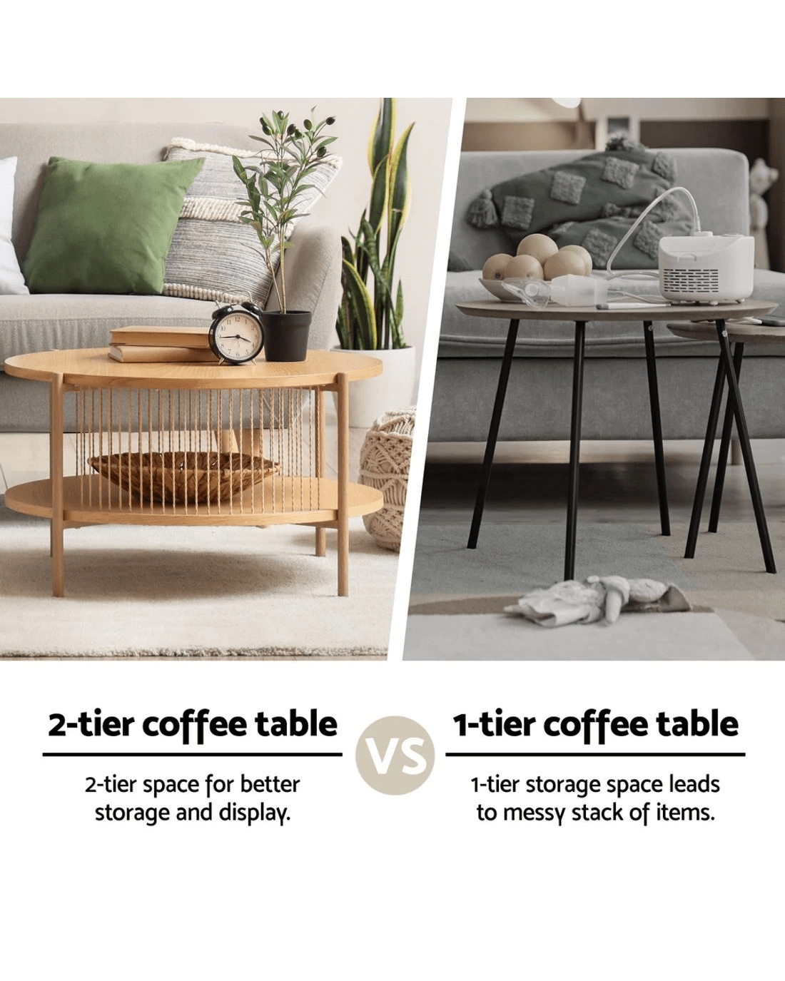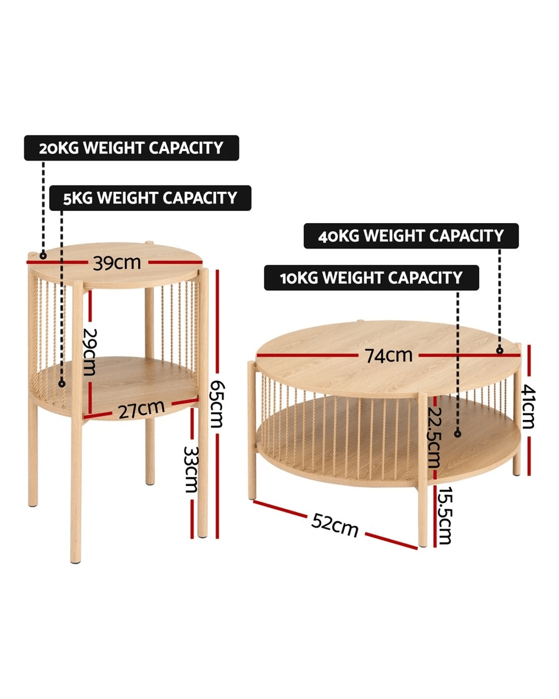 The Set of 2 Artiss Coffee Table combines sleek modern design with functional storage solutions. Crafted with sturdy 15mm E1-grade MDF surfaces and a robust metal frame, this two-tier coffee table offers reliable durability for daily use. Its unique straw rope-inspired metal accents add rustic charm to contemporary spaces, while the non-slip floor protectors safeguard your flooring. The easy-clean surfaces resist stains, perfect for busy households. It effortlessly fits into living rooms, lounges, bedrooms, or studio apartments. Organise magazines, remotes, or décor on the dual shelves – a practical yet stylish centrepiece for modern living.
