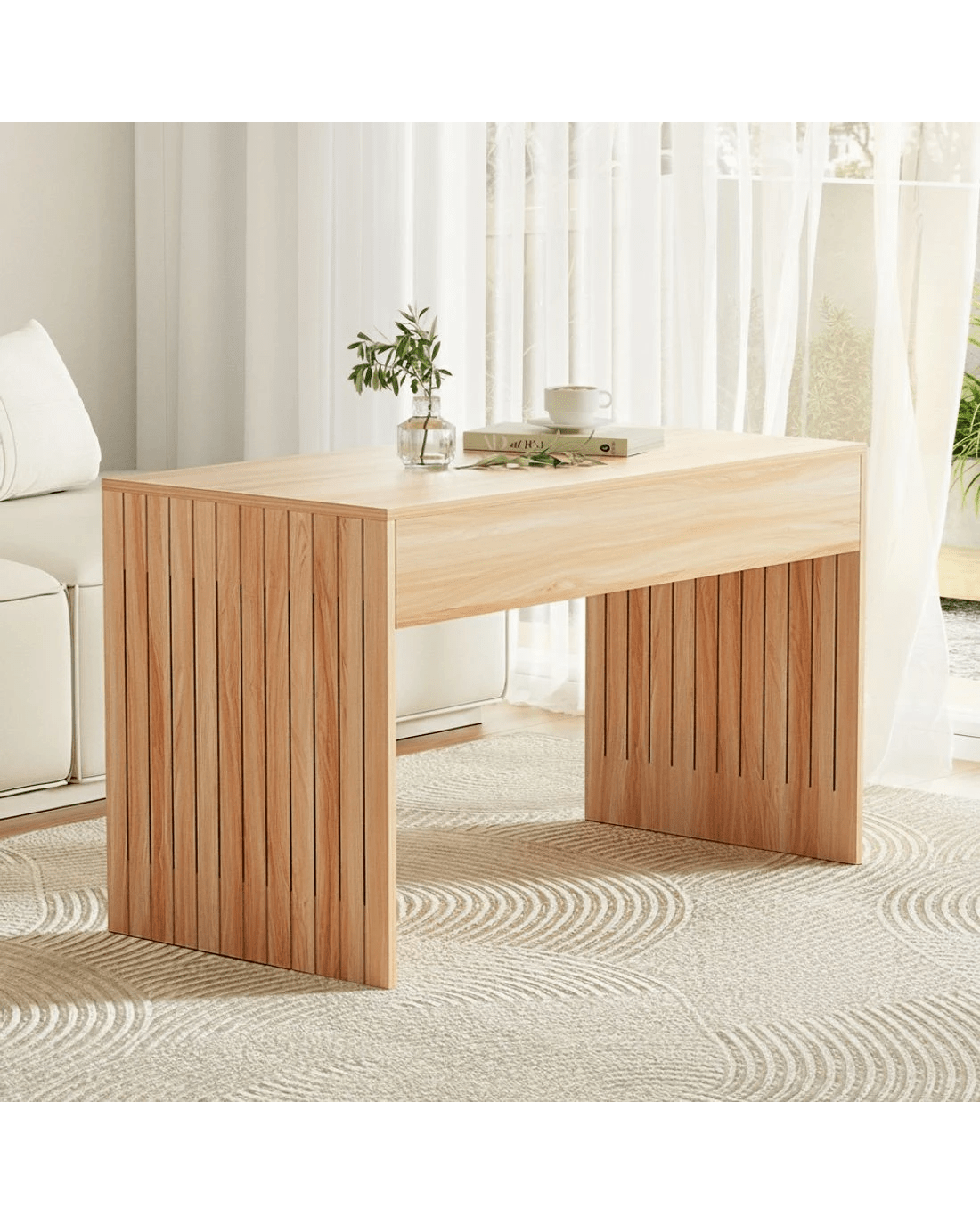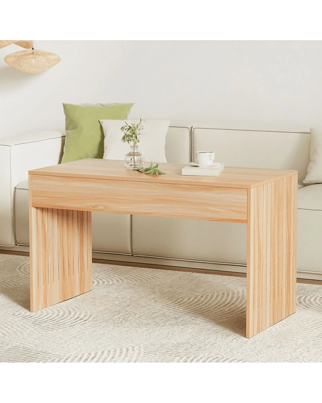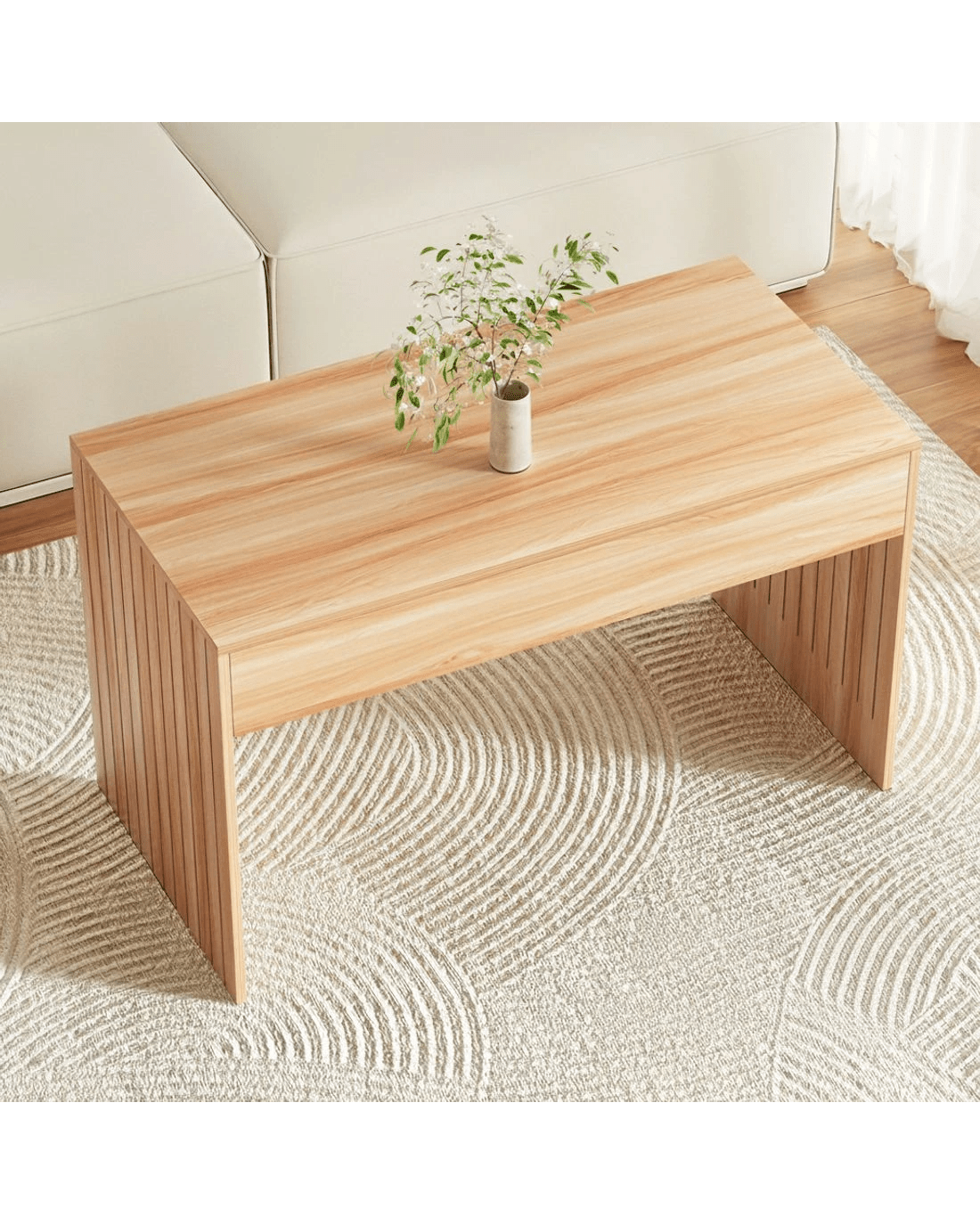 This elegant Artiss coffee table, crafted from E1-grade MDF with a melamine coating, features fluted side panels and a distinct wood grain surface. It's easy to clean, maintain, and assemble, making it a stylish and practical addition to any room.