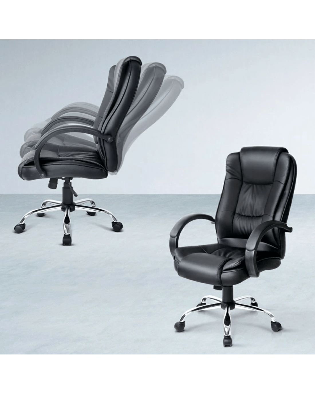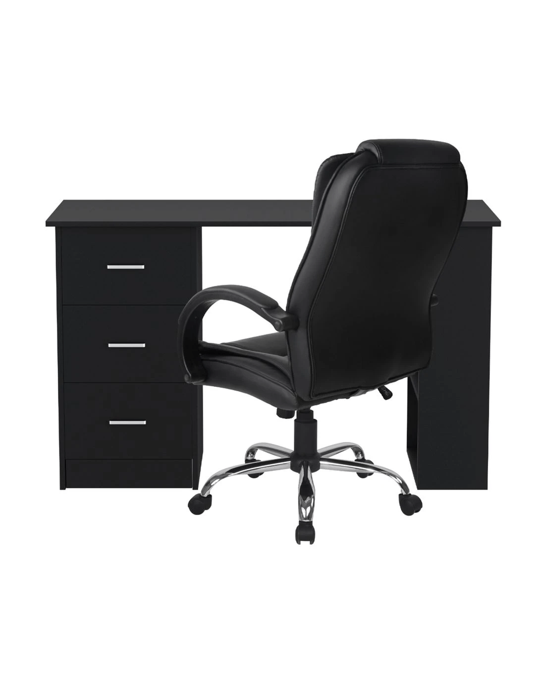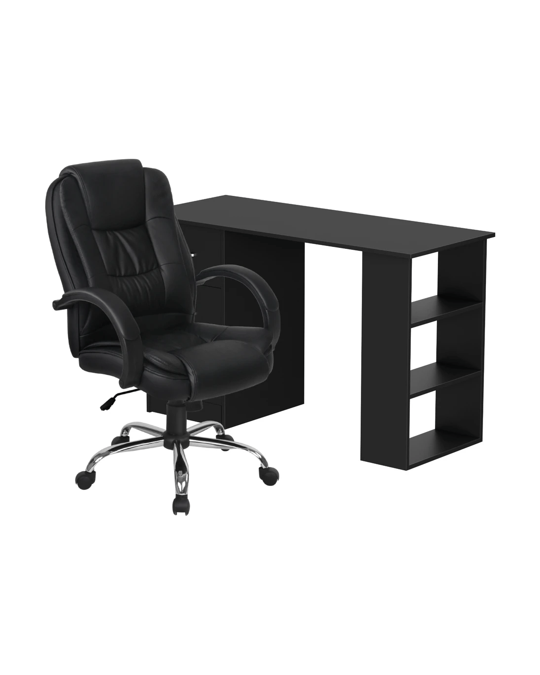Paired with the desk is an office chair upholstered in PU synthetic faux leather for a sleek, professional look. Designed for all-day comfort, it features a high back, multi-layer padded seat, and cushioned headrest and armrests. The tilt adjustment and gas lift allow for customisable positioning, while the 360° swivel and durable chrome base with five castor wheels ensure smooth movement. Functional and stylish, this combo is perfect for any workspace.