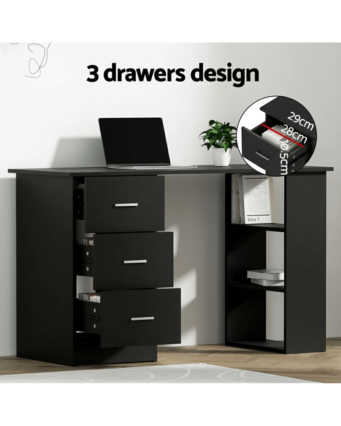 Upgrade your workspace with the Artiss Computer Desk and Office Chair Combo, a stylish and practical solution for your home office or study. The compact desk is designed to maximise space while providing ample storage with three drawers and 3-tier open shelves for organising essentials. Featuring smooth handles, anti-rust metal runners, and an anti-slip base, it ensures durability and stability for everyday use. Its modern design makes it a great addition to any work or study environment.