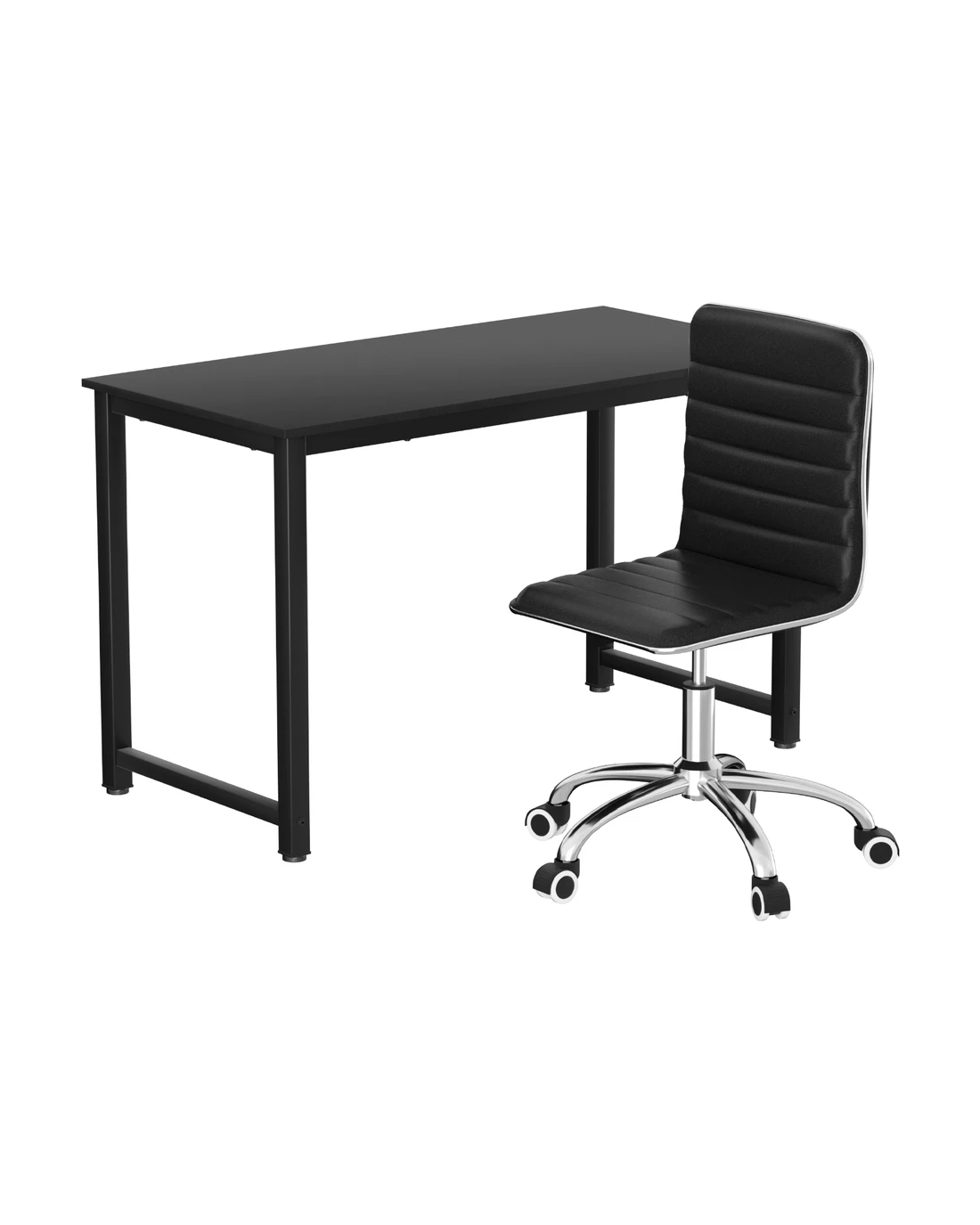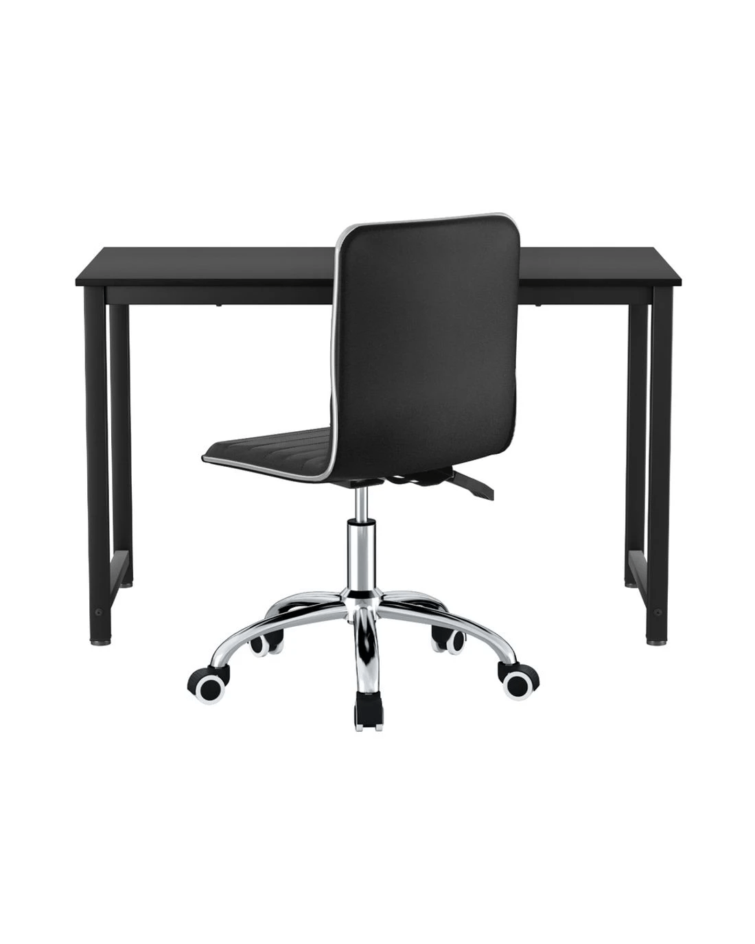 Complementing the desk is a low-back office chair, upholstered in PU leather for a refined look and comfortable support. The padded seat and backrest provide cushioning for long hours of use, while the height-adjustable design and 360-degree rotation offer flexibility. Supported by a metal base with five castor wheels, this chair glides easily across surfaces. Perfect for any workspace, this set combines practicality, style, and comfort.