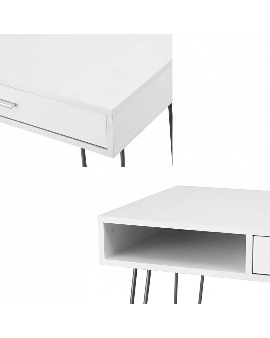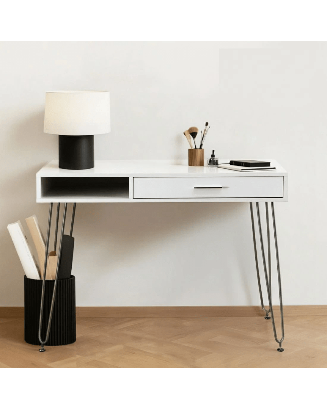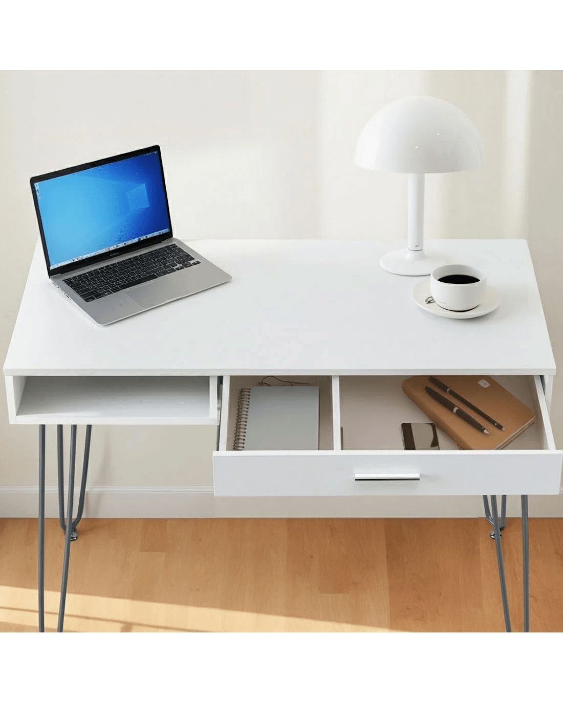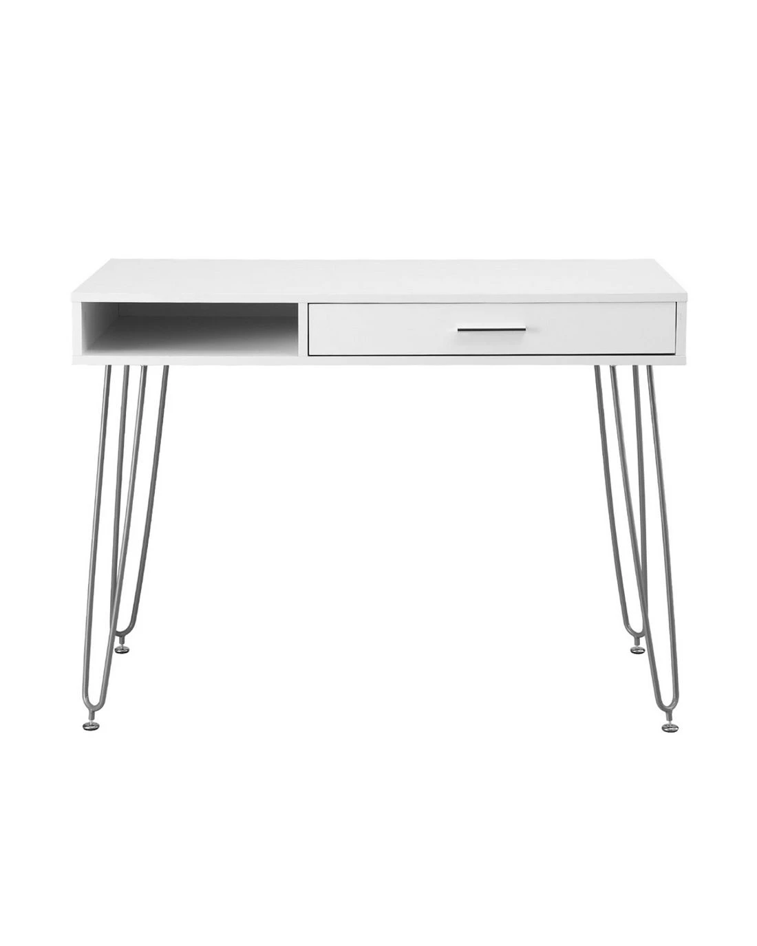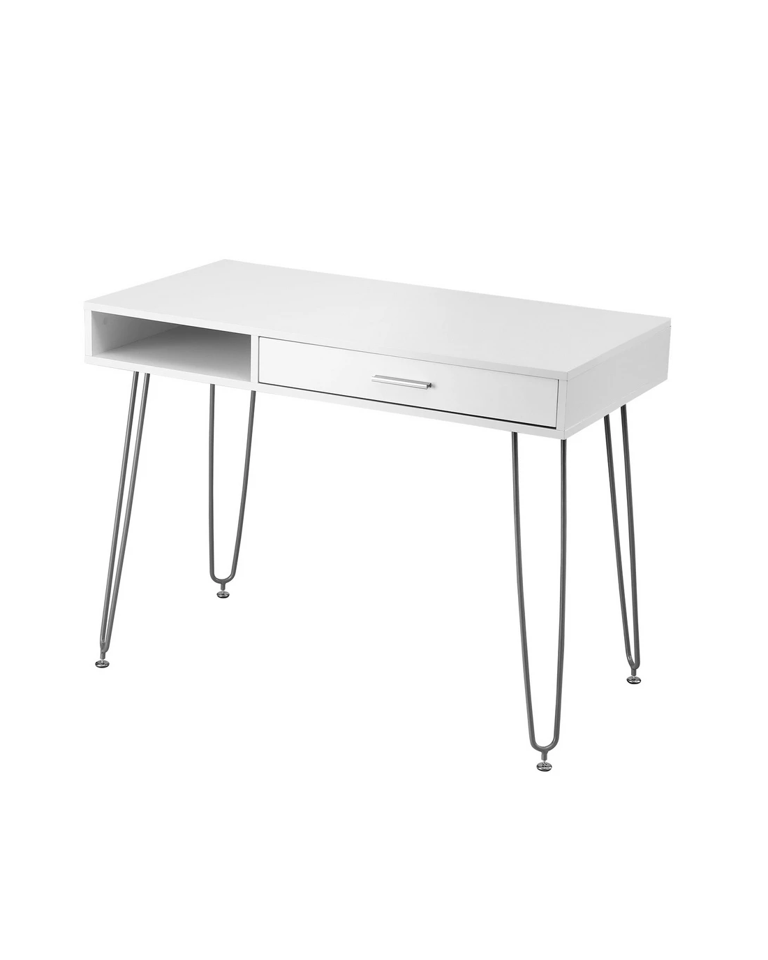 Beyond its good looks, this desk is built for practicality. The built-in storage drawer and open shelf offer convenient space for your essentials, from stationery to notebooks, keeping your workspace tidy and clutter-free. You can trust in its sturdy construction and safe, rounded edges for everyday use. The metal legs feature screw-in leveling glides to ensure perfect stability on any floor.