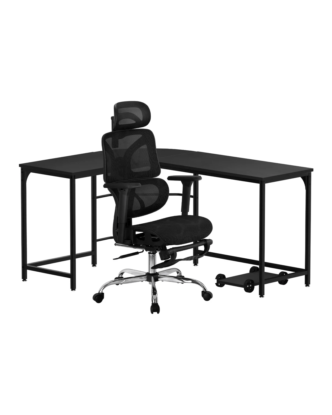 Paired with the desk is an ergonomic office chair.