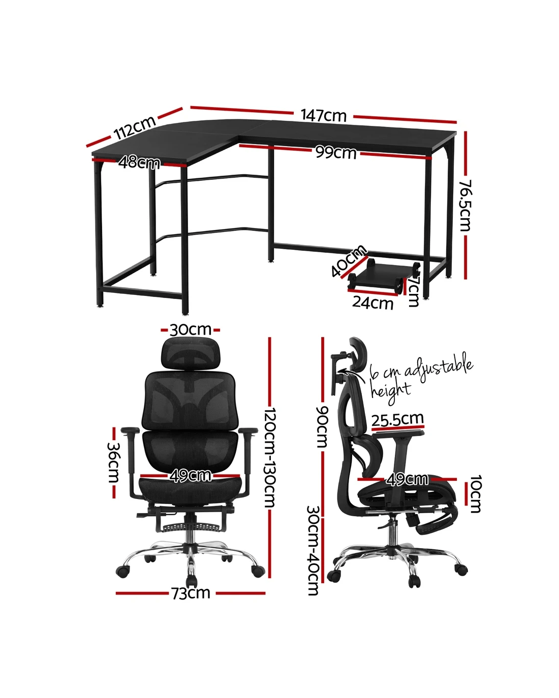Upgrade your workspace with the Artiss Computer Desk and Office Chair Combo, a stylish and practical solution for your home office or study. The compact desk is meticulously crafted with a thick particle board and solid powder-coated steel frame to ensure long-lasting and robust use. With an L-shaped design, the desk allows you to have your attention to everything in one glance and fits in corners. It has ample storage space with a wide desktop to accommodate your table lamp, pen stand, and other knick-knacks. The desk also features safe and smooth edges to prevent accidental injury, anti-slip base, built-in floor protectors, convenient and practical design and is equipped with a bonus CPU stand.