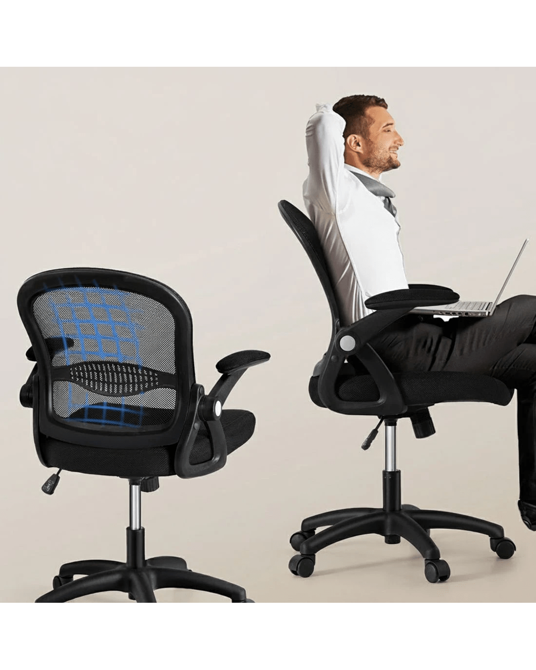 Paired with the desk is an office chair with featuring a contoured mid-back design and breathable mesh, it provides excellent support and airflow, ensuring long hours of comfort. The high-density foam padding and soft padded seat enhance seating experience, while the adjustable height with gas lift allows for customizable ergonomics. The 90° flip-up armrests provide extra versatility, letting you easily adjust the chair to suit your needs. With a 360° rotating seat and adjustable tilt, this chair offers flexible movement and comfort. Built with a stylish nylon base, it combines durability with modern design. Plus, it's easy to clean, making maintenance a breeze.
