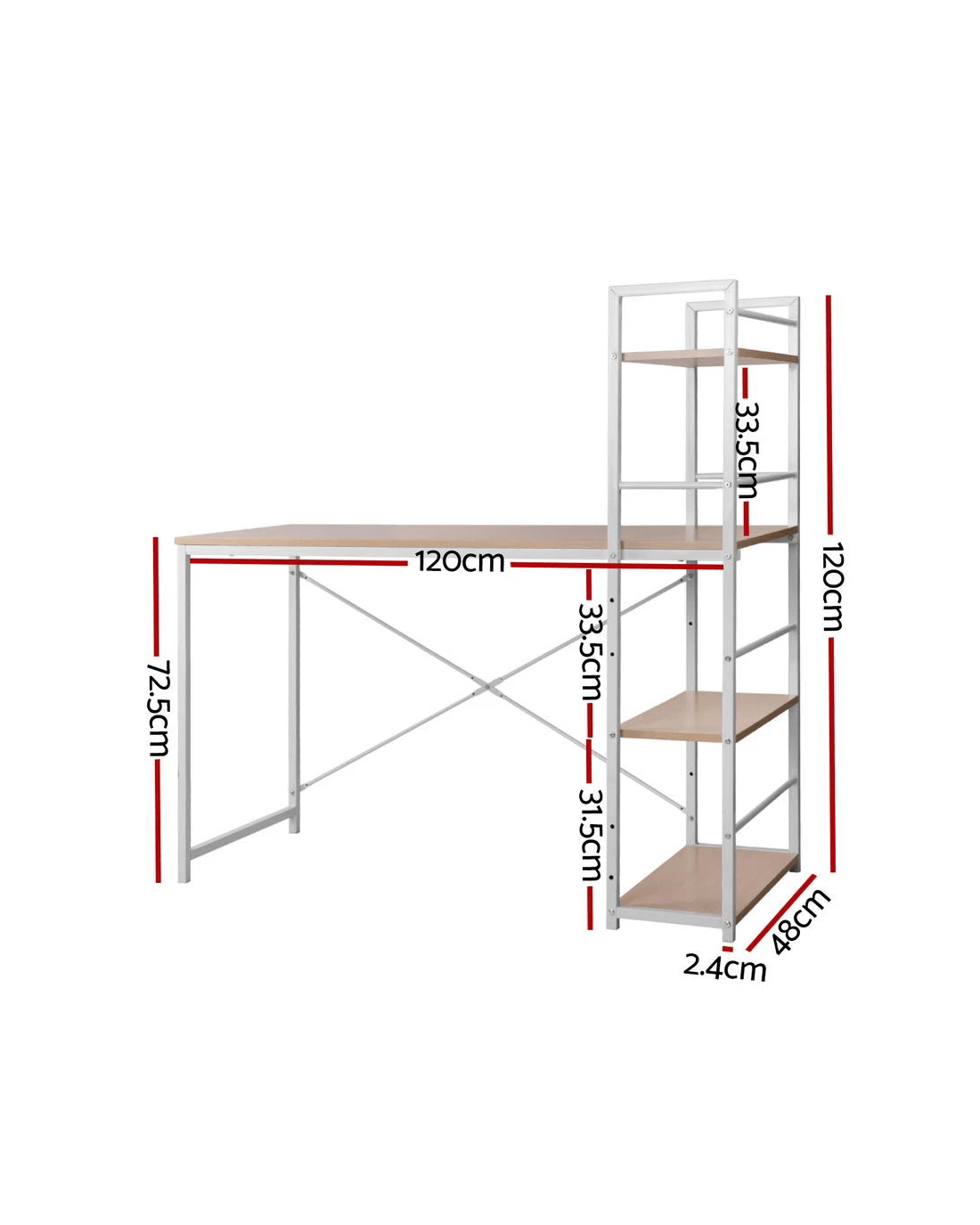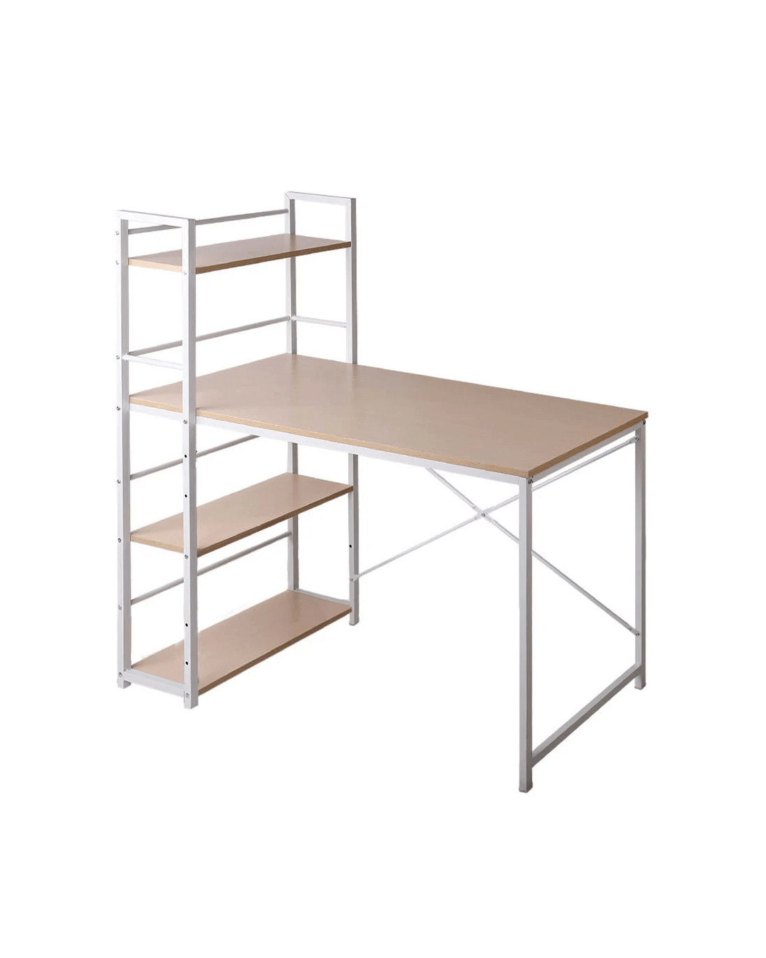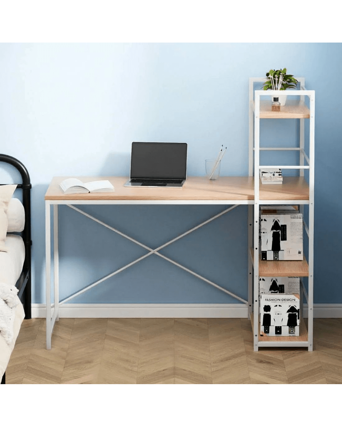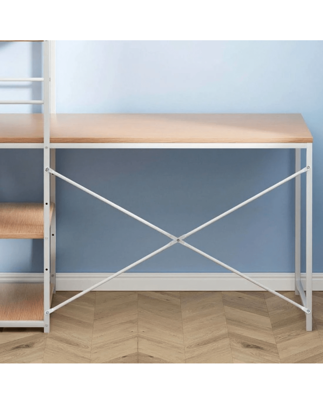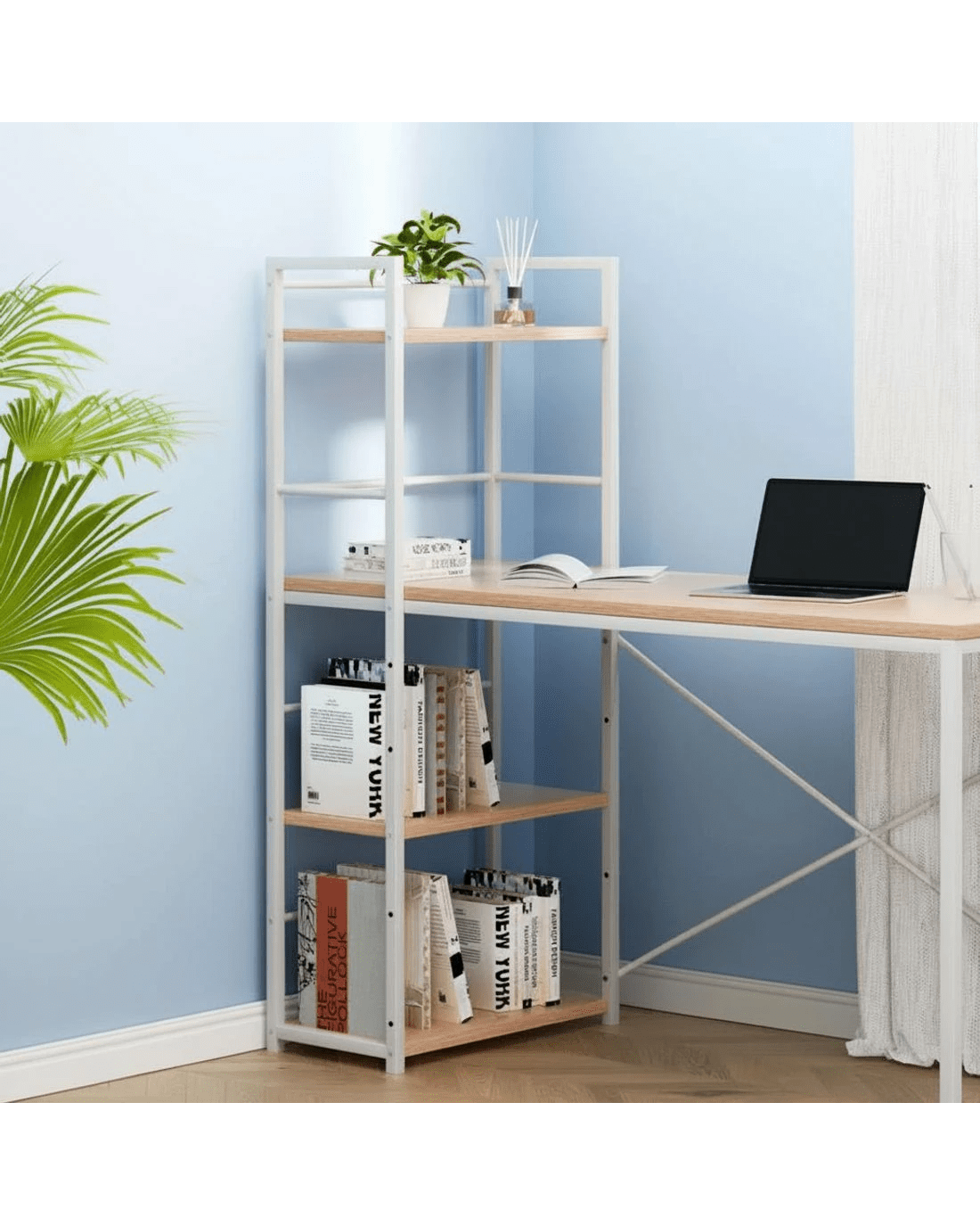 On one side, four shelves with bar backstops are perfect for books, files, binders and all your reference essentials. Adjoining the 4-tier open shelves is an exceptionally thick 15mm engineered wood with melamine veneer desk top that provides more than adequate work space for your laptop and other working paraphernalia. To enhance its sturdiness, a X-brace across the back keeps the ensemble firm and steady at all times.