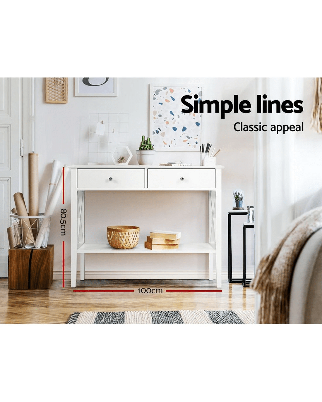 Every home that considers itself a stylish and contemporary example should have our beautiful Console Table lining its doorway or hallway. It can also serve as a wonderful front console table for your cafe, restaurant or shop to welcome customers with chic and charm. Crafted from high-quality E1 MDF board with smooth NC lacquer finish, the console table features a timeless design that is well proportioned and durable in every aspect. Two generous-sized drawers with vintage-style metal handles provide ample storage space for your essentials and knick-knacks while the wide tabletop and large bottom shelf let you display your favourite home decor in resplendent style. Make a grand entrance for your guests or even for yourself with our console table. It will be a gracious welcome indeed.