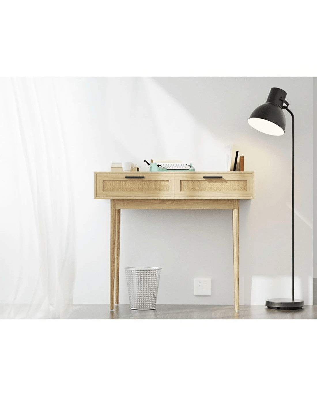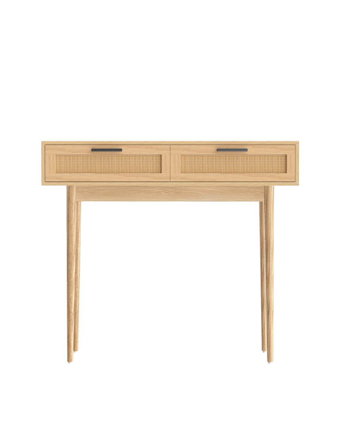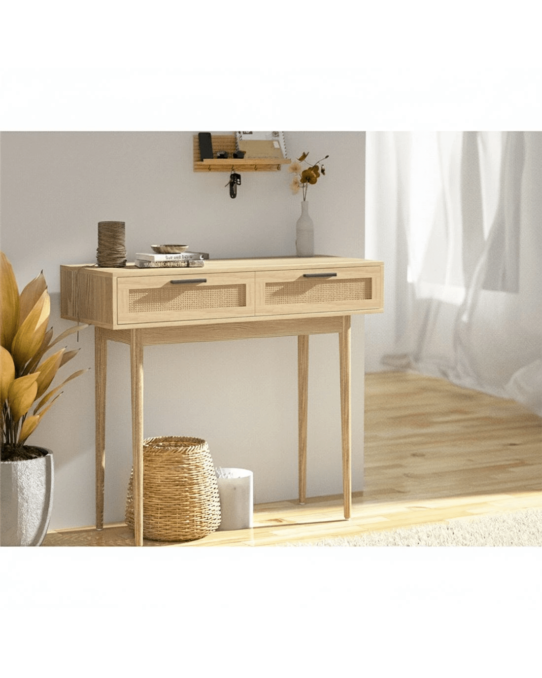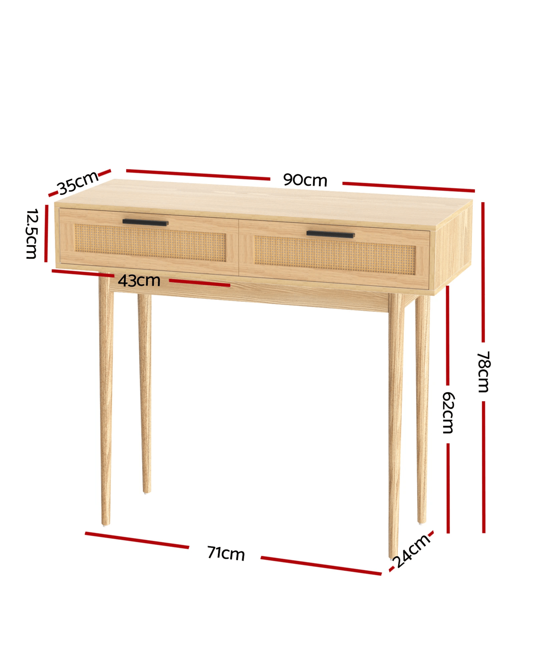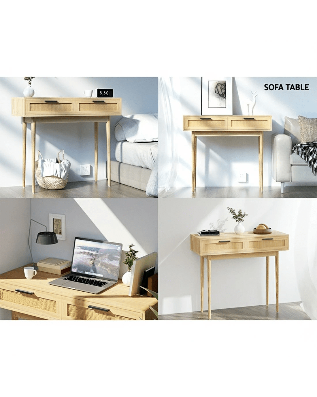 With its exotic chic looks and alluring presence, our Artiss Console Table is the perfect entry piece to welcome your visitors with style and panache. Crafted from 15mm thick particle board with paper veneer finish and solid eucalyptus wood legs, this console table is well proportioned and durable in every aspect. Two generous-sized drawers with real rattan fronts and sleek handles provide ample storage space for your home essentials and knick-knacks, while the wide tabletop lets you display your favourite collectibles, memorabilia or anything of your fancy in resplendent style. Be creative with your décor, for this exceptional furniture is more than just a hallway stunner. Our console table would be at home anywhere in your domicile.