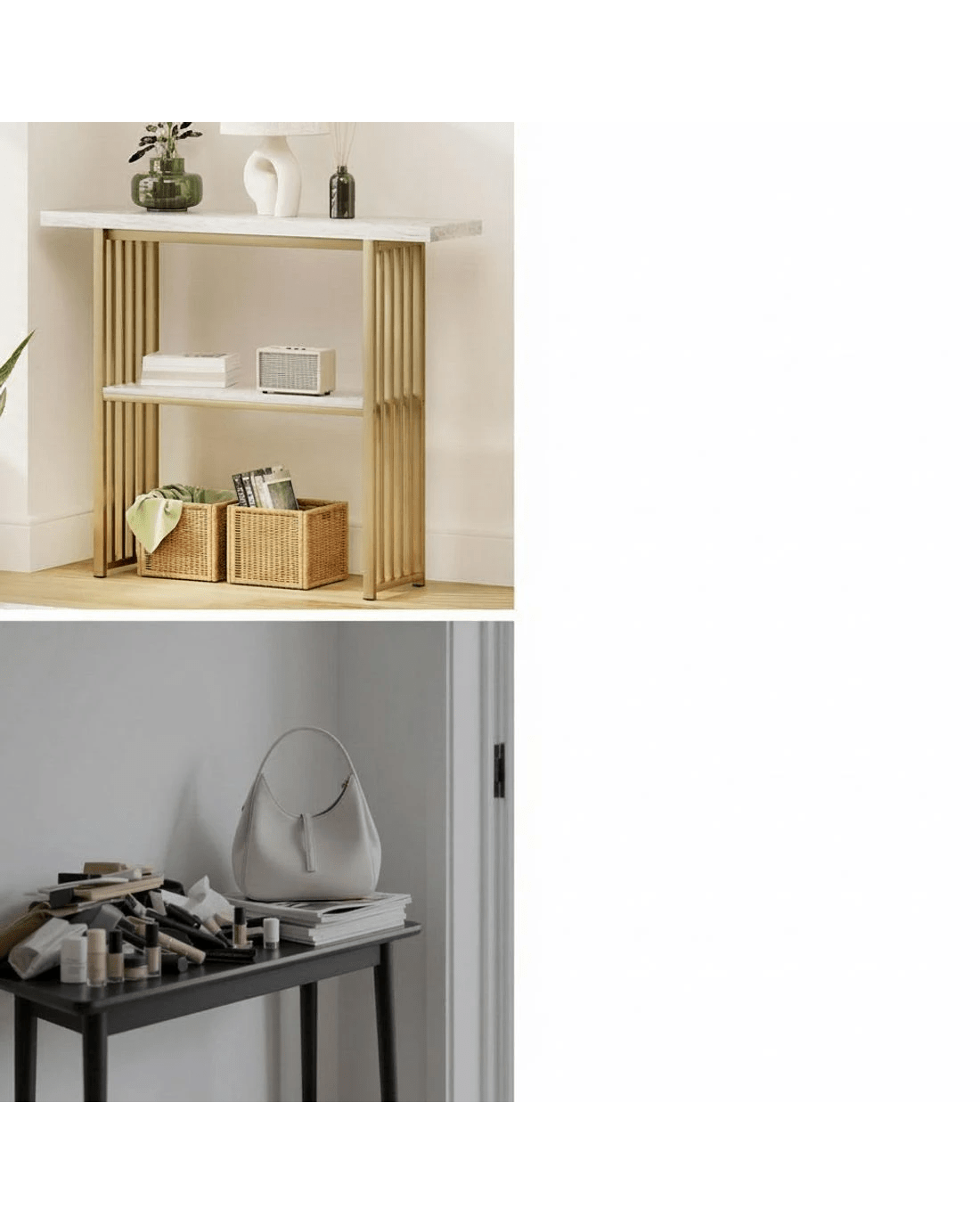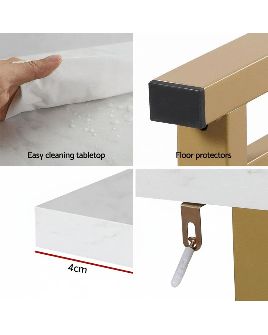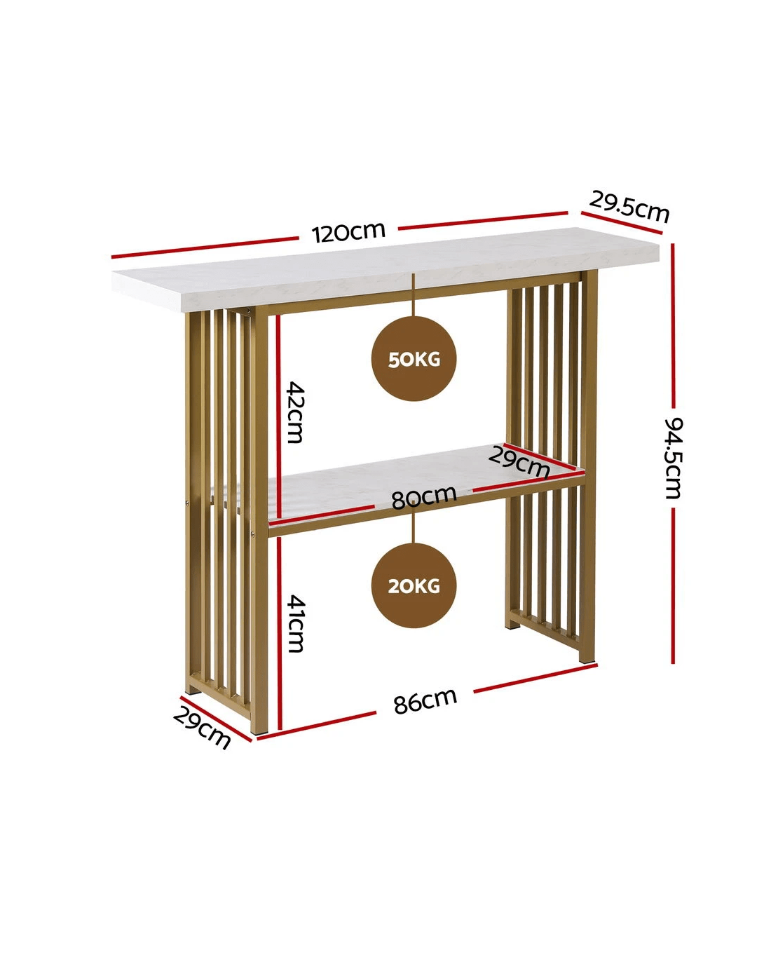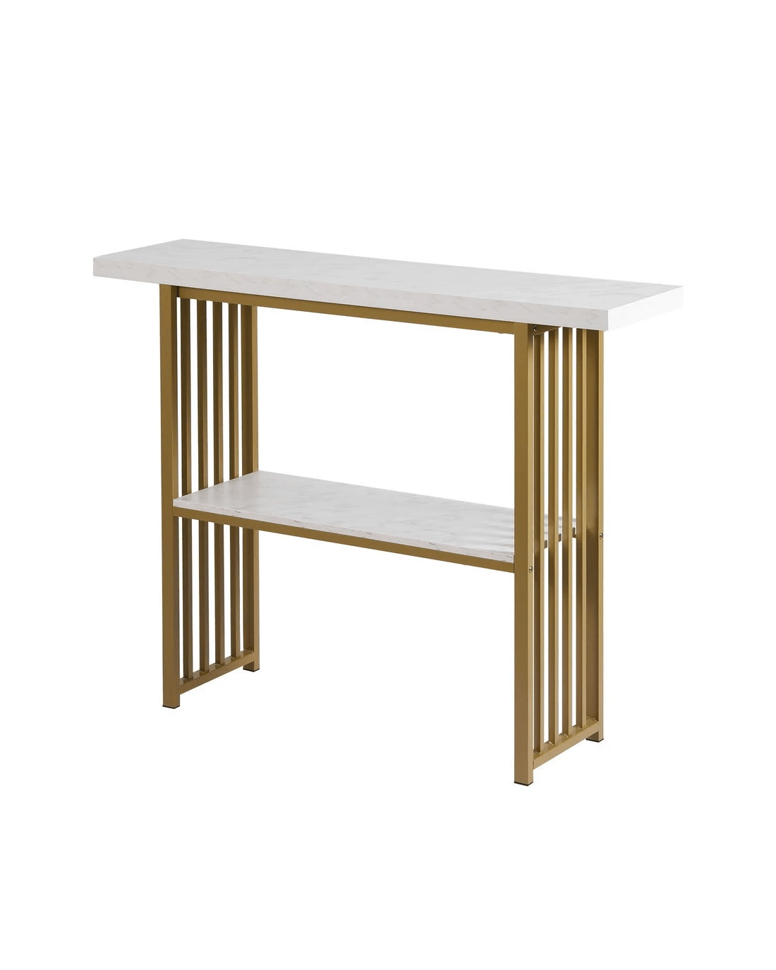 This Artiss console table combines practicality with modern aesthetics. The 40mm thickened E1 particle board tabletop features realistic faux marble finishing, paired with a robust powder-coated metal gold base. Anti-toppling device ensure stability on various floor types, while non-slip foot pads protect your flooring. Two-tier design offers ample storage space. With its versatile design, this hallway table suits entryways, living rooms or office spaces. The easy-clean surface maintains its premium look through daily use. Its adaptable styling seamlessly complements both contemporary and traditional interiors.