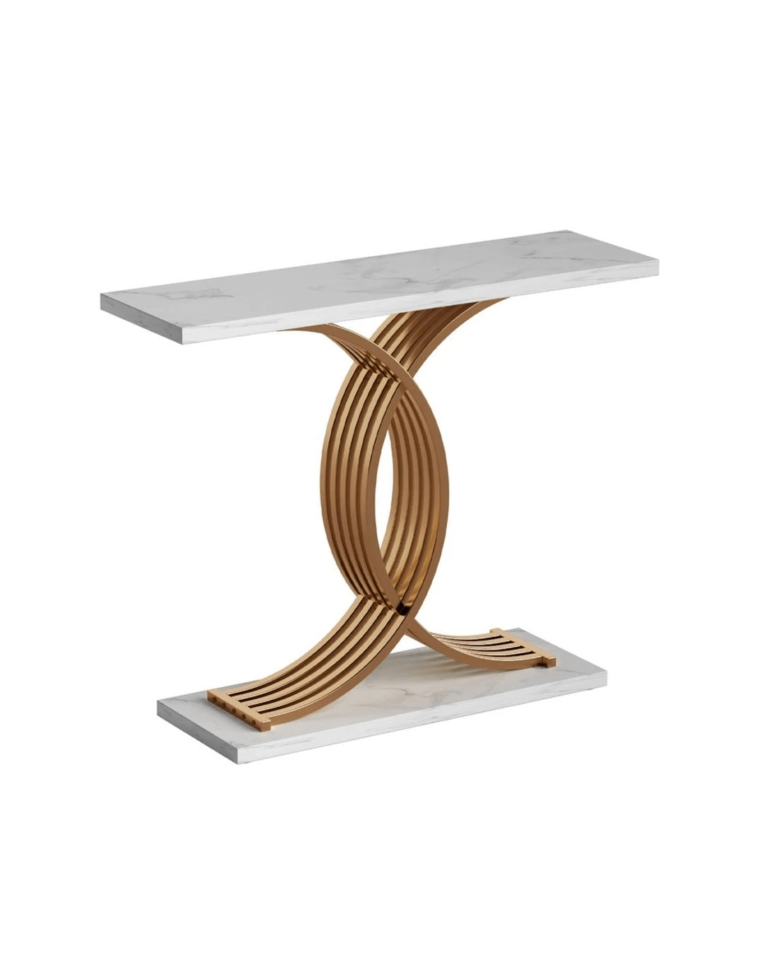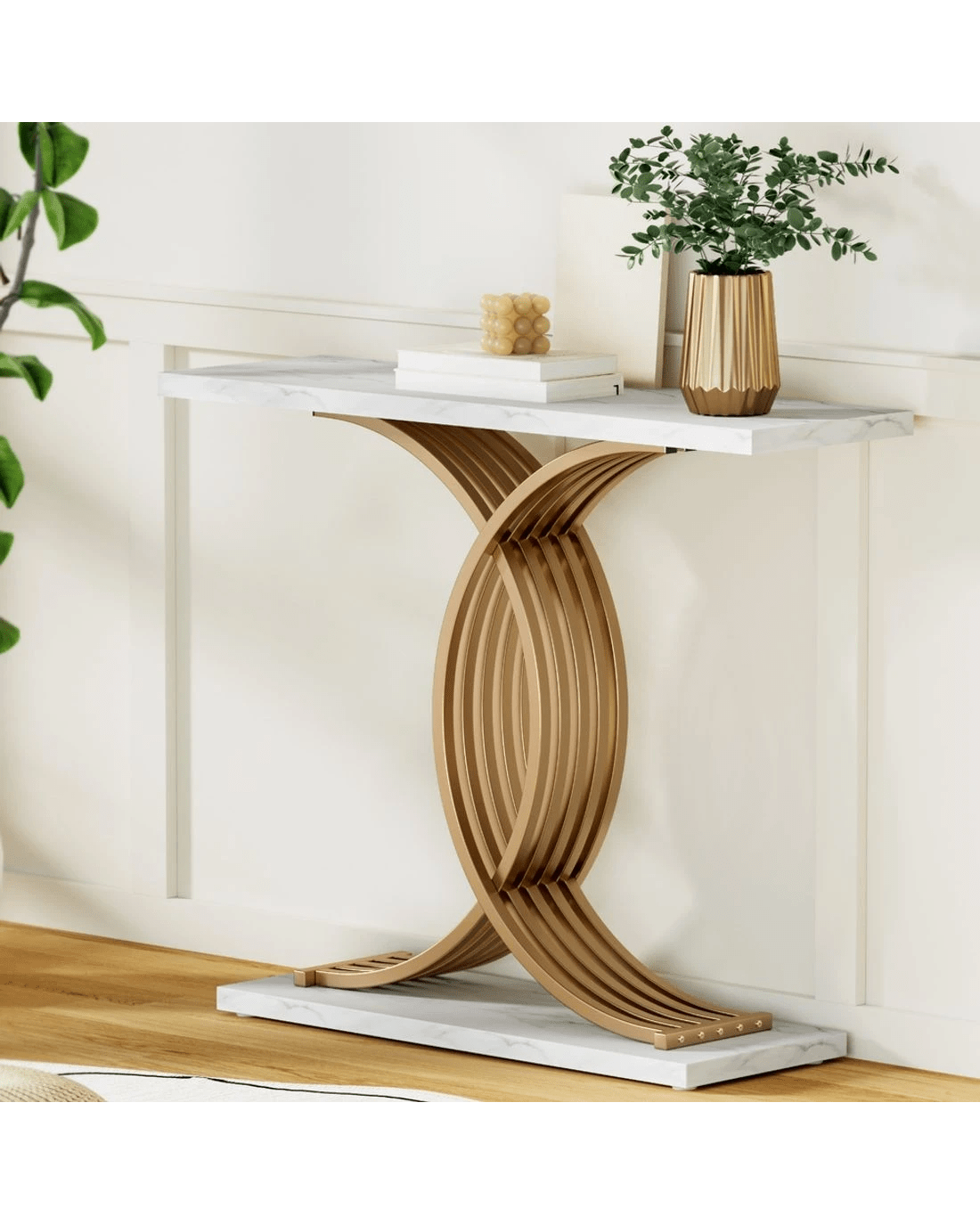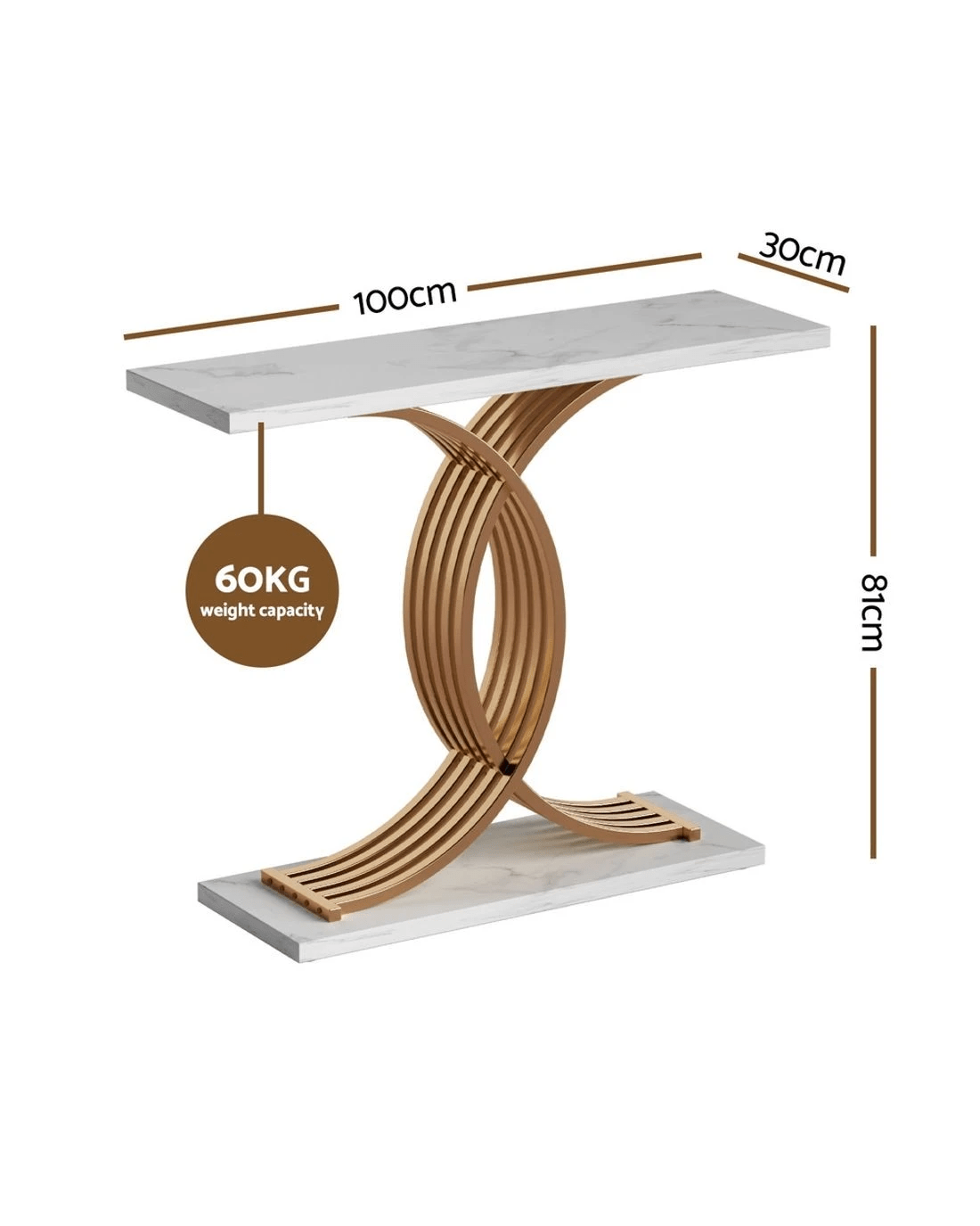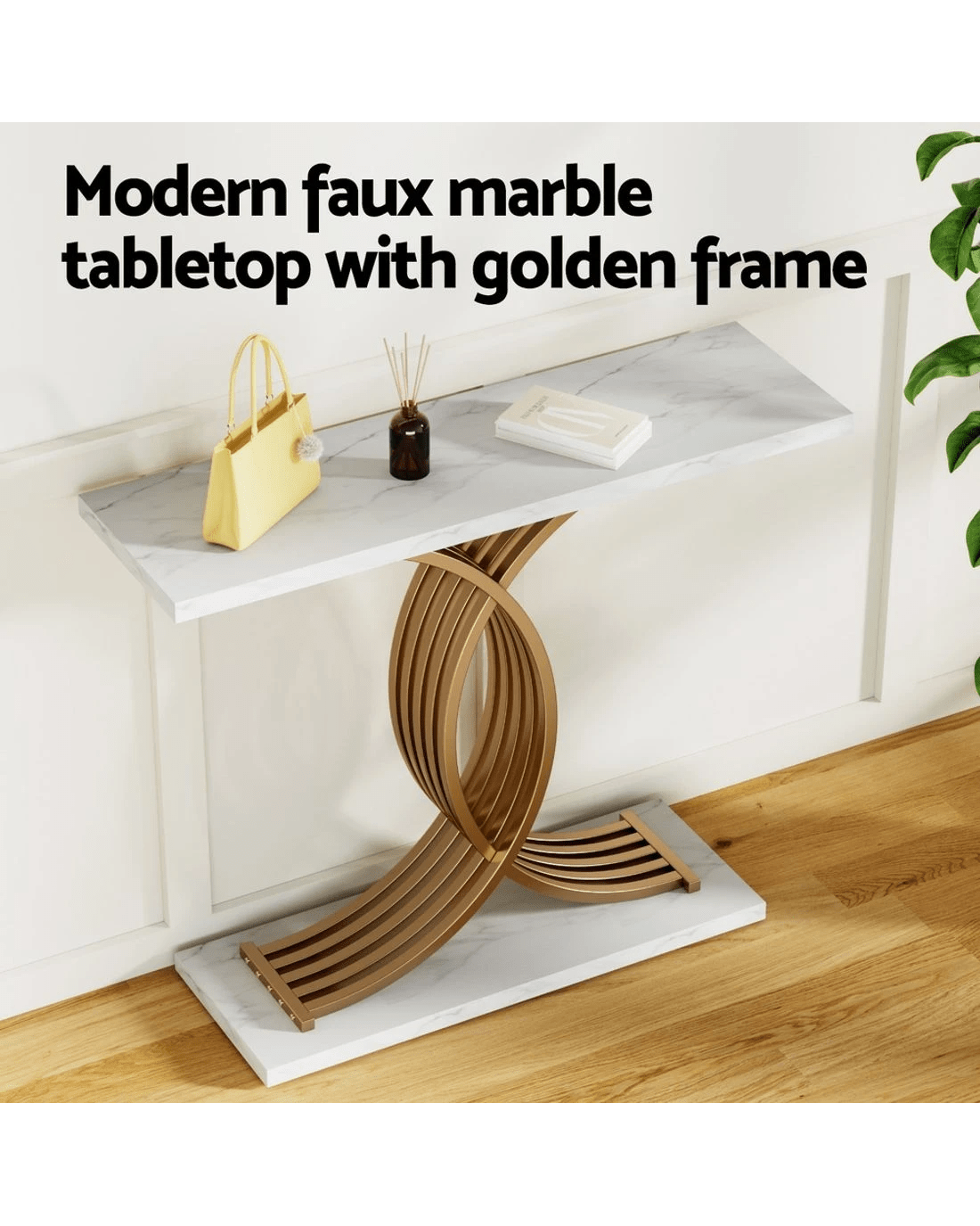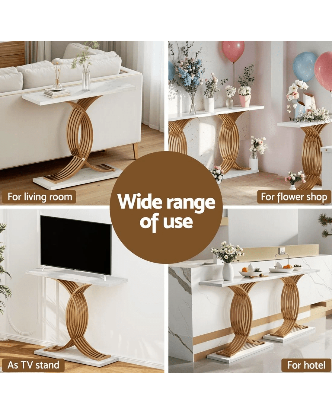 This Artiss console table combines practicality with modern aesthetics. The 30mm thickened E1 MDF tabletop features realistic faux marble finishing, paired with a robust powder-coated metal gold base. Anti-toppling device ensure stability on various floor types, while non-slip foot pads protect your flooring. With its versatile design, this hallway table suits entryways, living rooms or office spaces. The easy-clean surface maintains its premium look through daily use. Its adaptable styling seamlessly complements both contemporary and traditional interiors.