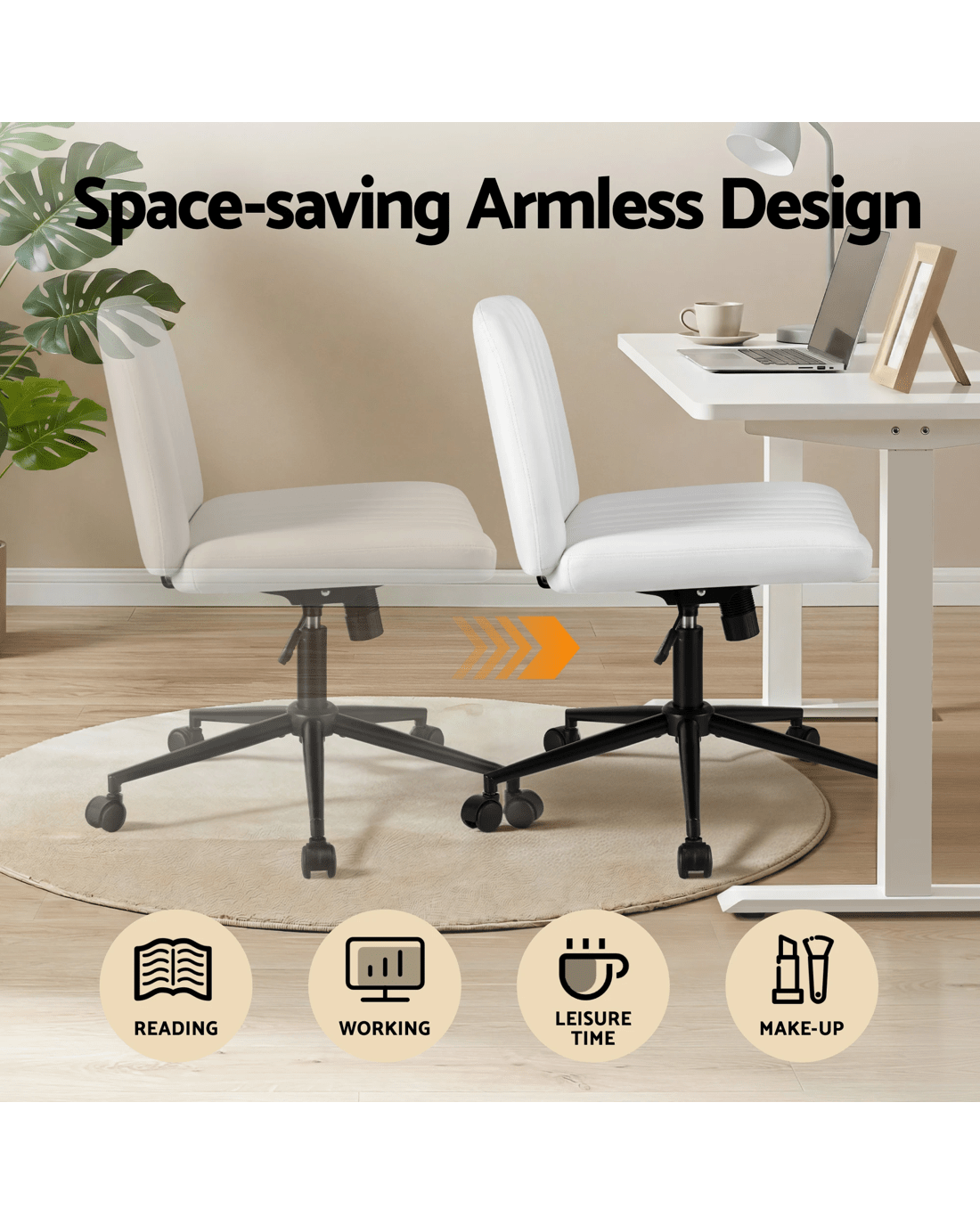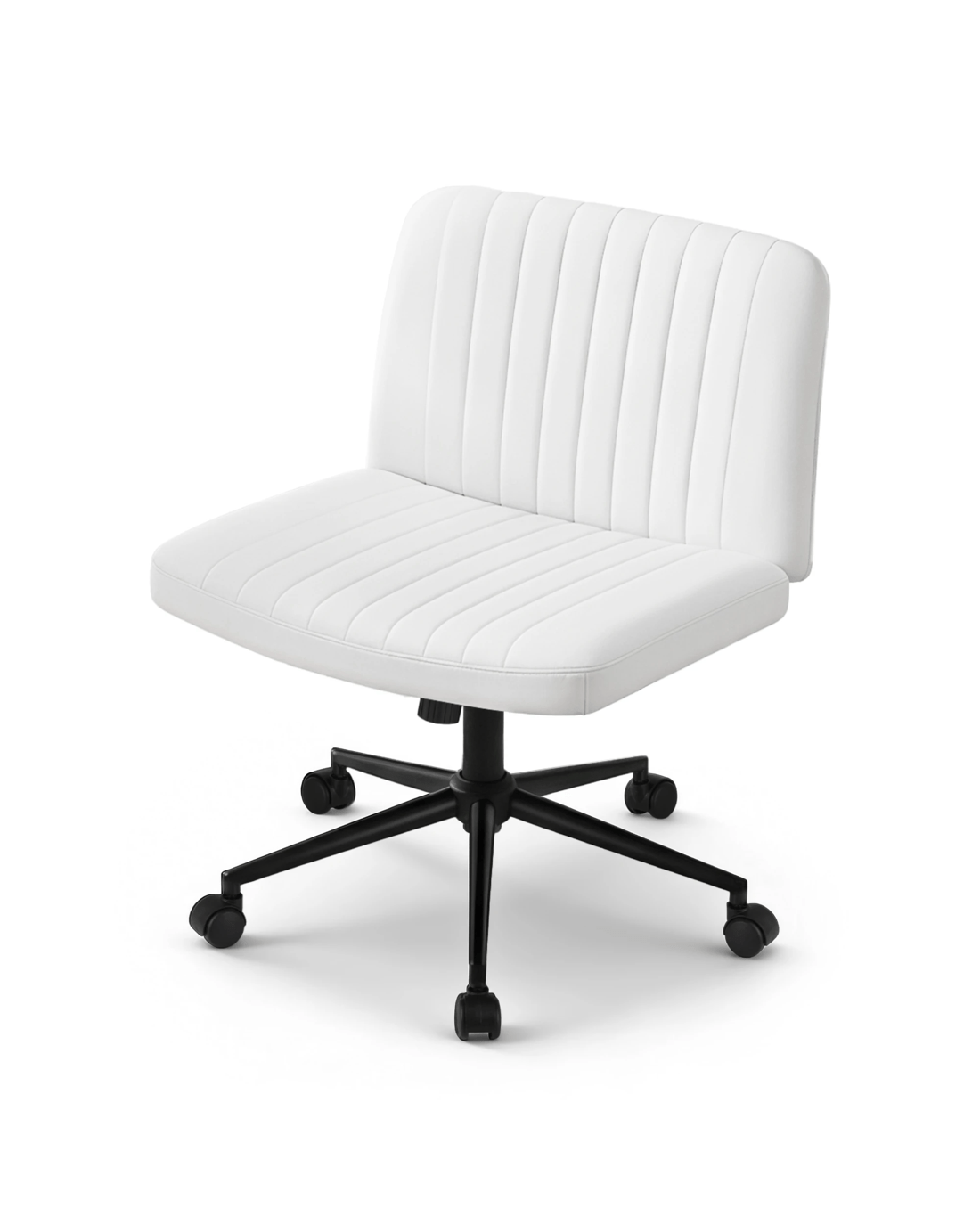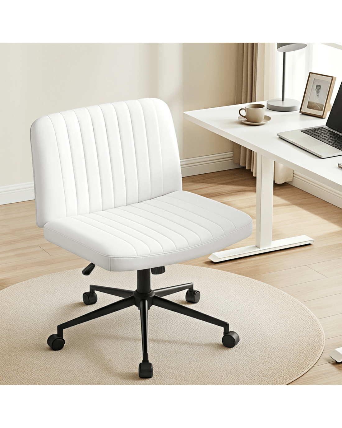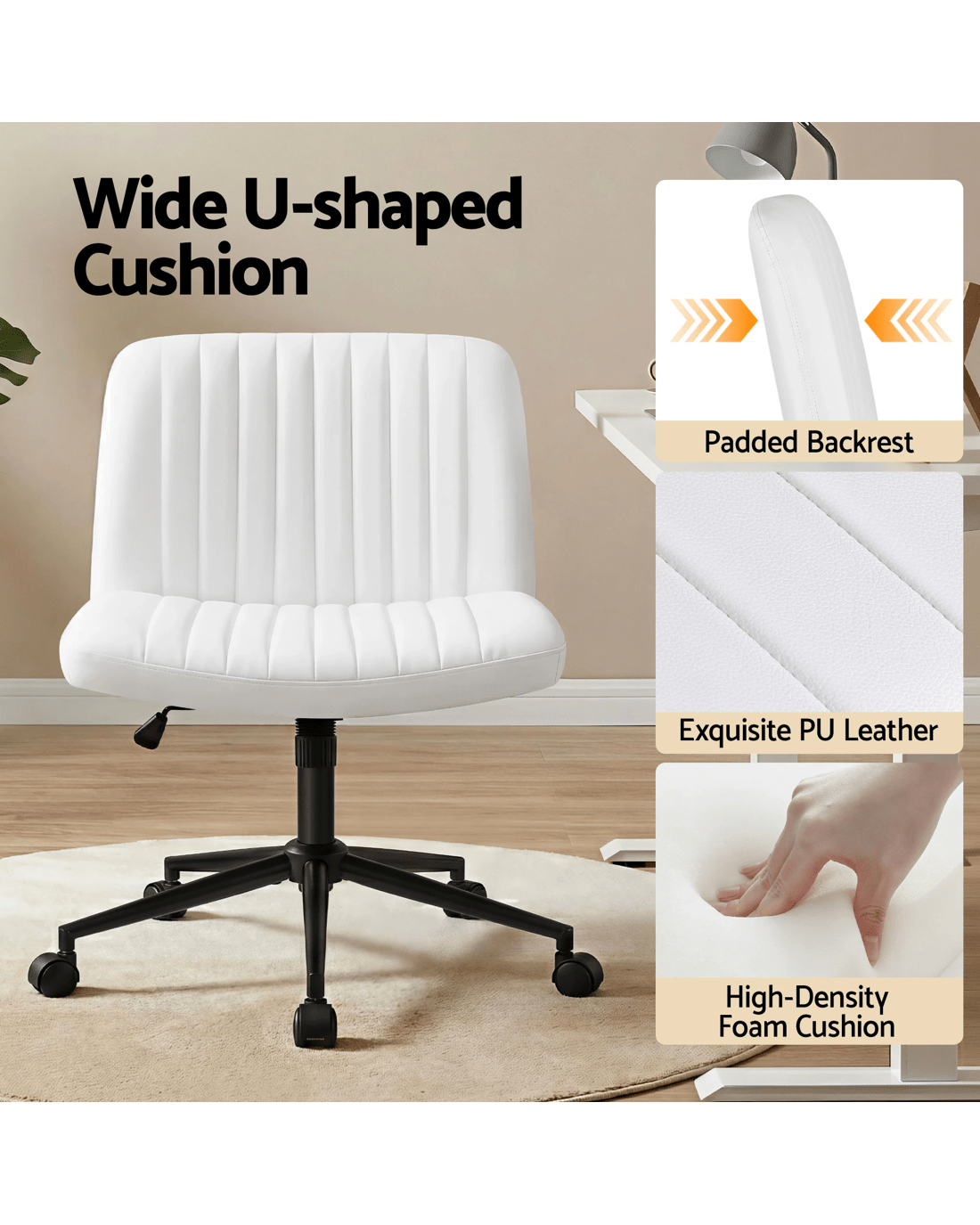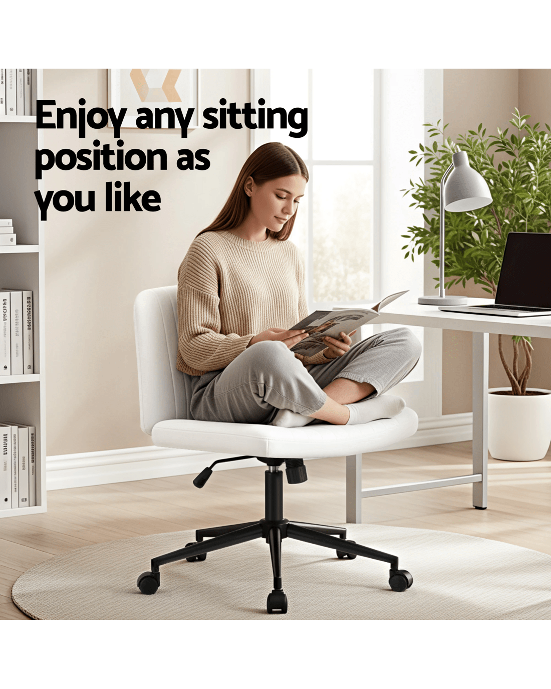 Experience comfort, flexibility, and style with this modern office chair. The wide backrest and U-shaped high-density foam seat let you sit cross-legged or upright, providing support for long work, study, or leisure sessions. Its armless design saves space and allows freedom of movement, while durable wheels and a strong metal frame make it stable and long-lasting. With 10cm adjustable height and full 360° swivel, this versatile chair adapts to any desk, vanity, or workspace effortlessly. Easy to assemble and stylishly modern, it's the perfect choice for home offices, bedrooms, or multi-functional spaces.