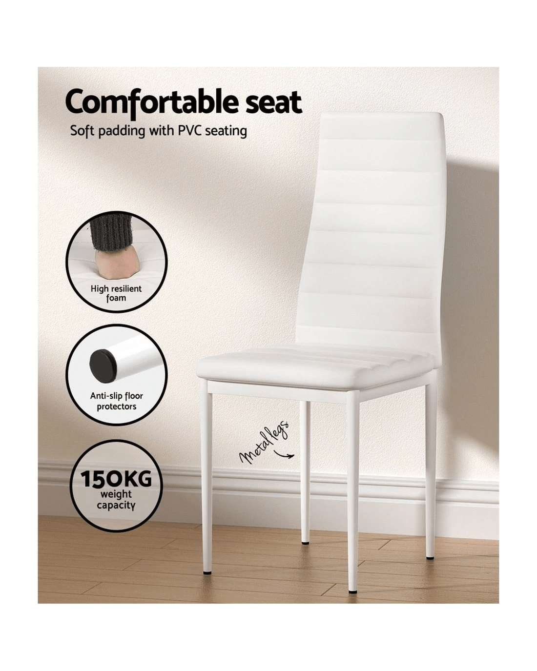 Are you after a dining set flaunting stylish and modern design and one that is versatile? You'll love our Artiss dining set. Made with the highest quality craftsmanship, our beautiful and modernistic Artiss dining set will effortlessly enrich your dining room décor and serve the purpose. Whatever style your home interior reflects, it will blend seamlessly in your space and match your preferred décor. Have a space concern? You can choose from our four-seater or six-seater dining set. Plus, the rectangular-shaped table is of the right size and perfect for your home. Our dining table features 18mm thick natural grain finish MDF top with powder-coated metal tube frame legs. And the dining chairs boast matt finish PVC seats with high resilient foam padding for comfort. It also has anti-slip floor protectors to prevent slipping or floor getting scratched. The dining set is water and wear resistant and comes with durable steel fixings and reinforced installation hardware accessories. This set is easy to maintain and assemble. Bring home our Artiss dining set. It makes an ultimate addition and adds a timeless appeal to your space.