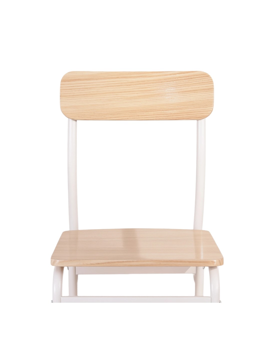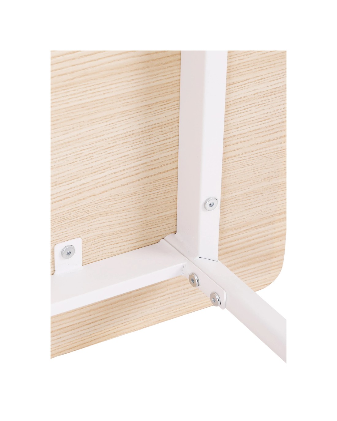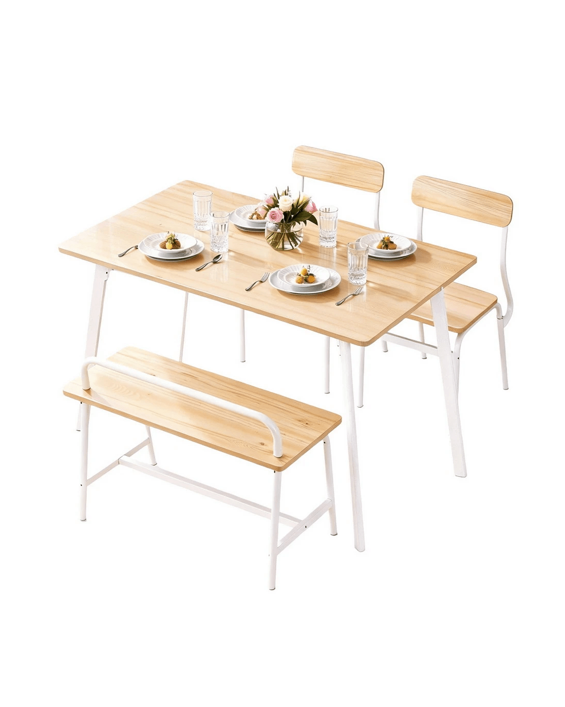 The set includes a spacious tabletop, two stable chairs, and a comfortable bench, making it easy to seat four people. The aesthetic features a fresh, modern combination of a Natural wood-look surface and a clean White powder-coated metal frame for that trendy Scandi or minimalist style.